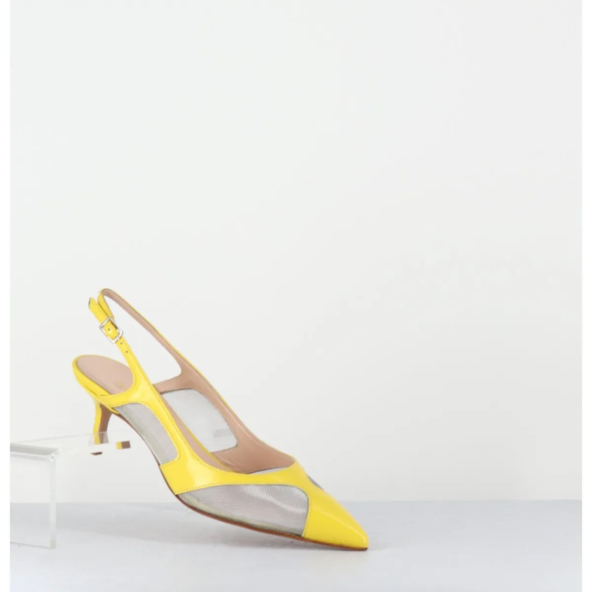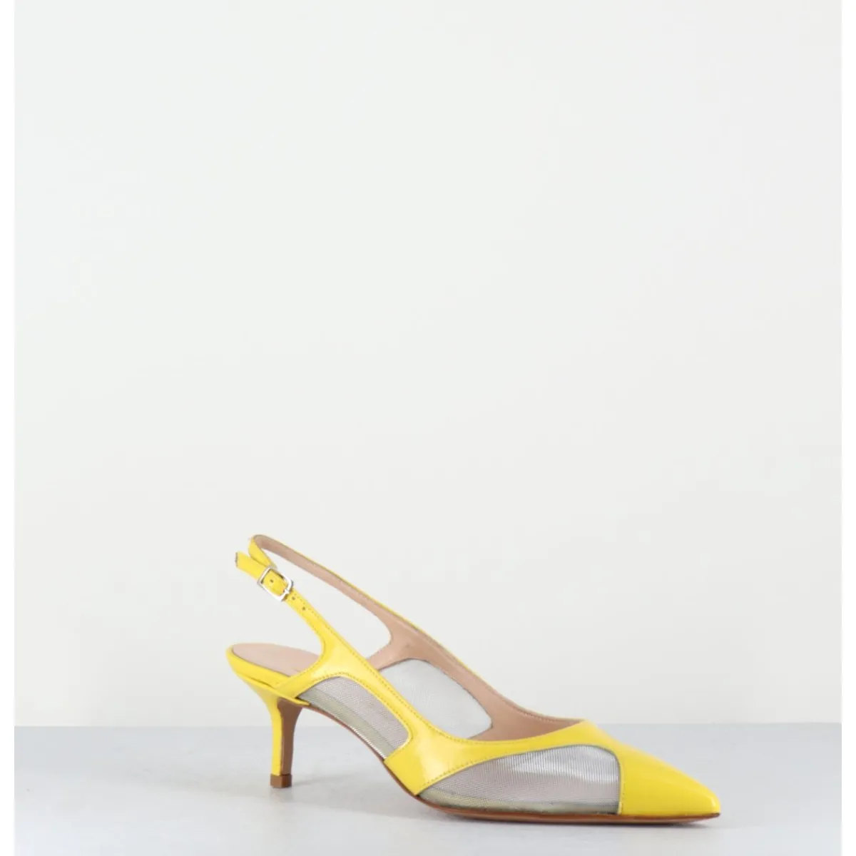 Escarpins slingback bout pointu, bride arrière réglable, cuir jaune et mesh métallisé argenté, montées sur un petit talon fin, mixte entre 90s & 60s