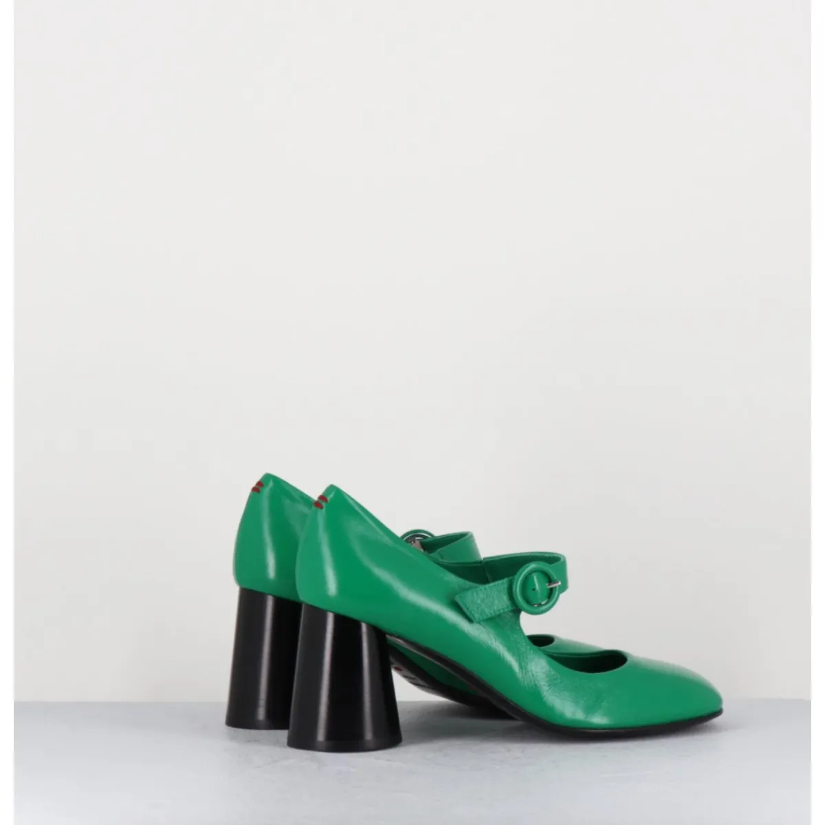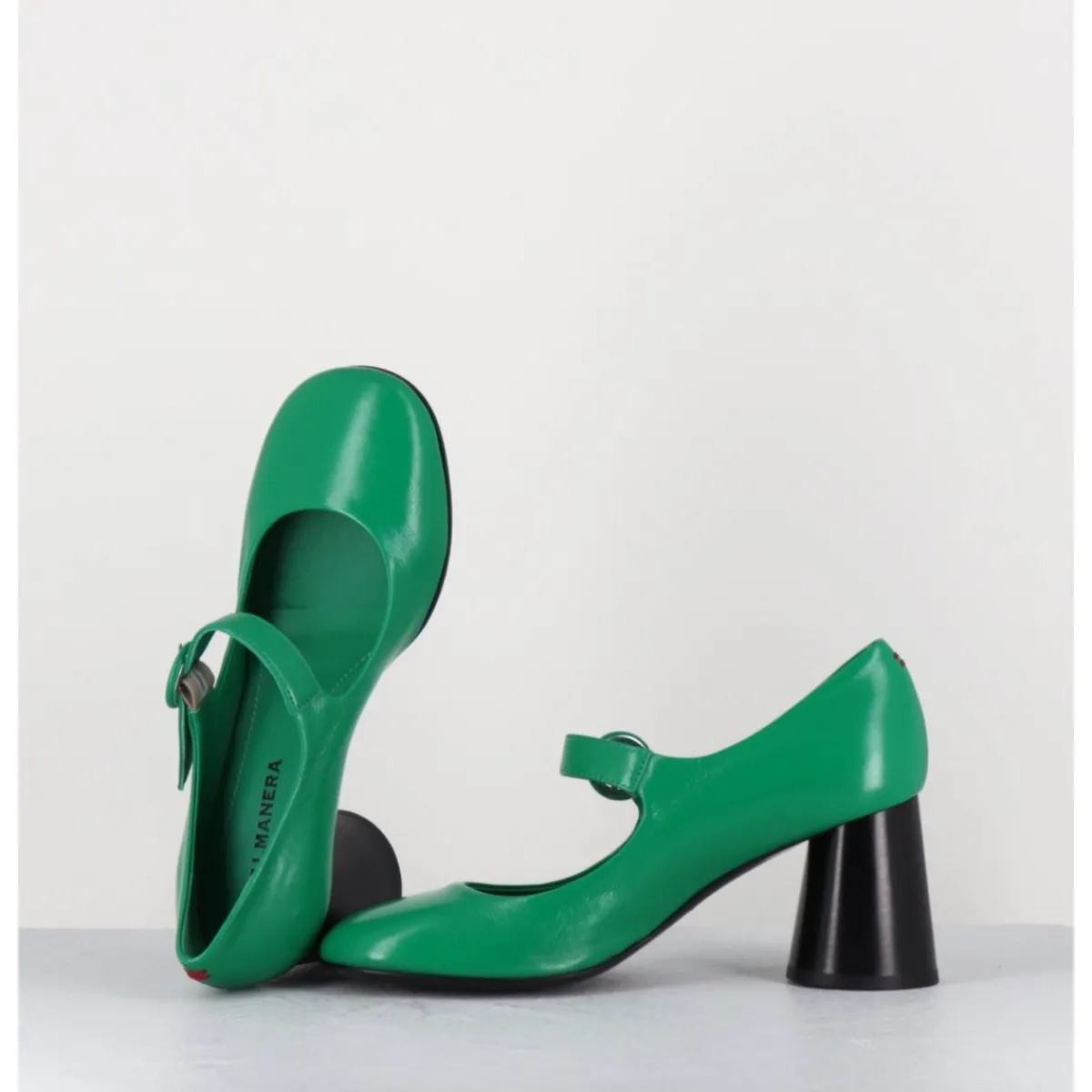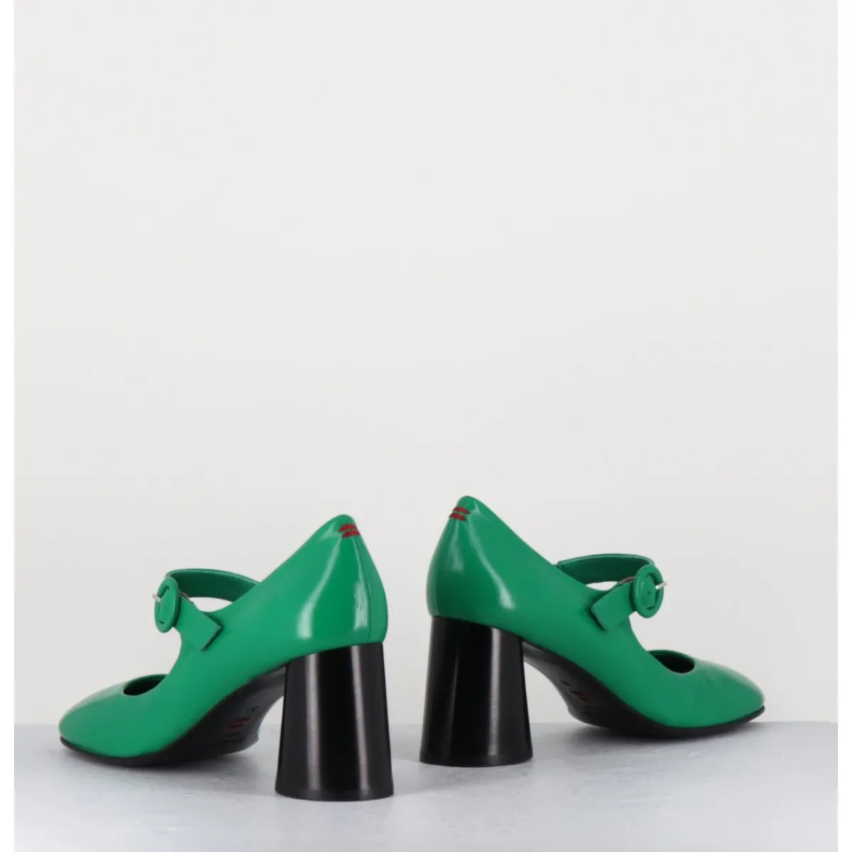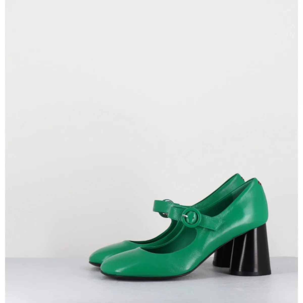 Babies à talon en cuir souple vert légèrement brillant, bout très rond, bride cheville réglable, couture signature de la maison sur le contrefort, montés sur un talon cylindrique évasé peint à la main en noir.