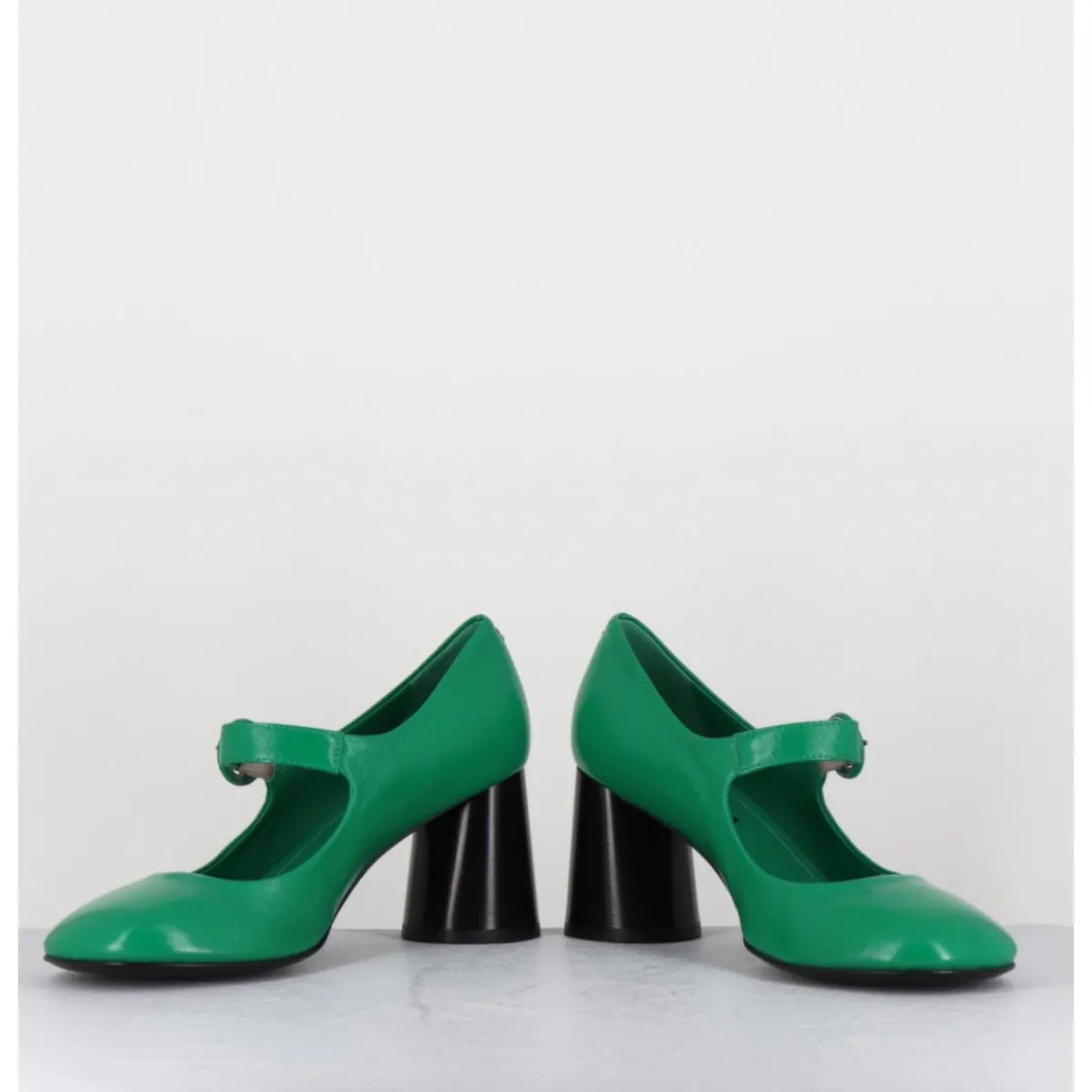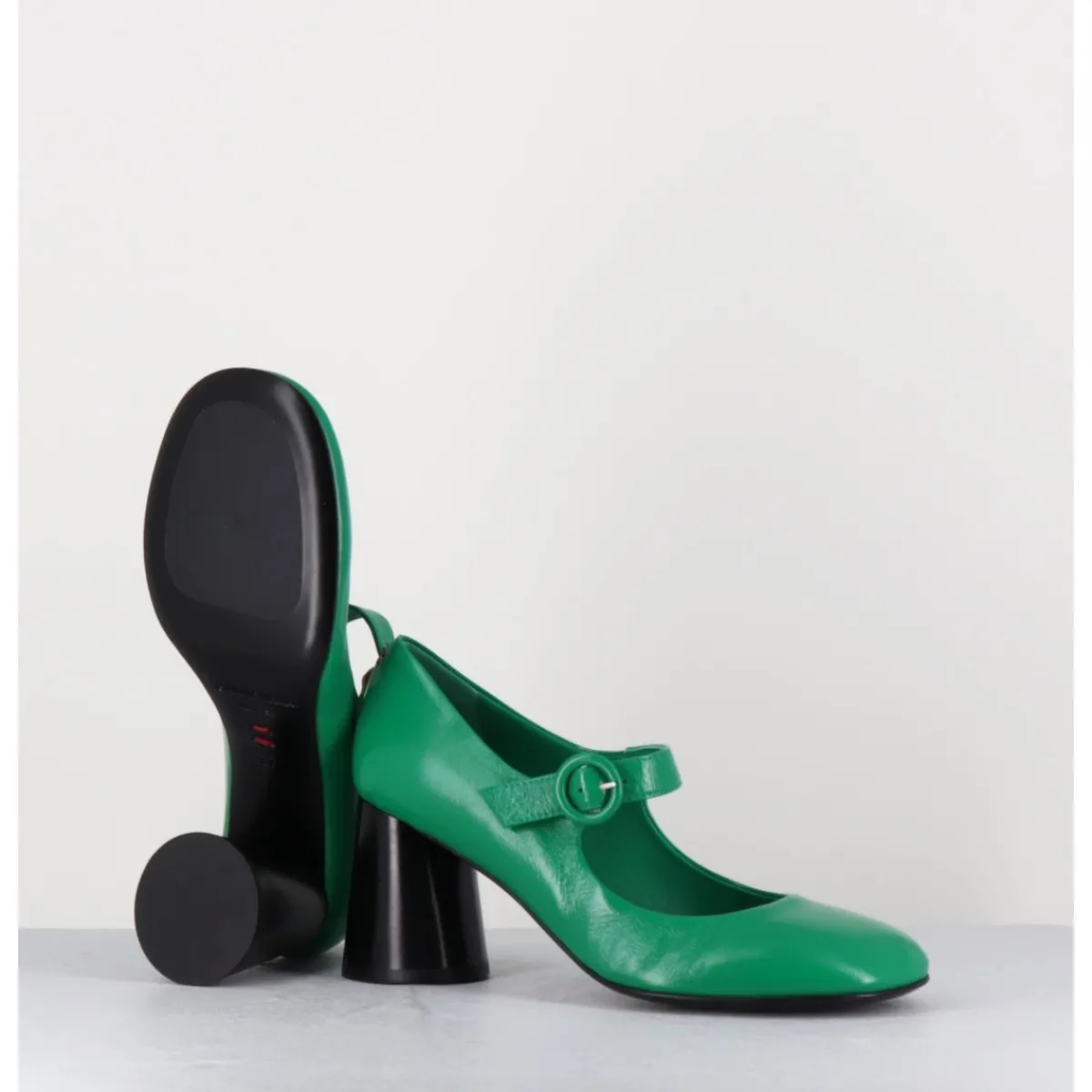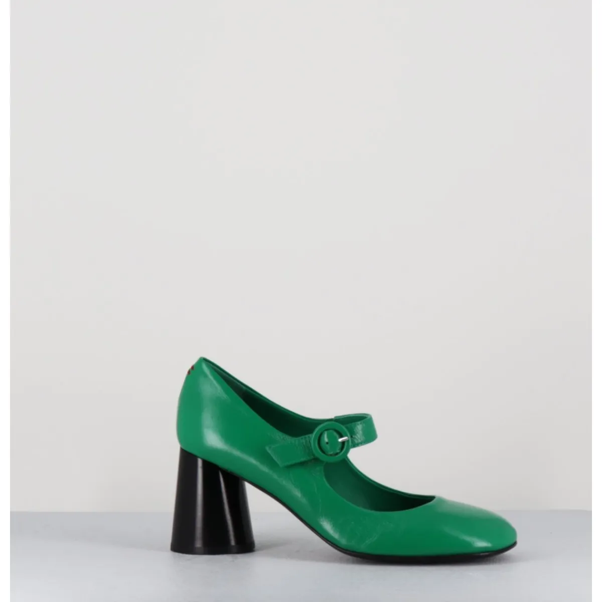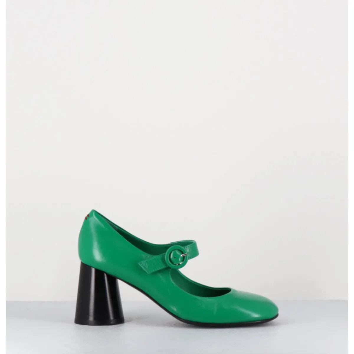 Babies à talon en cuir souple vert légèrement brillant, bout très rond, bride cheville réglable, couture signature de la maison sur le contrefort, montés sur un talon cylindrique évasé peint à la main en noir.