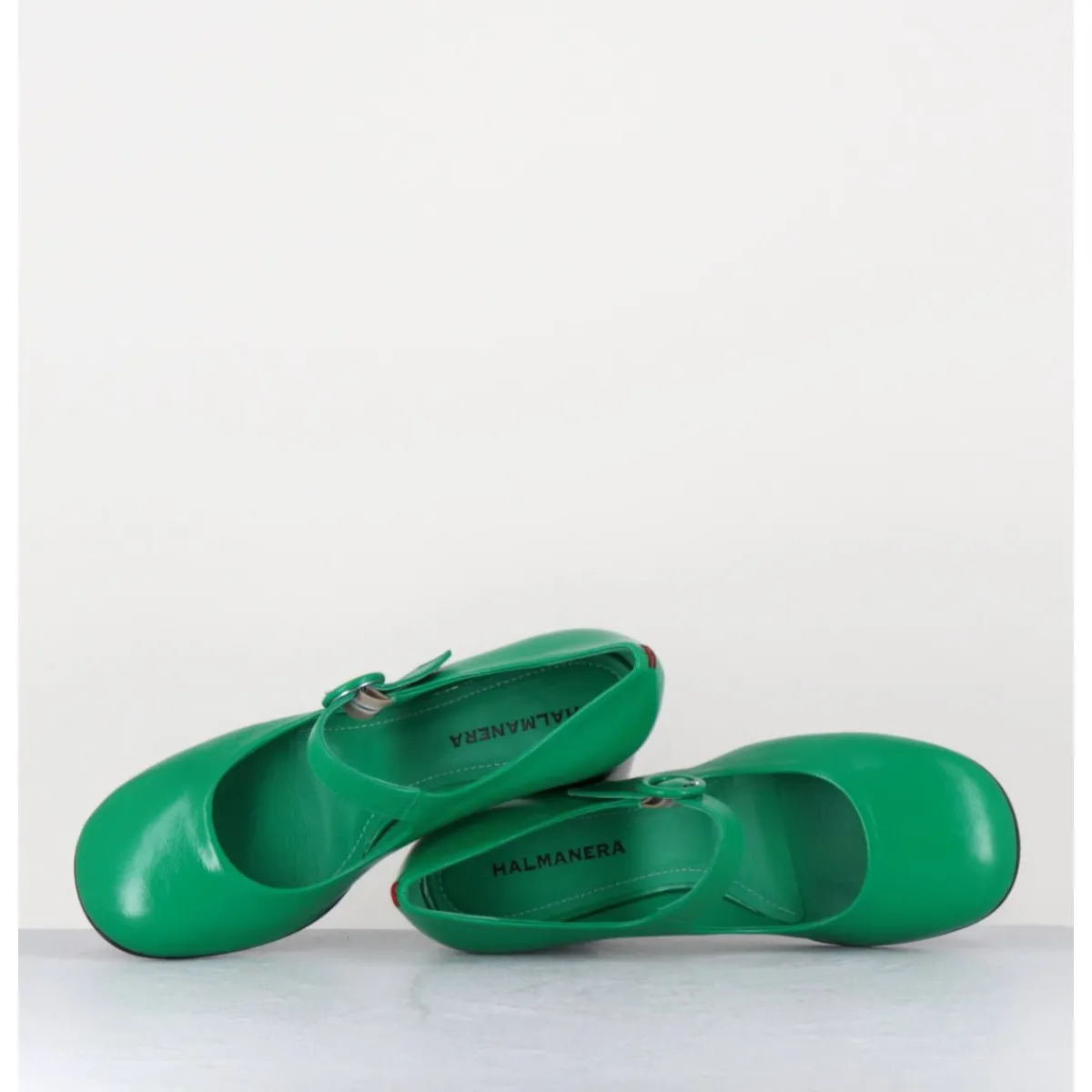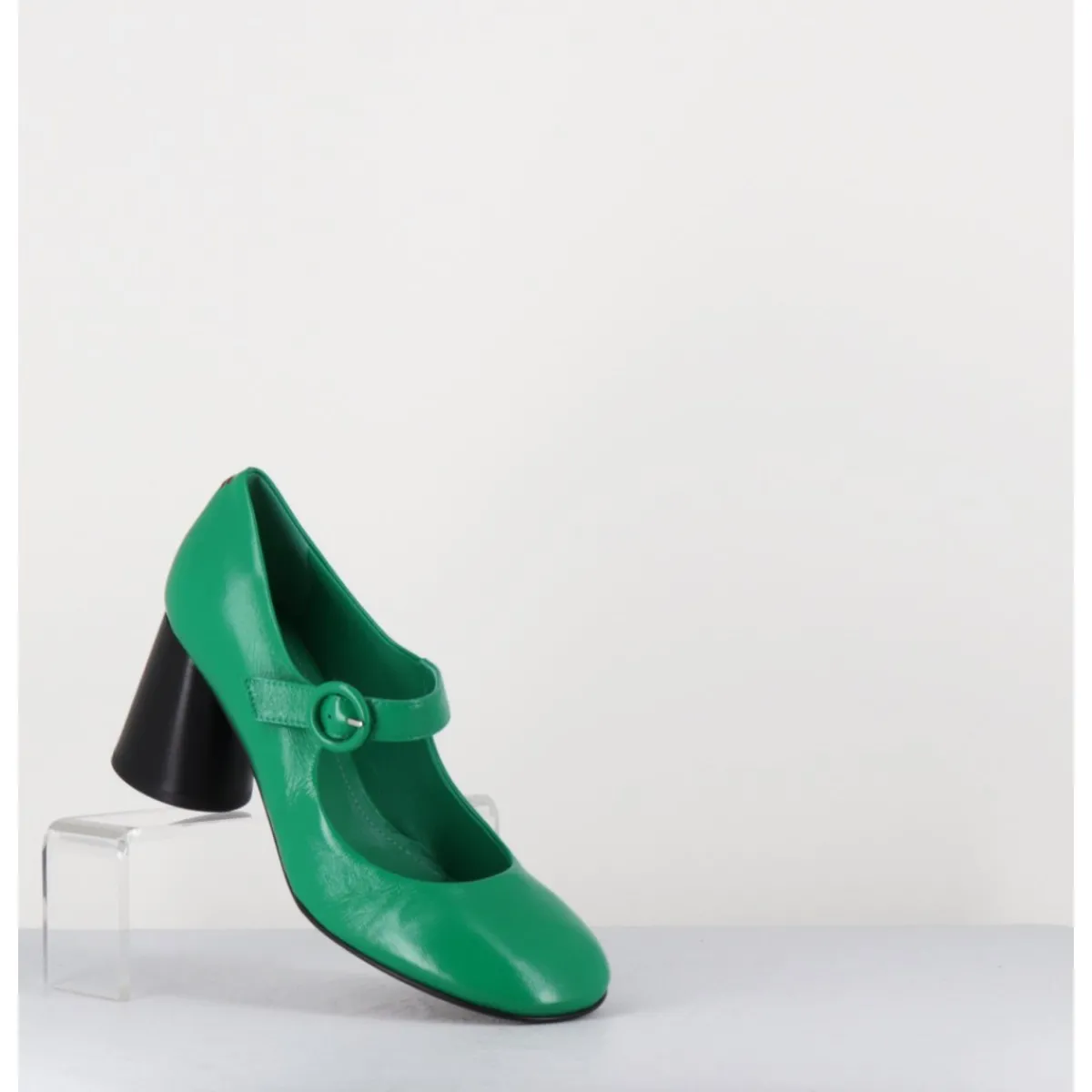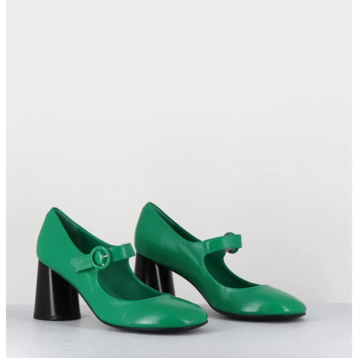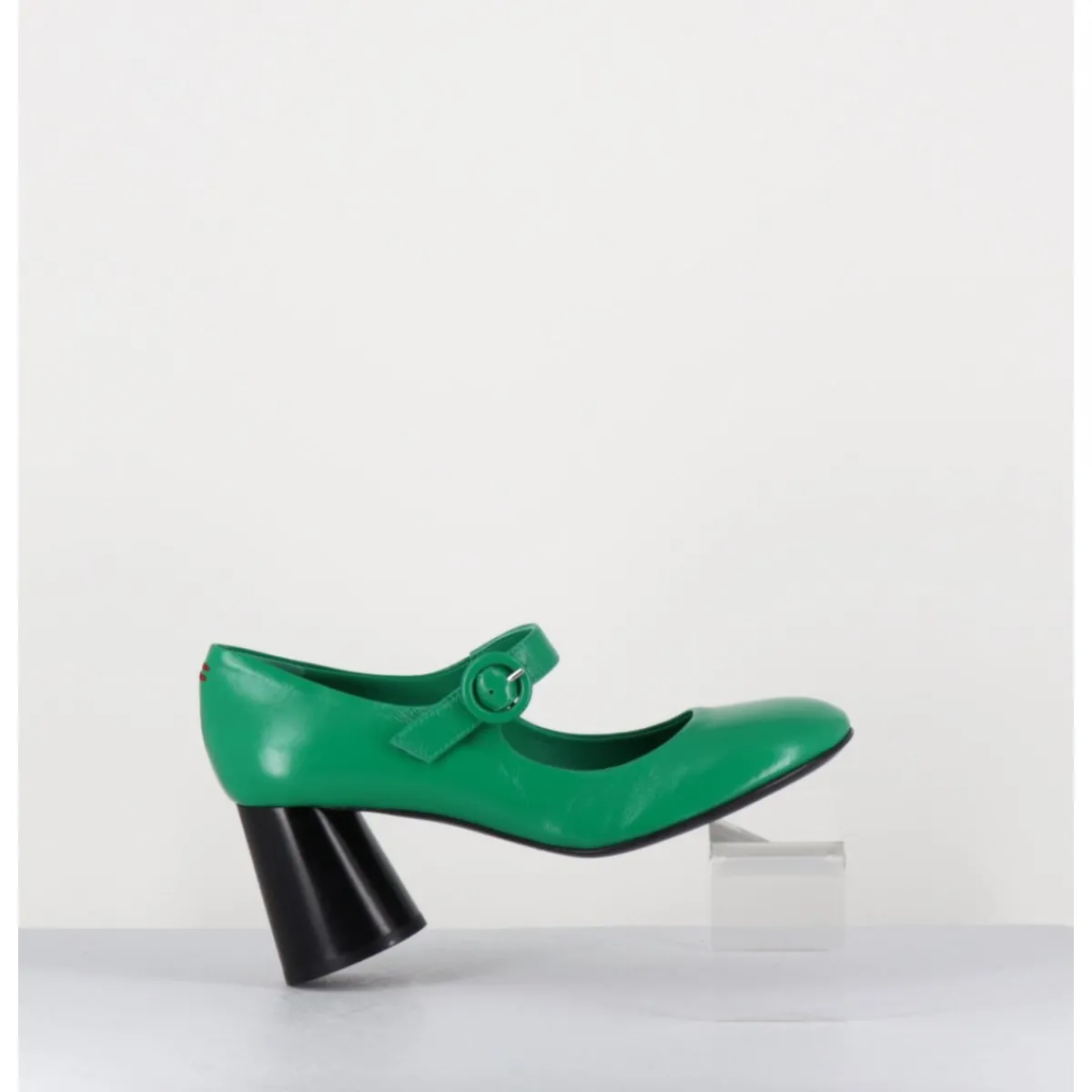 Babies à talon en cuir souple vert légèrement brillant, bout très rond, bride cheville réglable, couture signature de la maison sur le contrefort, montés sur un talon cylindrique évasé peint à la main en noir.
