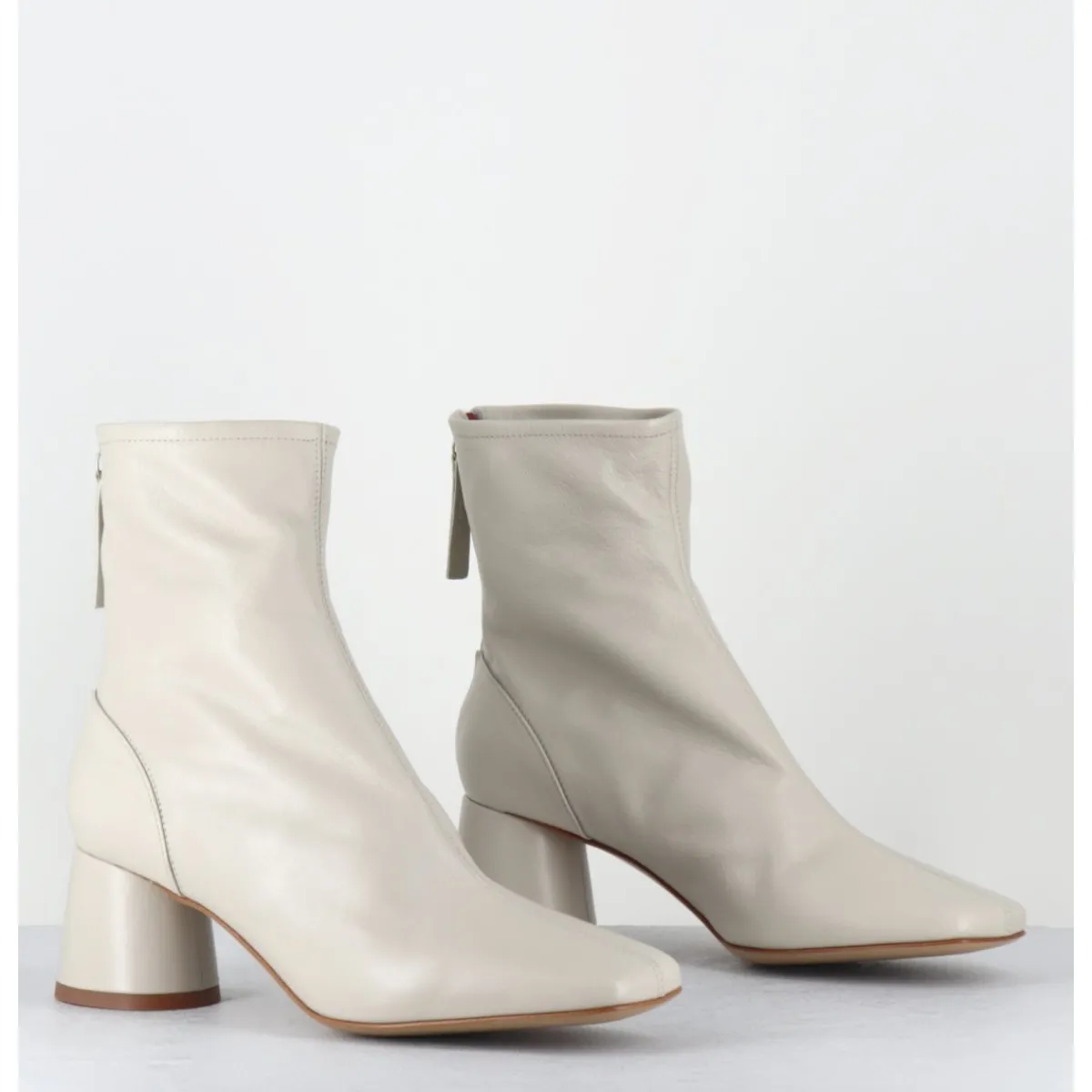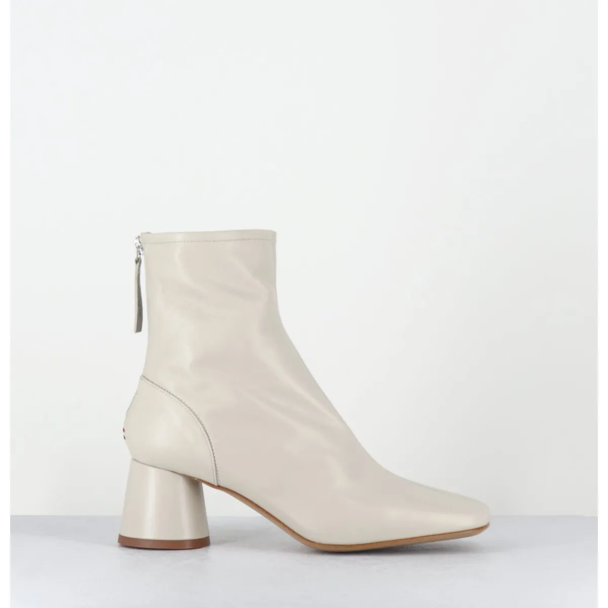 Boots en cuir souple non doublé blanc cassé, bout carré doux au look rétro, zip arrière, montés sur un petit talon cylindrique