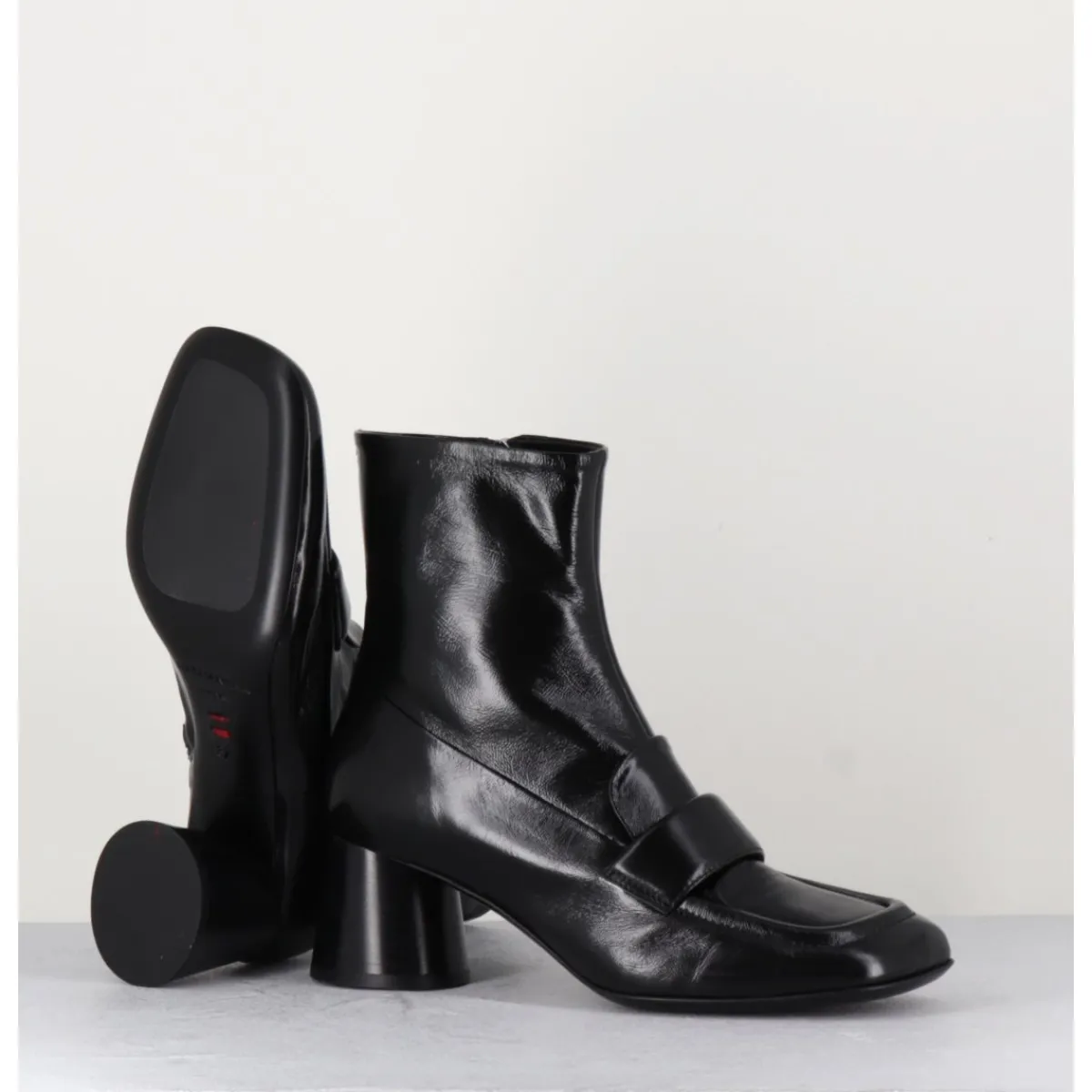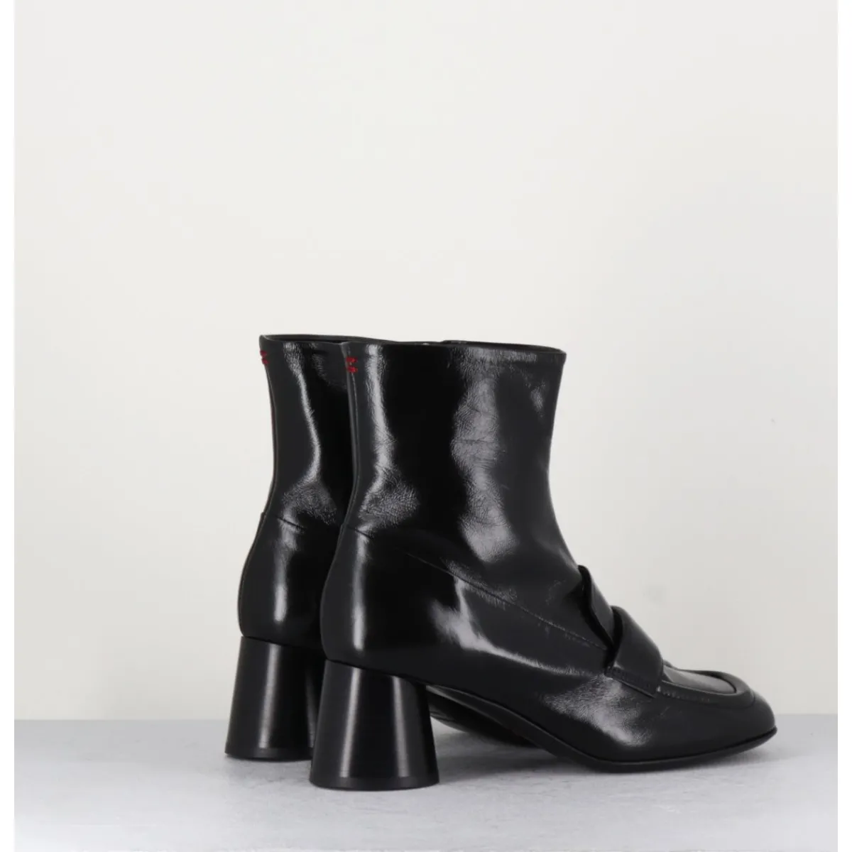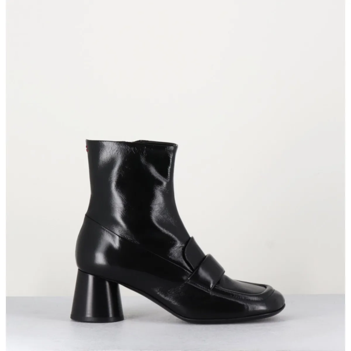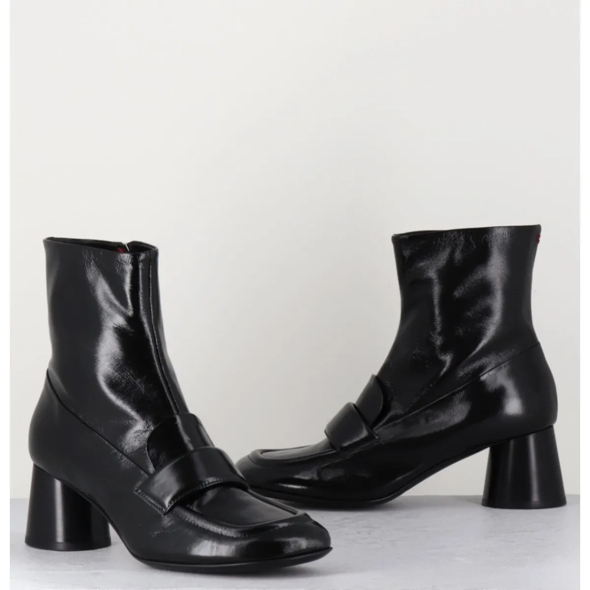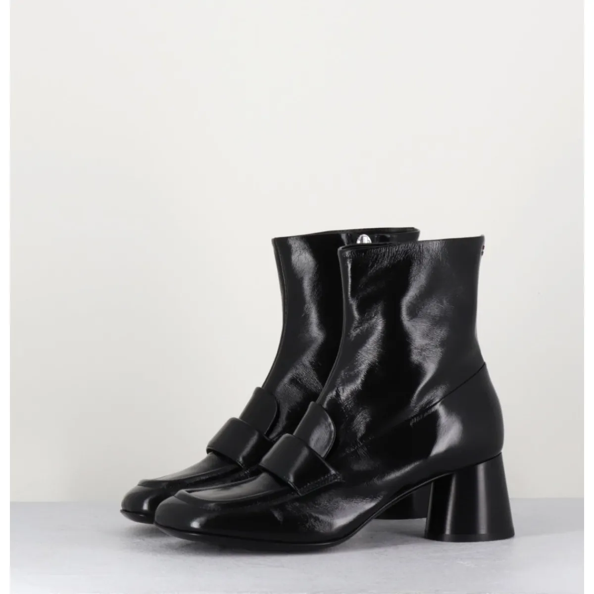 Boots mocassins à talon en cuir noir brillant, bout carré, zip intérieur, couture signature de la maison sur le contrefort, montés sur un talon cylindrique évasé.