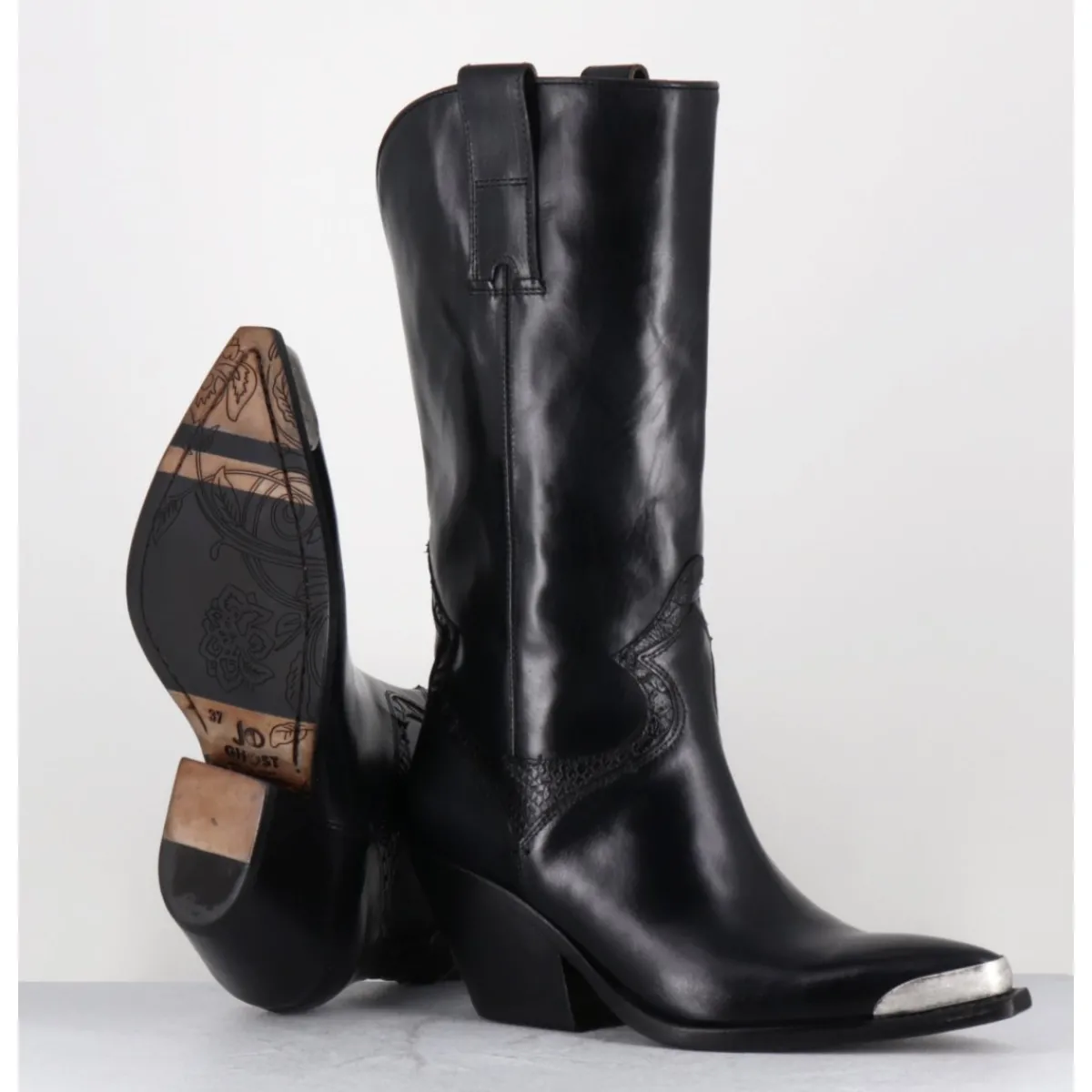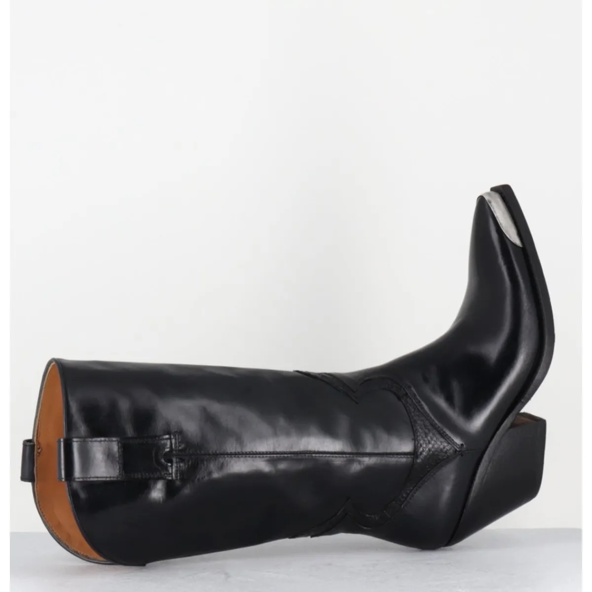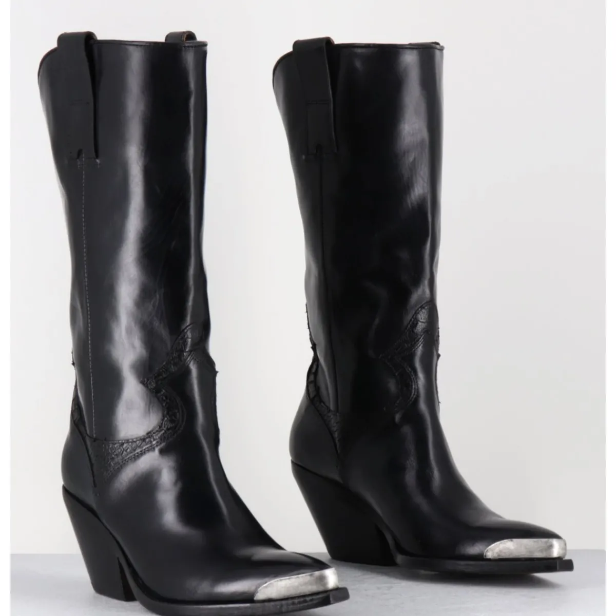Bottes santiags en cuir lisse noir, pointe ornée d’un empiècement en métal argent, détails traditionnels en serpent, montées sur un talon biseauté