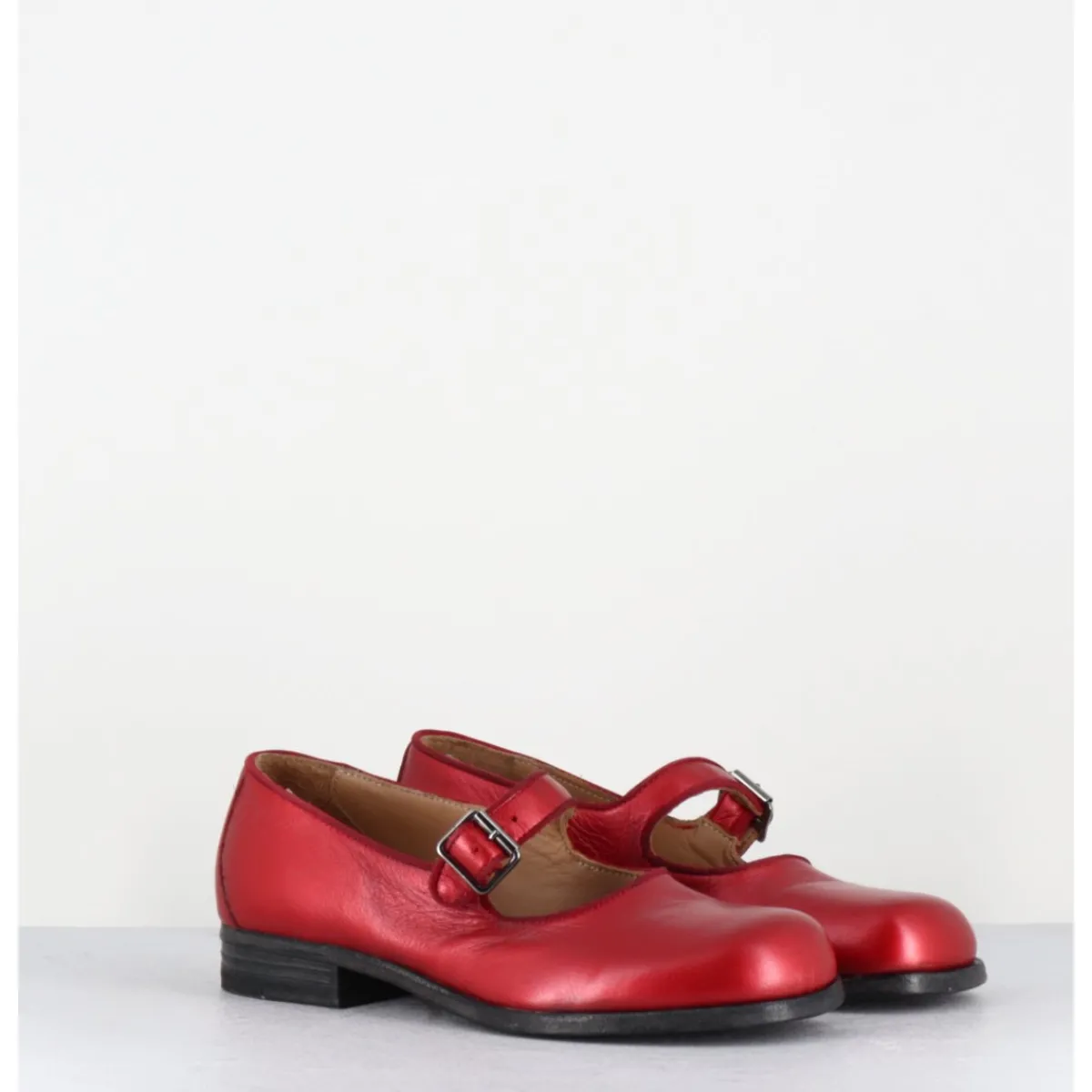 Chaussures babies en cuir souple métallisé rouge, bride réglable, ligne pure esprit avant-garde, bout arrondi, montées sur une semelle cousue et lavée à la main pour un effet usé