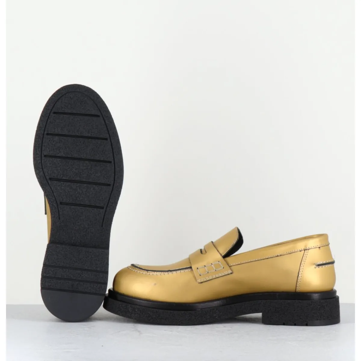 Mocassins en cuir métallisé doré mat, semelle épaisse en gomme légère