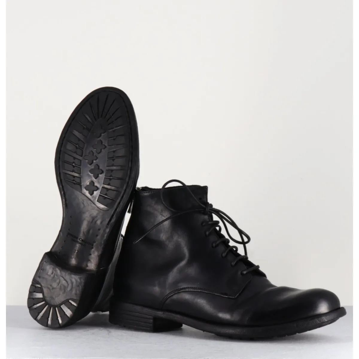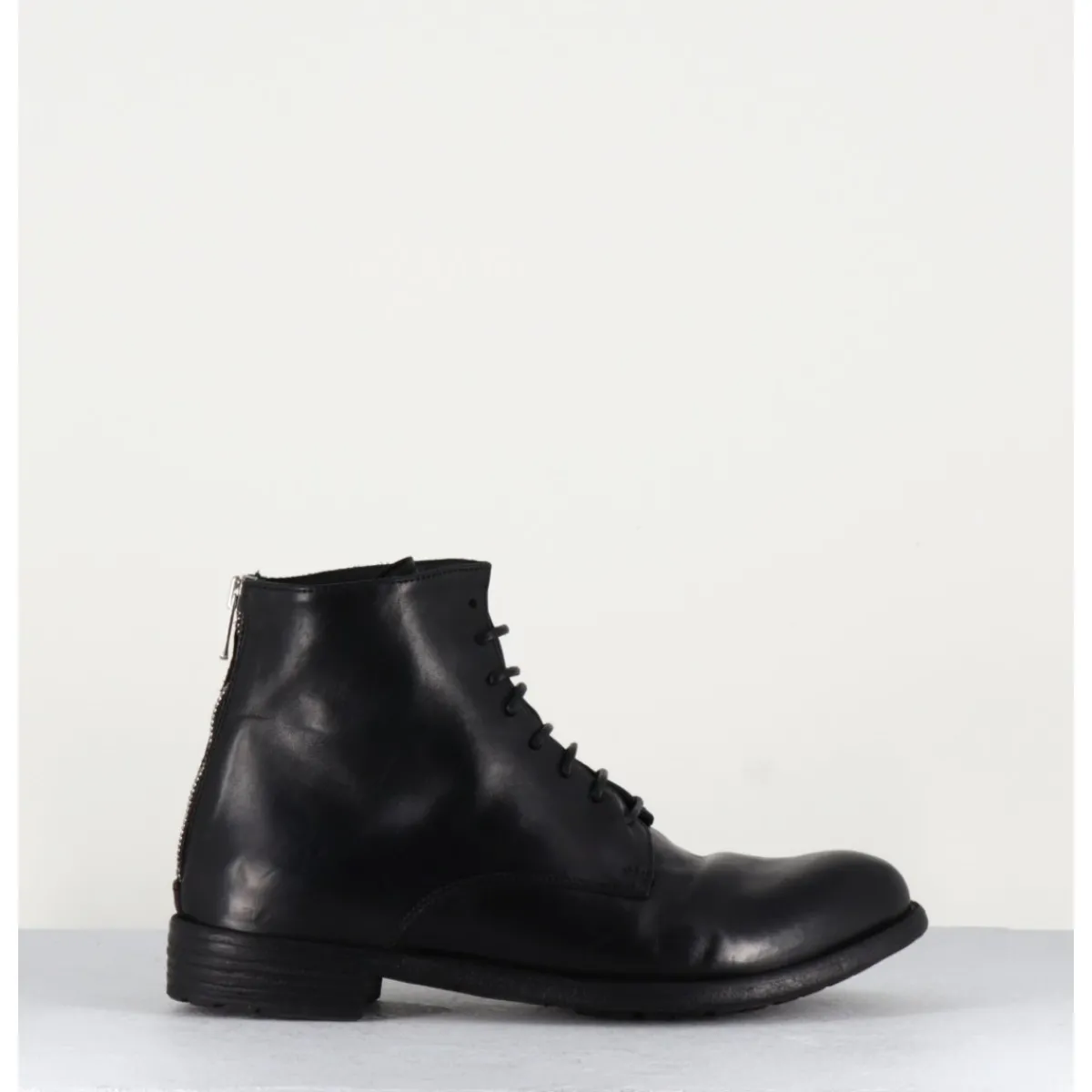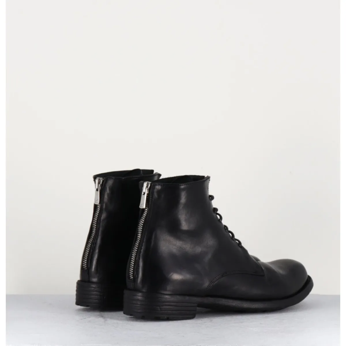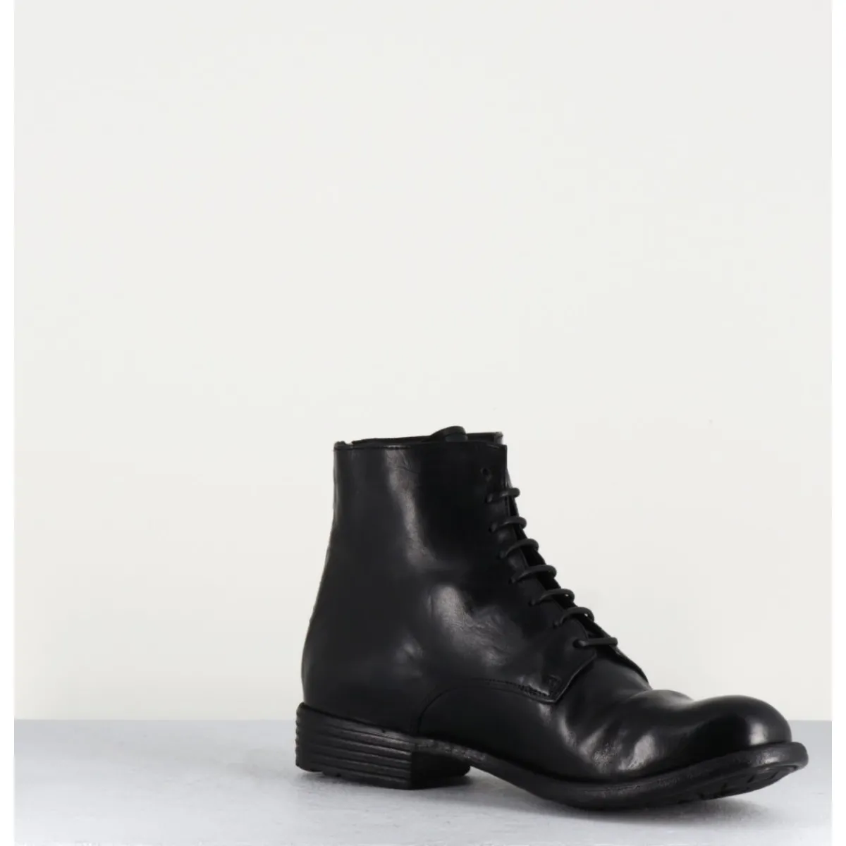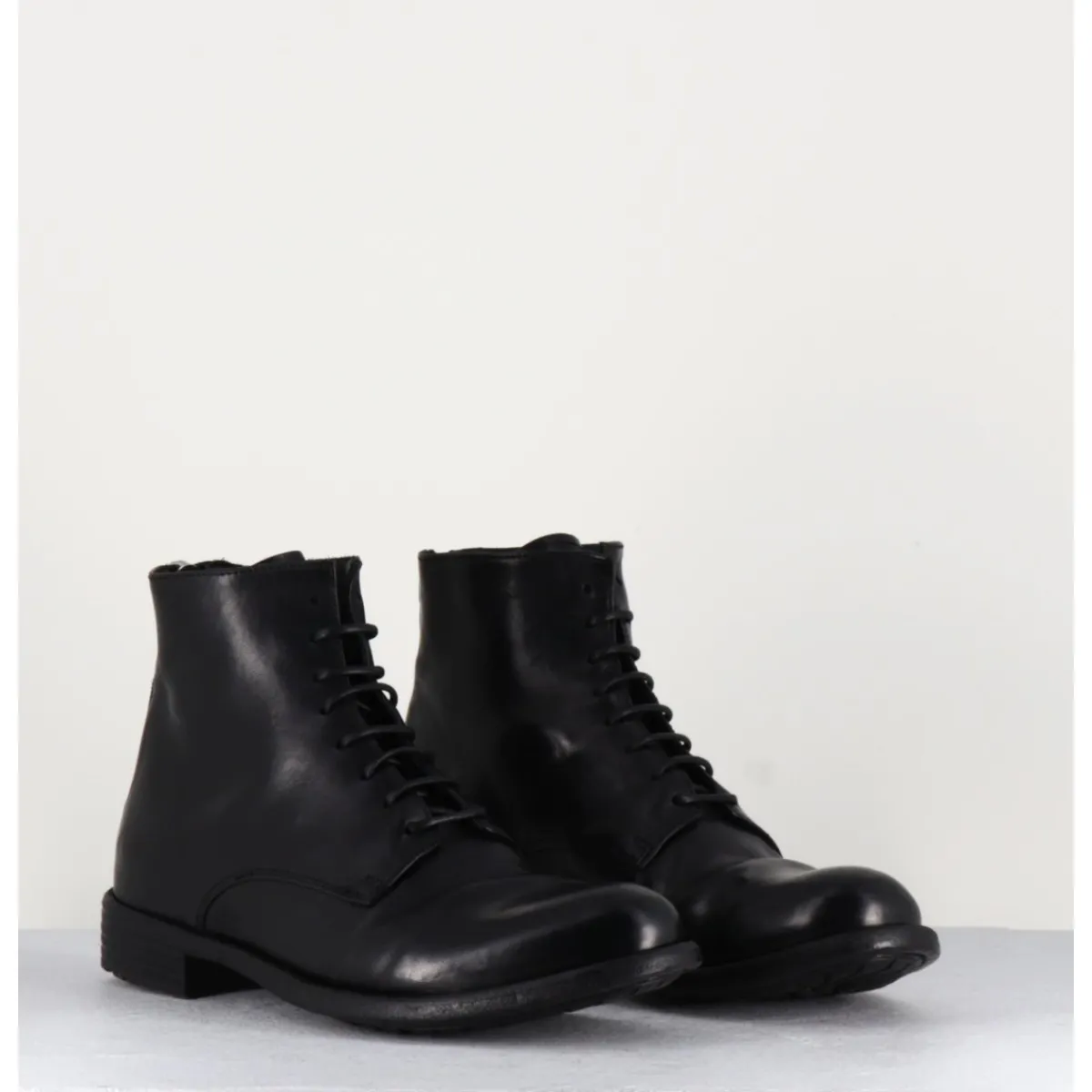 Bottines à lacets en cuir noir lavé et patiné à la main, bout en amande & fermeture intérieure, montées sur un petit talon.