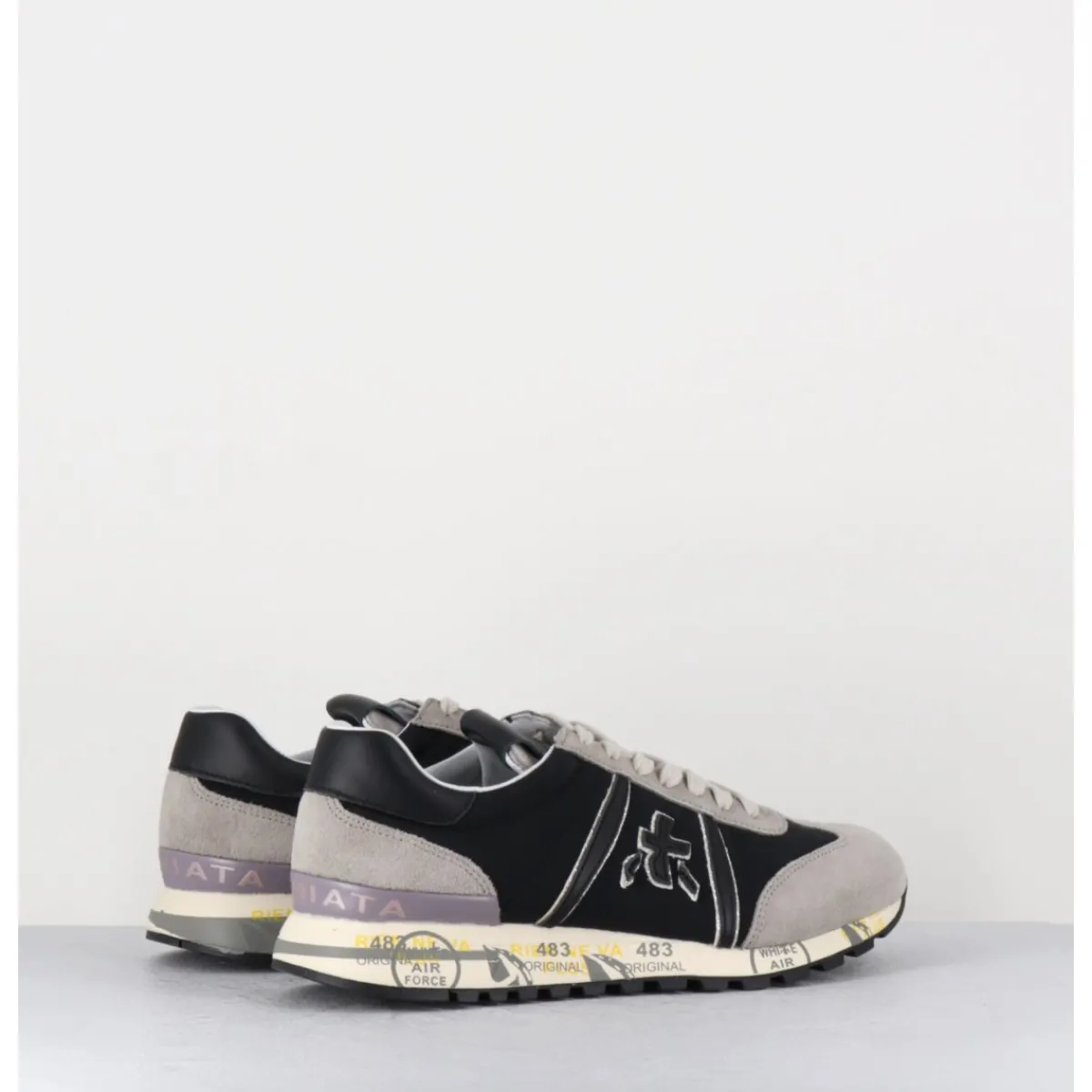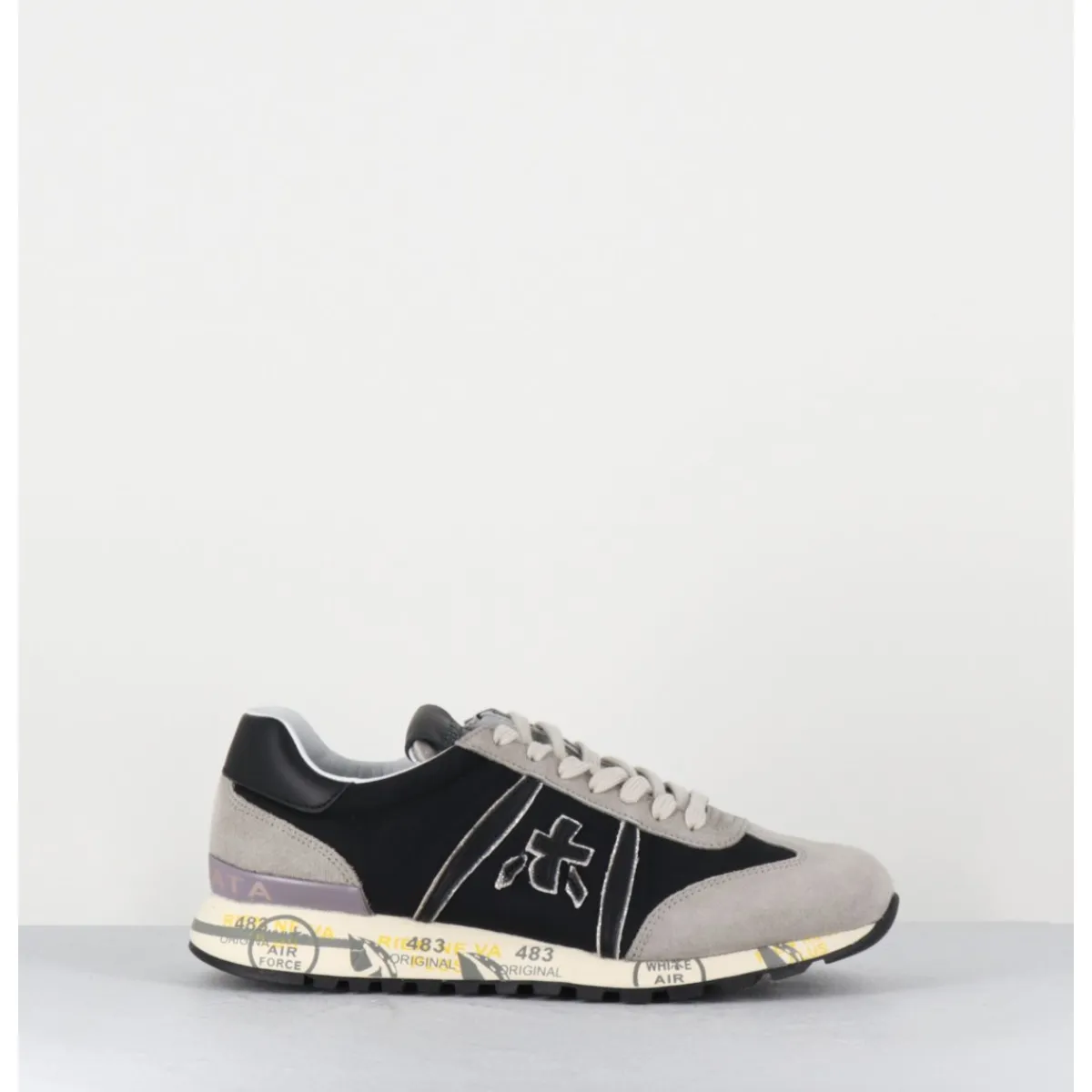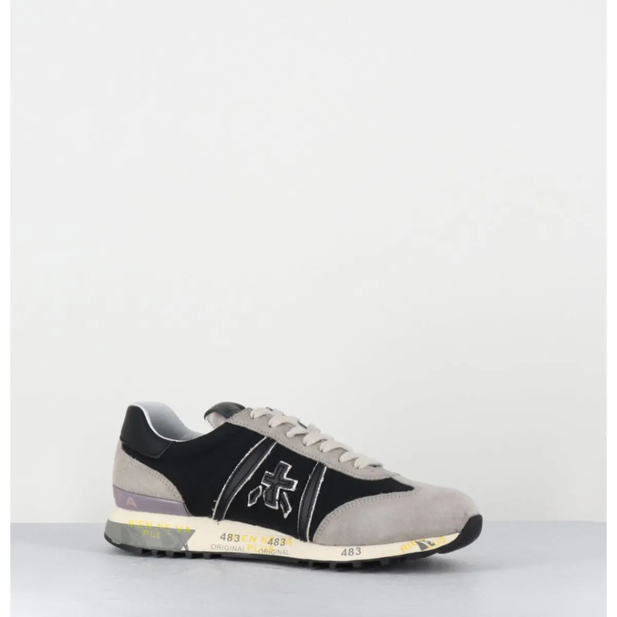 Baskets daim gris et toile noir avec détails de cuir mat noir, montées sur une semelle légère, avec imprimé signature de la Maison Italienne Premiata.