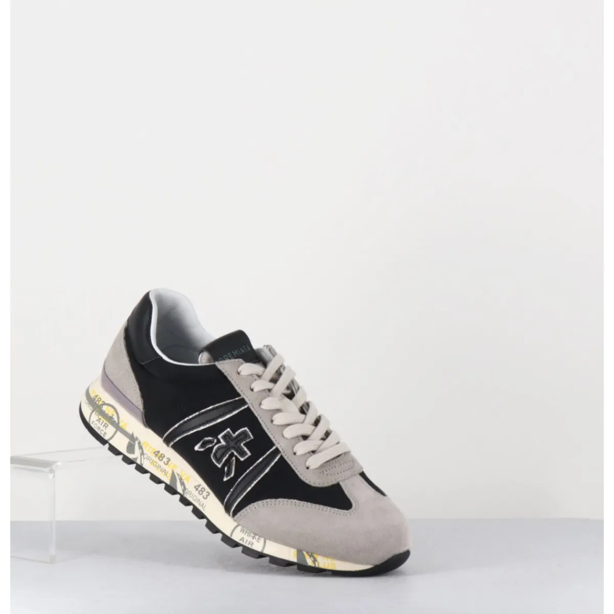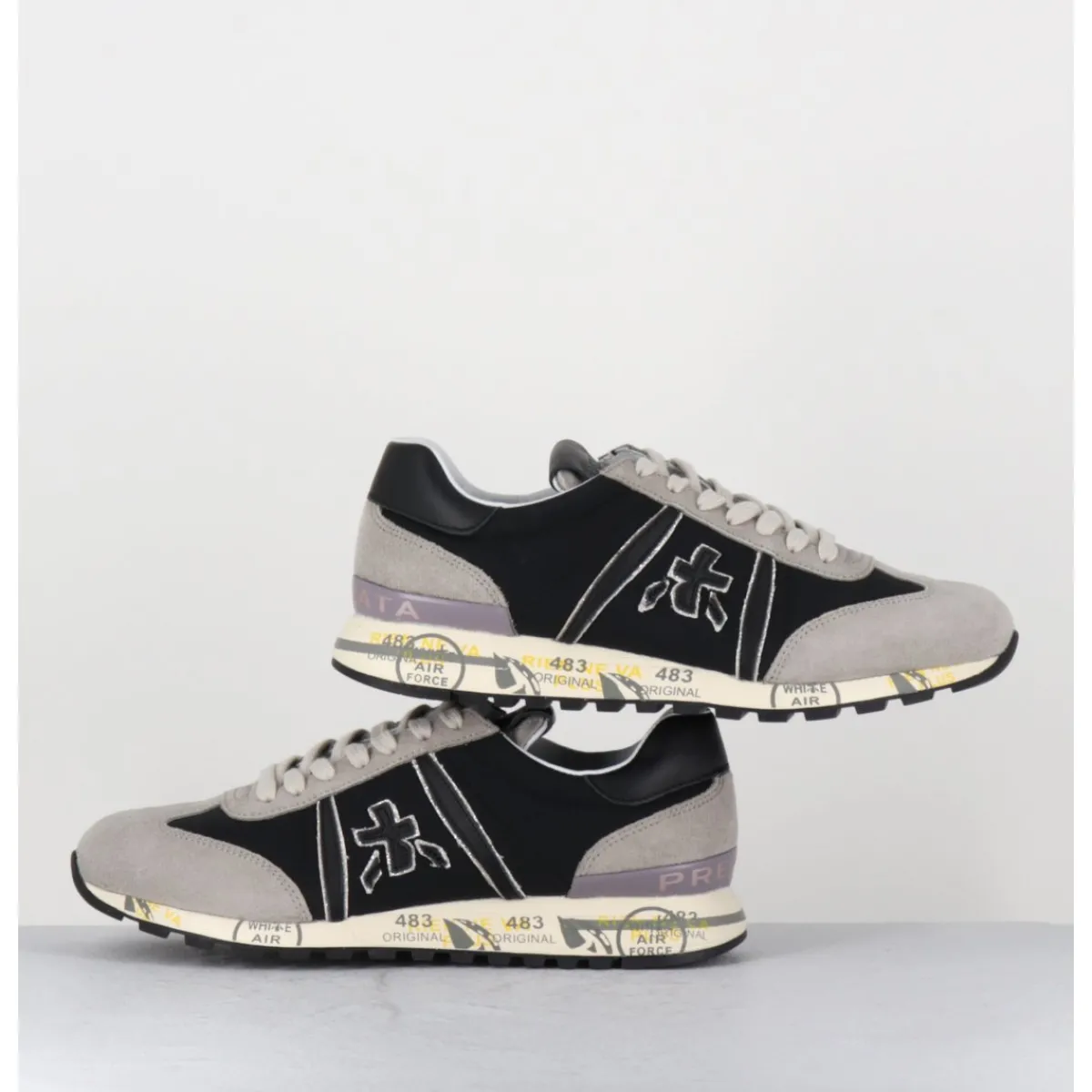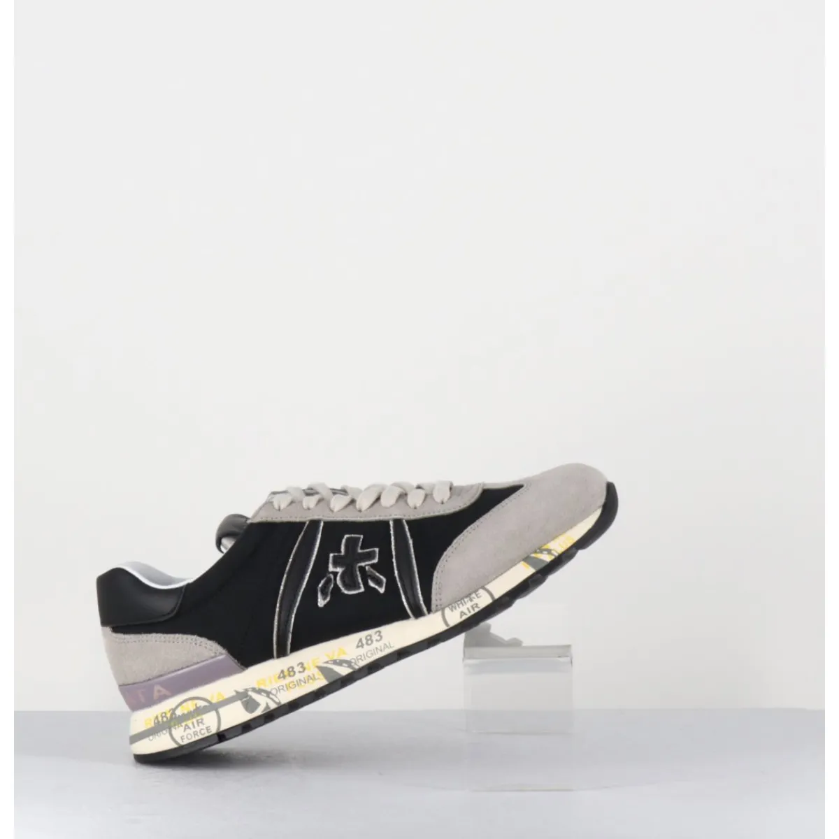 Baskets daim gris et toile noir avec détails de cuir mat noir, montées sur une semelle légère, avec imprimé signature de la Maison Italienne Premiata.