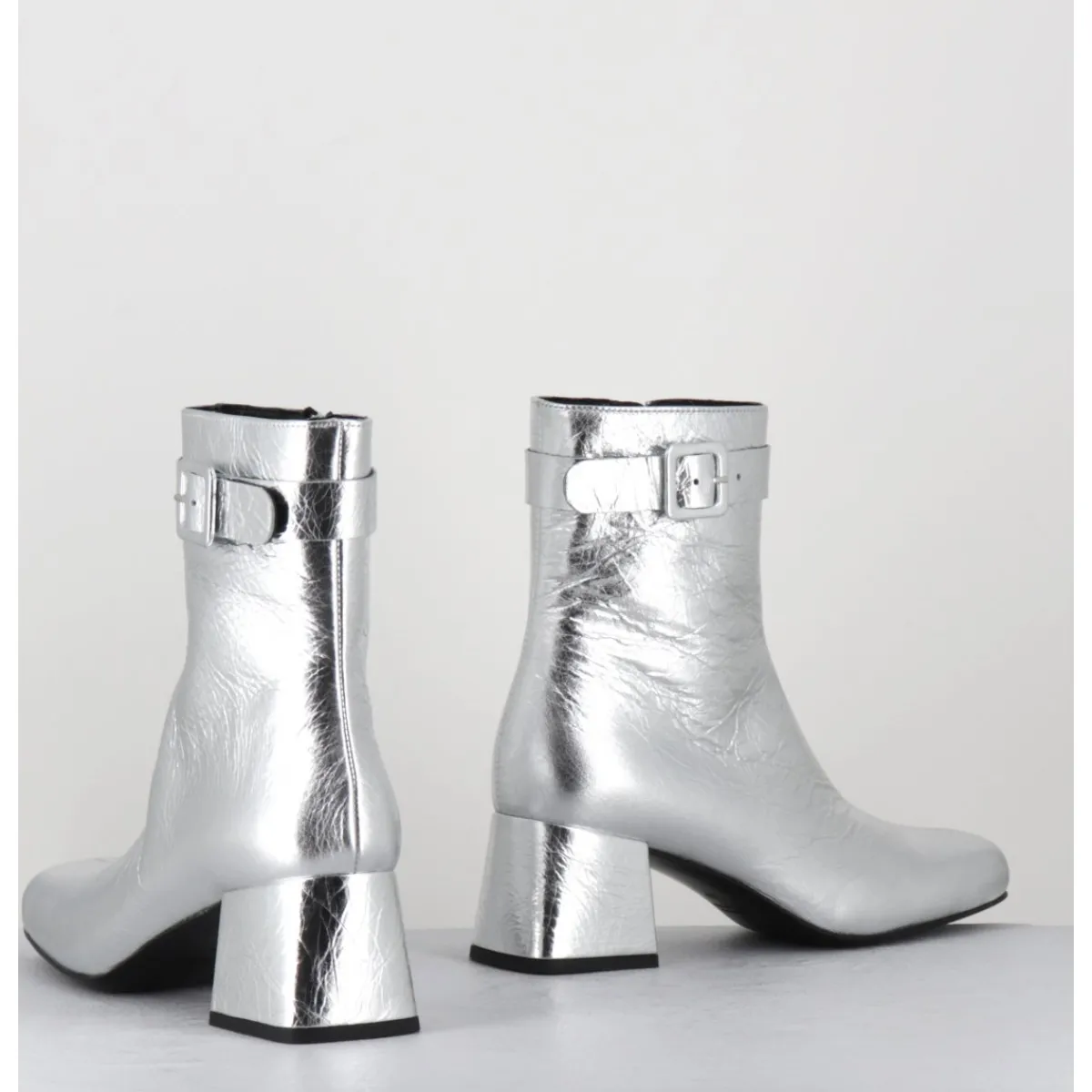 Boots en cuir effet froissé métallisé argent, bout carré et petit talon évasé esprit 60s