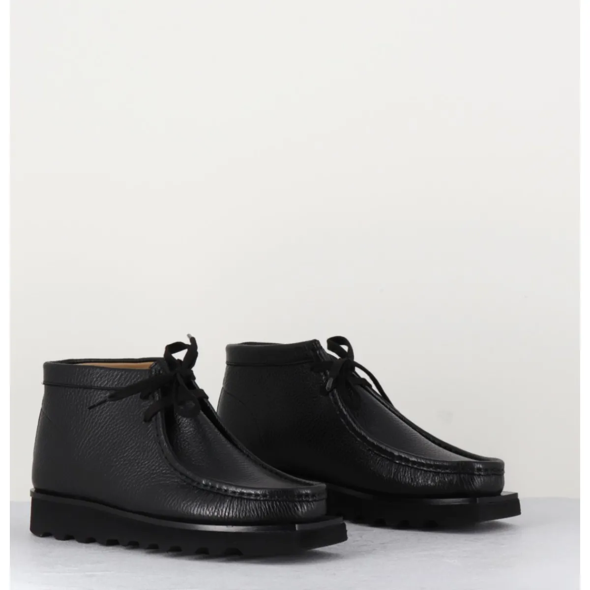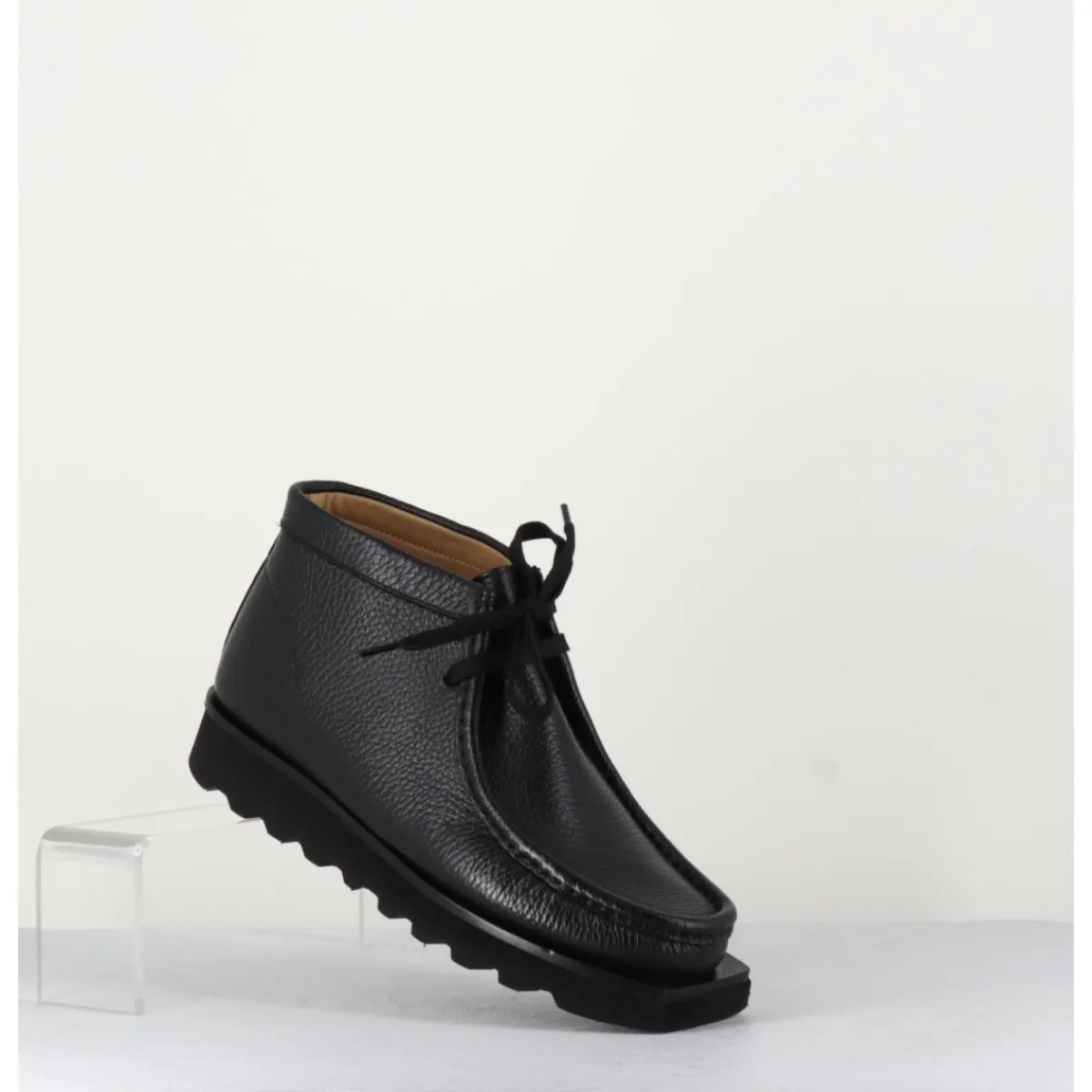 Chaussures à lacets en cuir grainé noir découpe brogue, surpiqûres ton sur ton, bout effilé, montées sur une semelle en micro fibre ultra légère au bout carré.