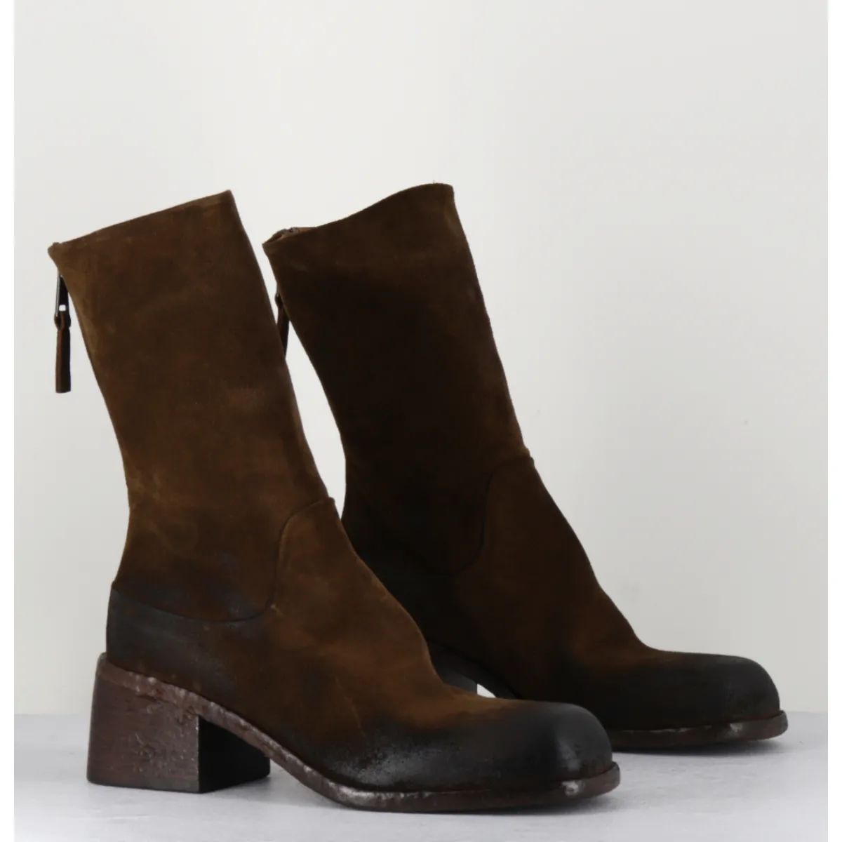 Boots bikers en daim marron brossé au noir, zip arrière, bout carré, montées sur une semelle et un talon bloc en cuir et gomme crantées