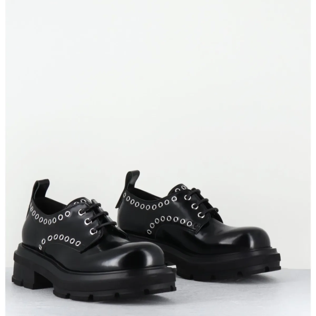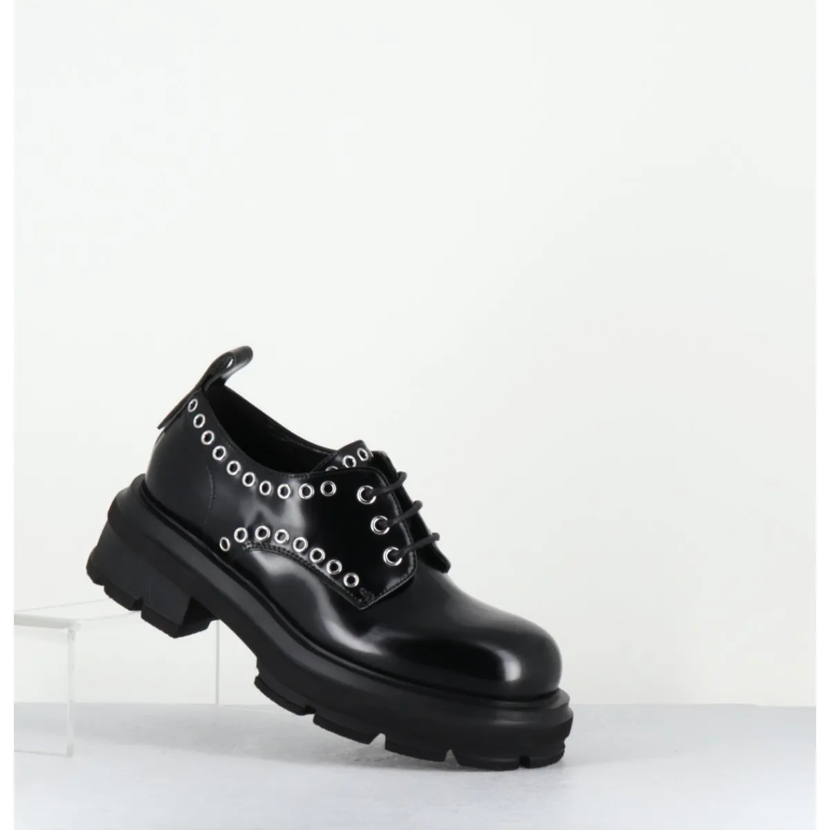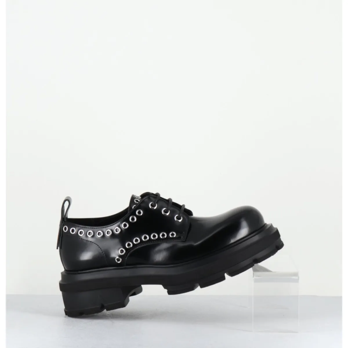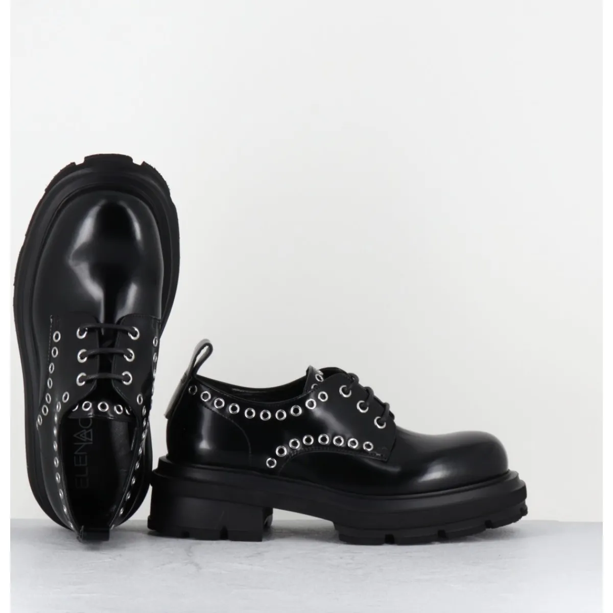 Derbies à lacets effet glacé noir, bout arrondi esprit années 90, rivets argentées, montées sur une semelle épaisse en gomme légère