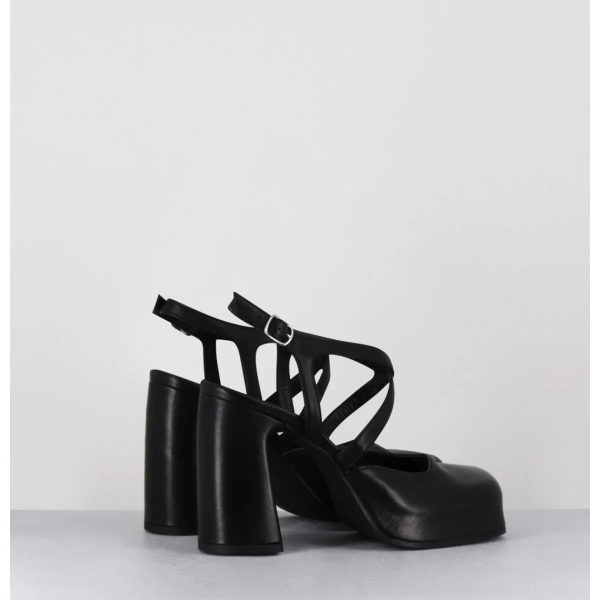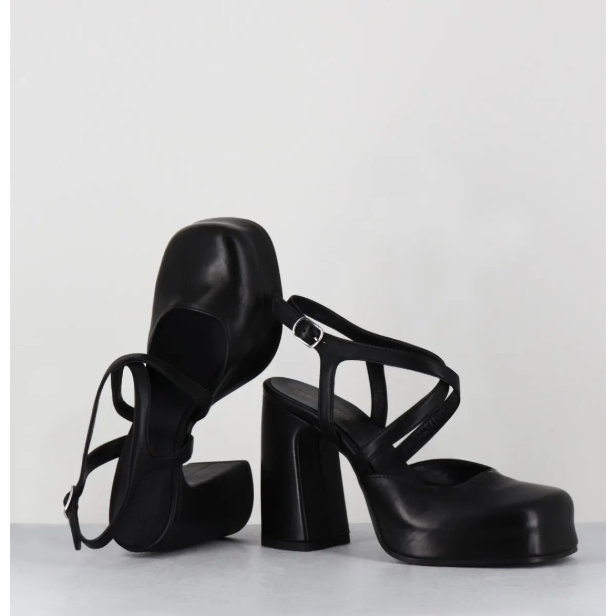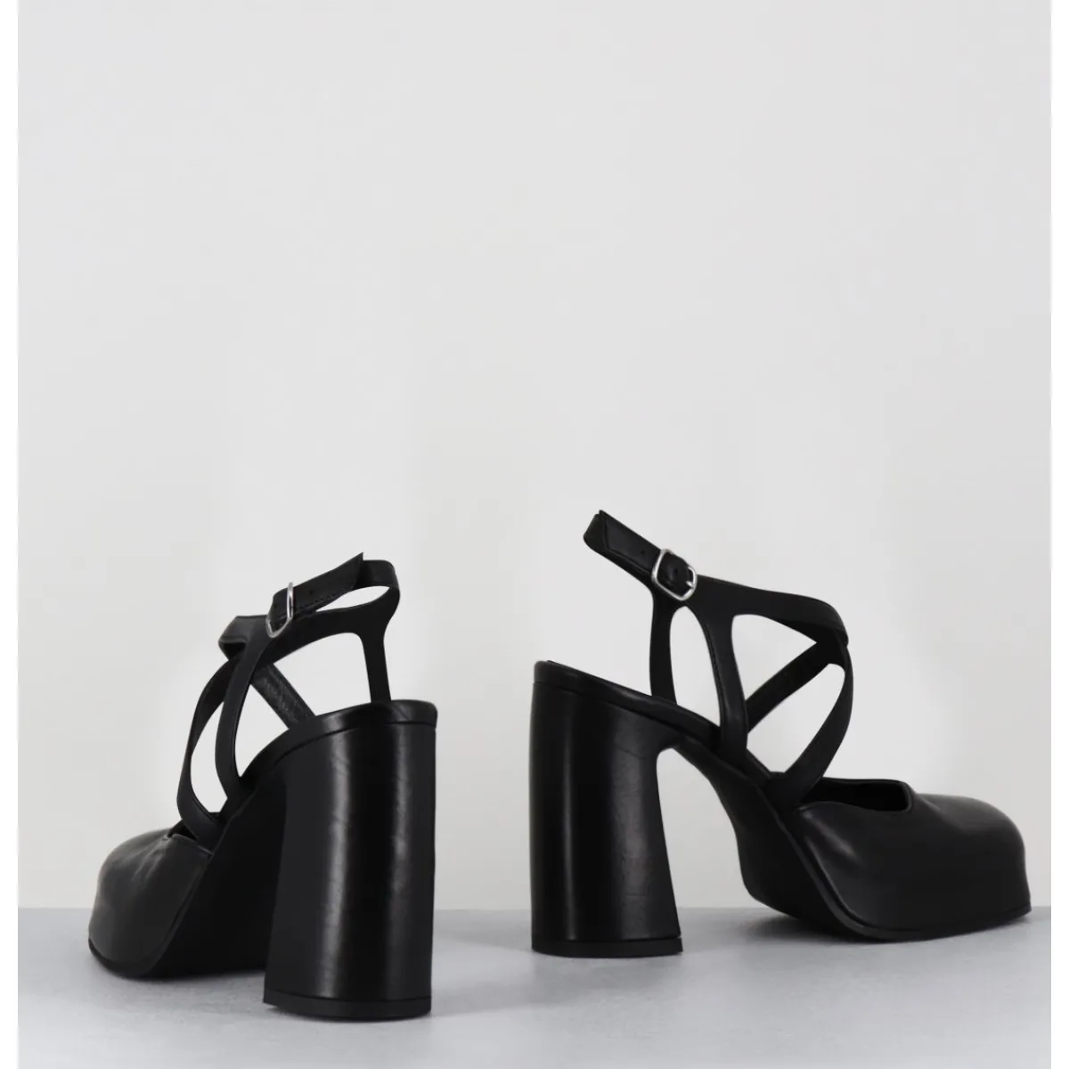 Babies à plateforme brides croisés en cuir noir souple, bout carré recouvert, ligne pure, montées sur un talon large stylisé