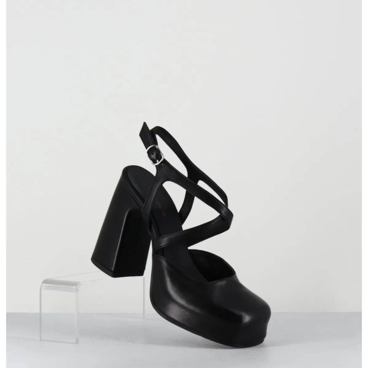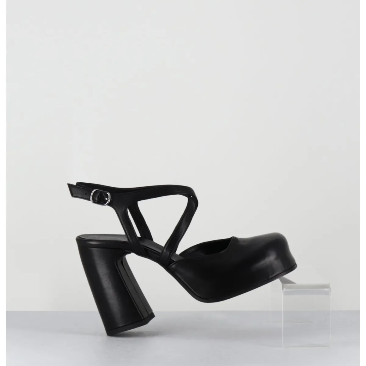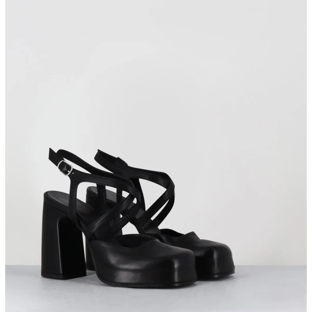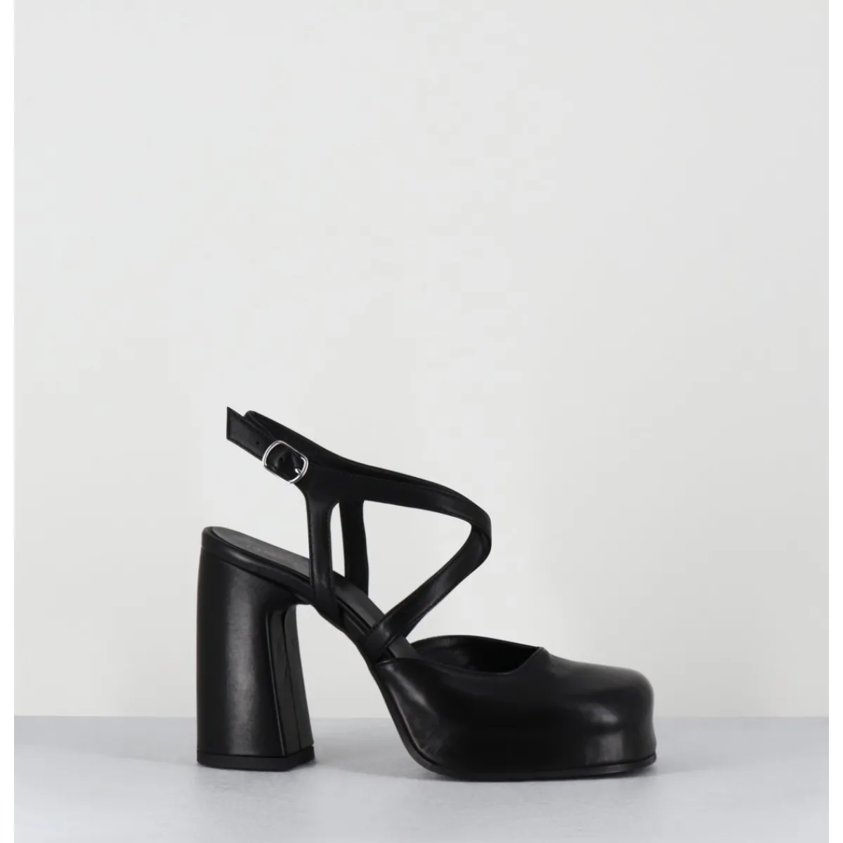 Babies à plateforme brides croisés en cuir noir souple, bout carré recouvert, ligne pure, montées sur un talon large stylisé
