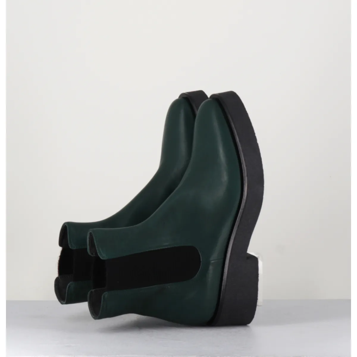 Boots chelsea en cuir vert forêt, montées sur une semelle épaisse en crêpe noir qui vous assurera adhérence et confort.