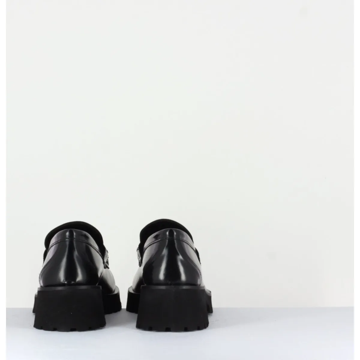 Mocassin style anglais en cuir glacé noir avec mors or mat et bout en amande à pointe légèrement carrée, montés sur une semelle épaisse en micro ultra-légère. Conçu dans les Ateliers Italiens.