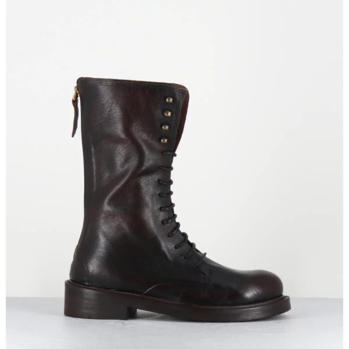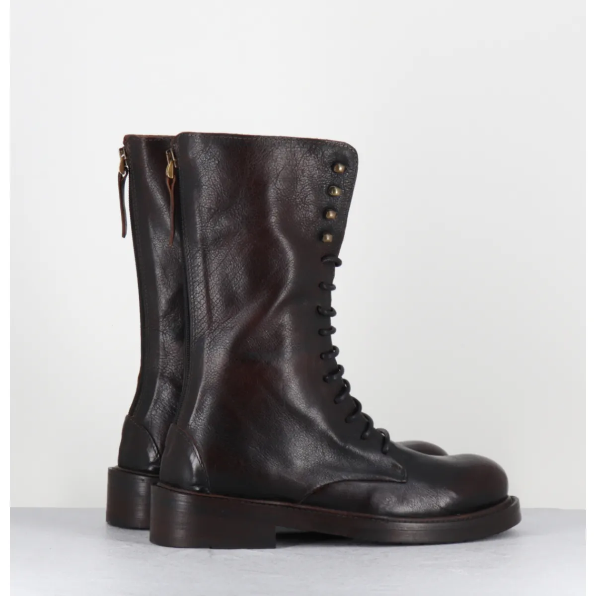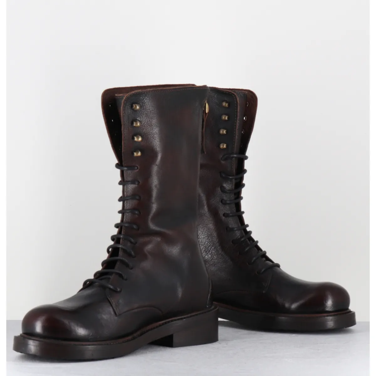 Boots rangers à lacets en cuir marron brossé au noir pour un effet ‘vintage’, bout rond , zip arrière, montées sur une semelle en gomme