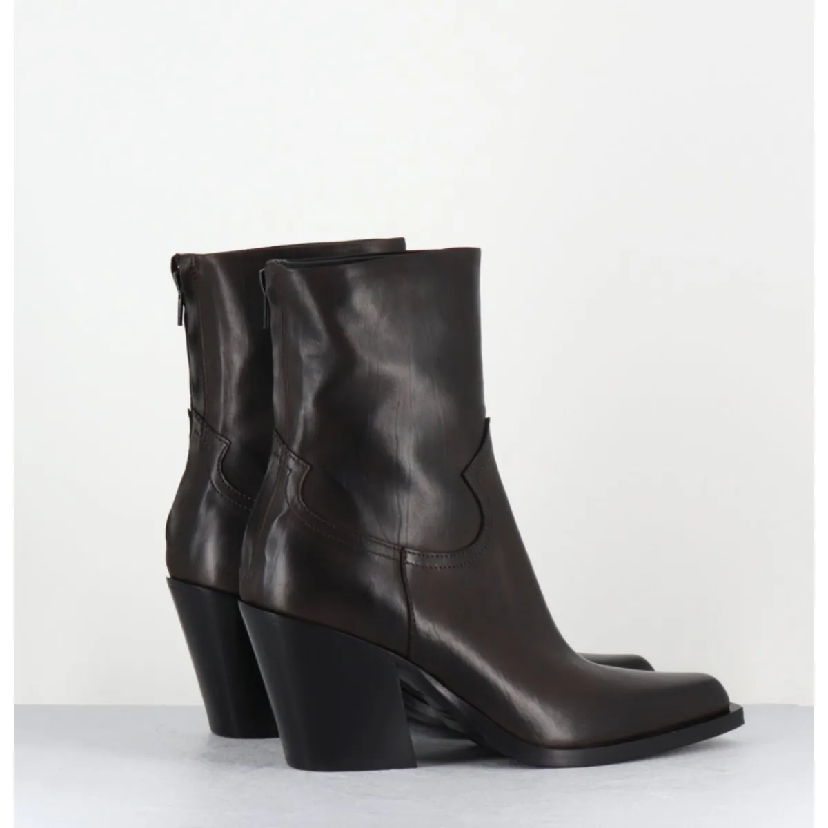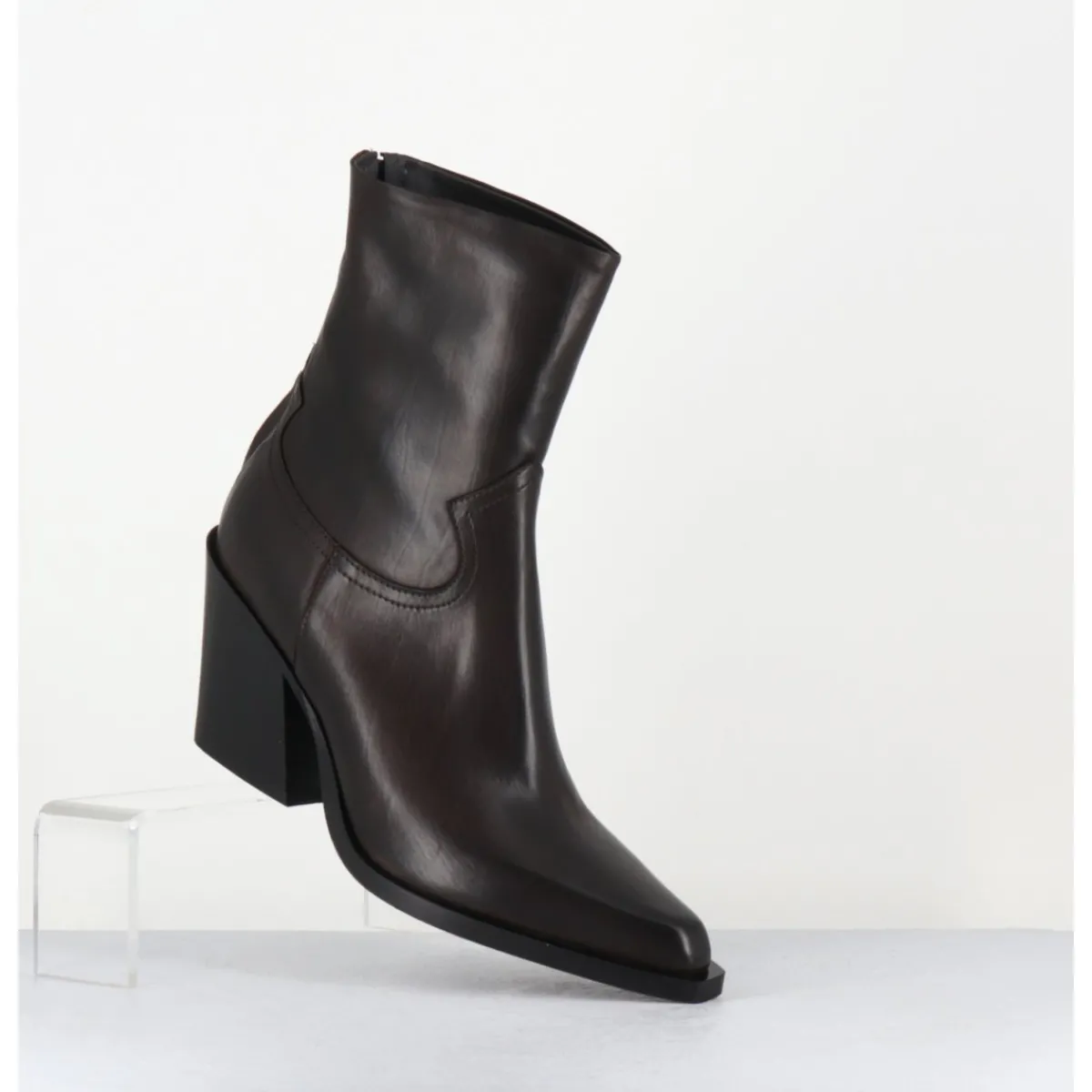 Boots Santiags en cuir marron chocolat souple, ligne pure à bout pointu avec petite pointe carrée, design traditionnel cousu, zip arrière, montées sur un talon haut biseauté.