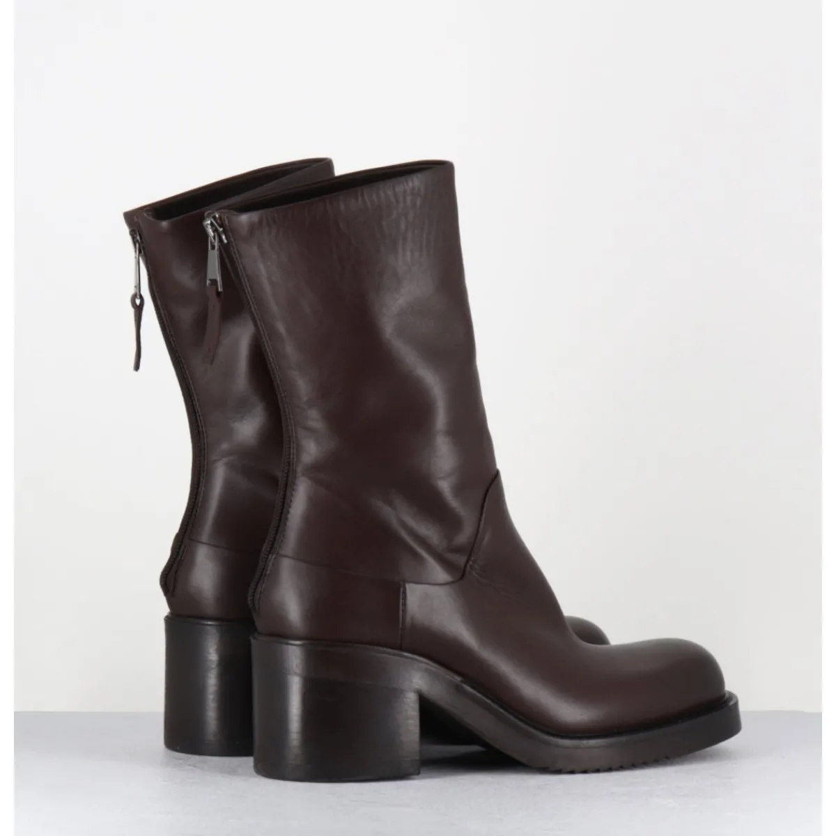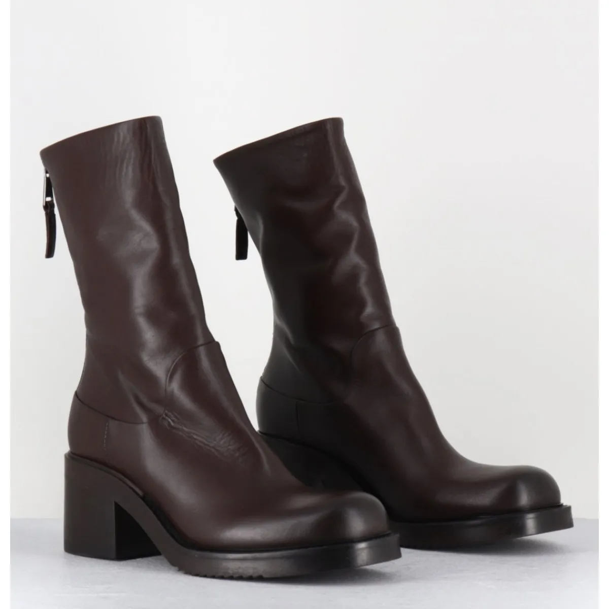Boots en cuir souple marron chocolat, ligne pure esprit bikers avec zip arrière, montées sur un talon bloc et une semelle en gomme légère