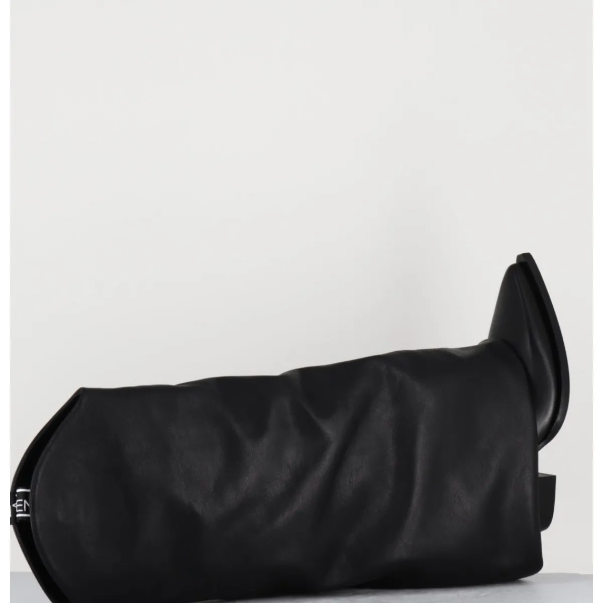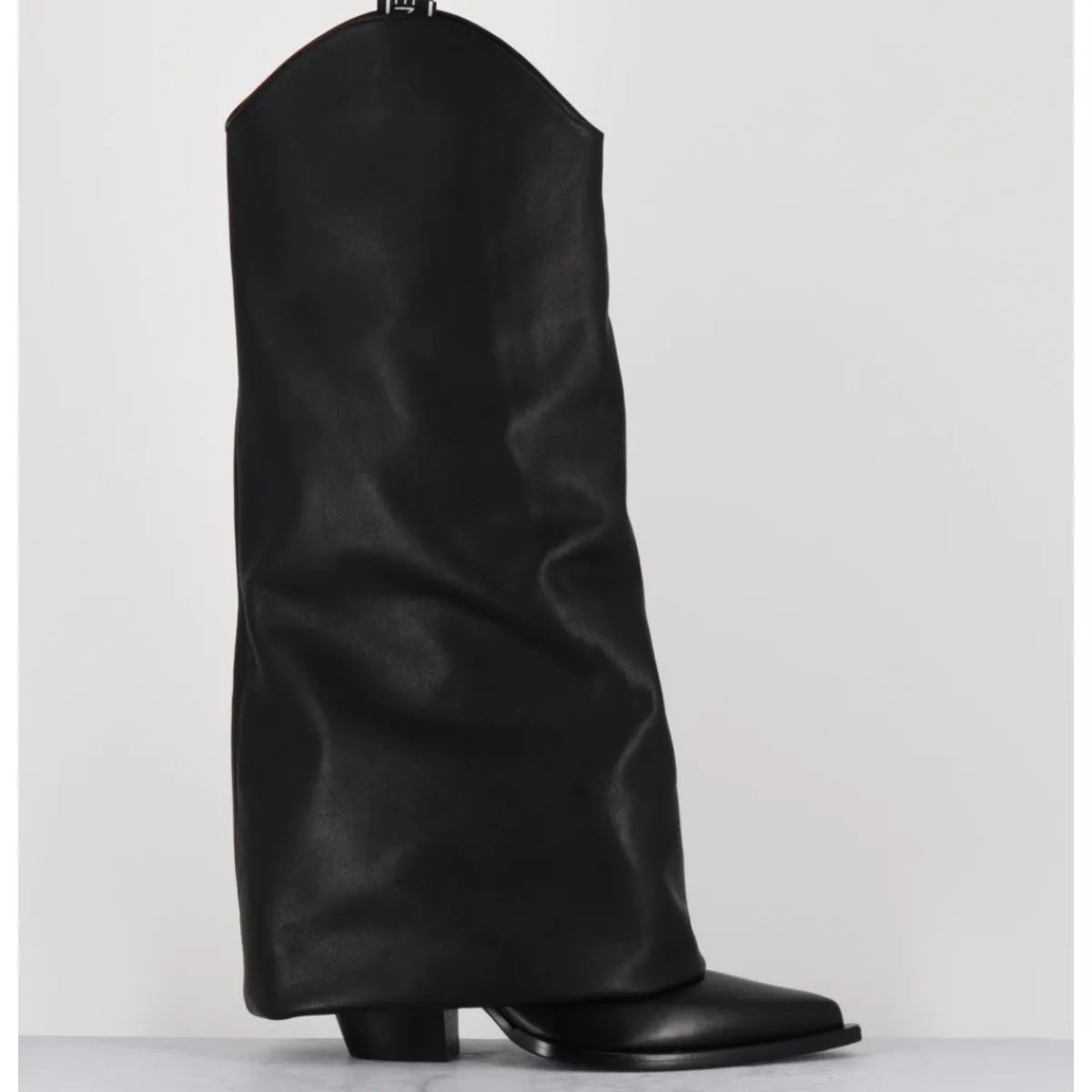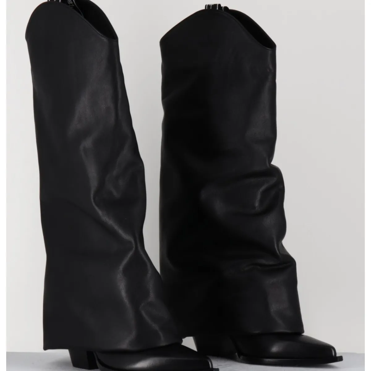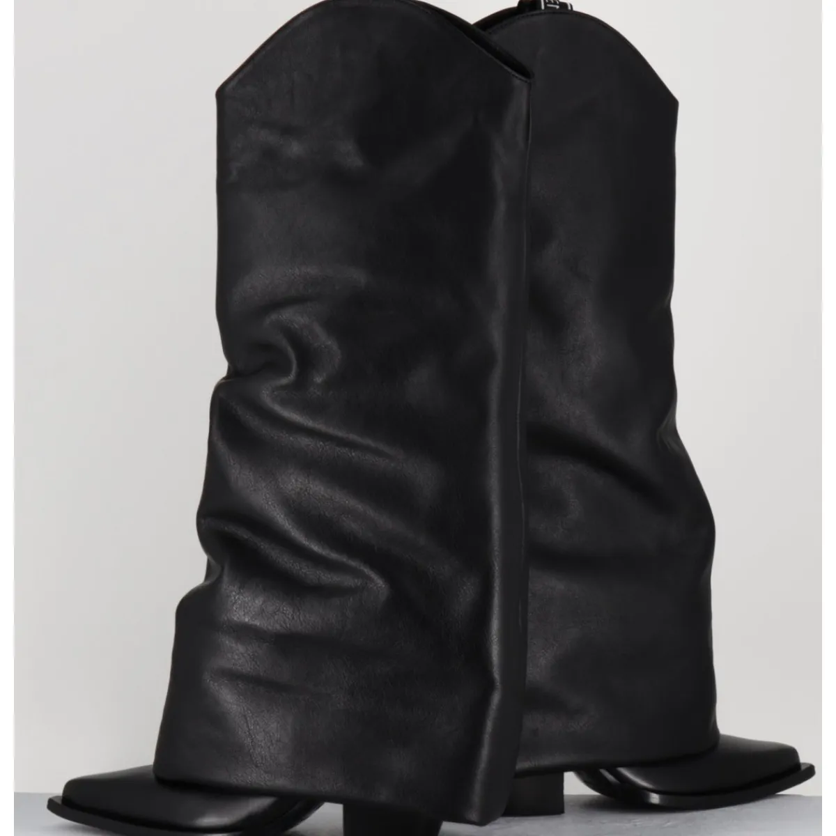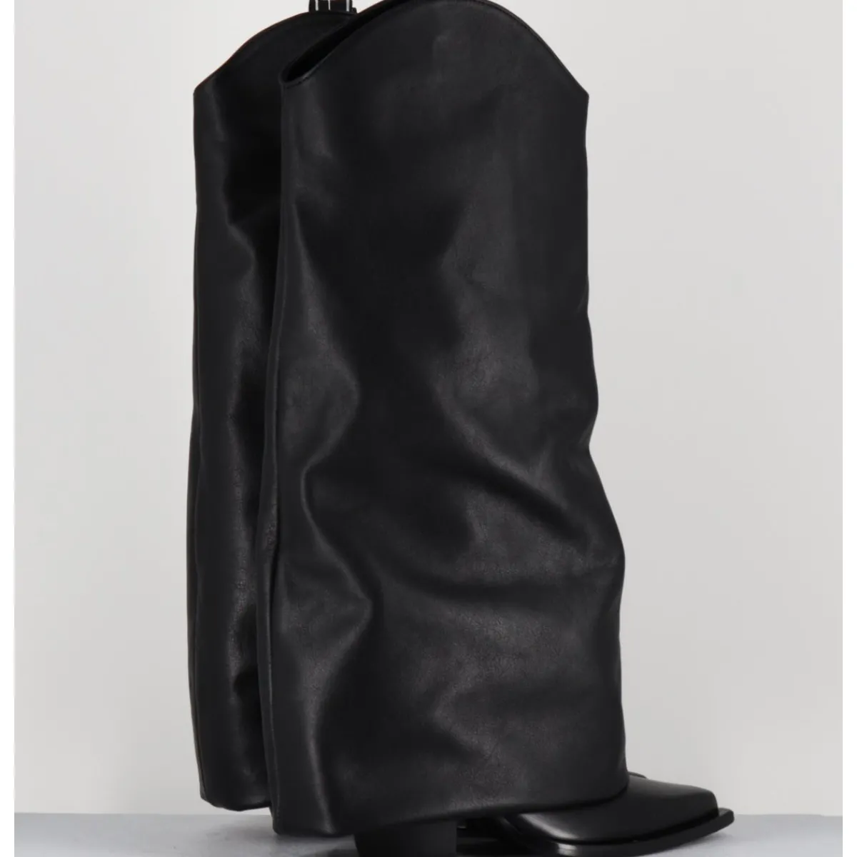 Bottes Santiag à guêtre en cuir souple noir effet froissé, montées sur une semelle en cuir noir et un talon haut biseauté