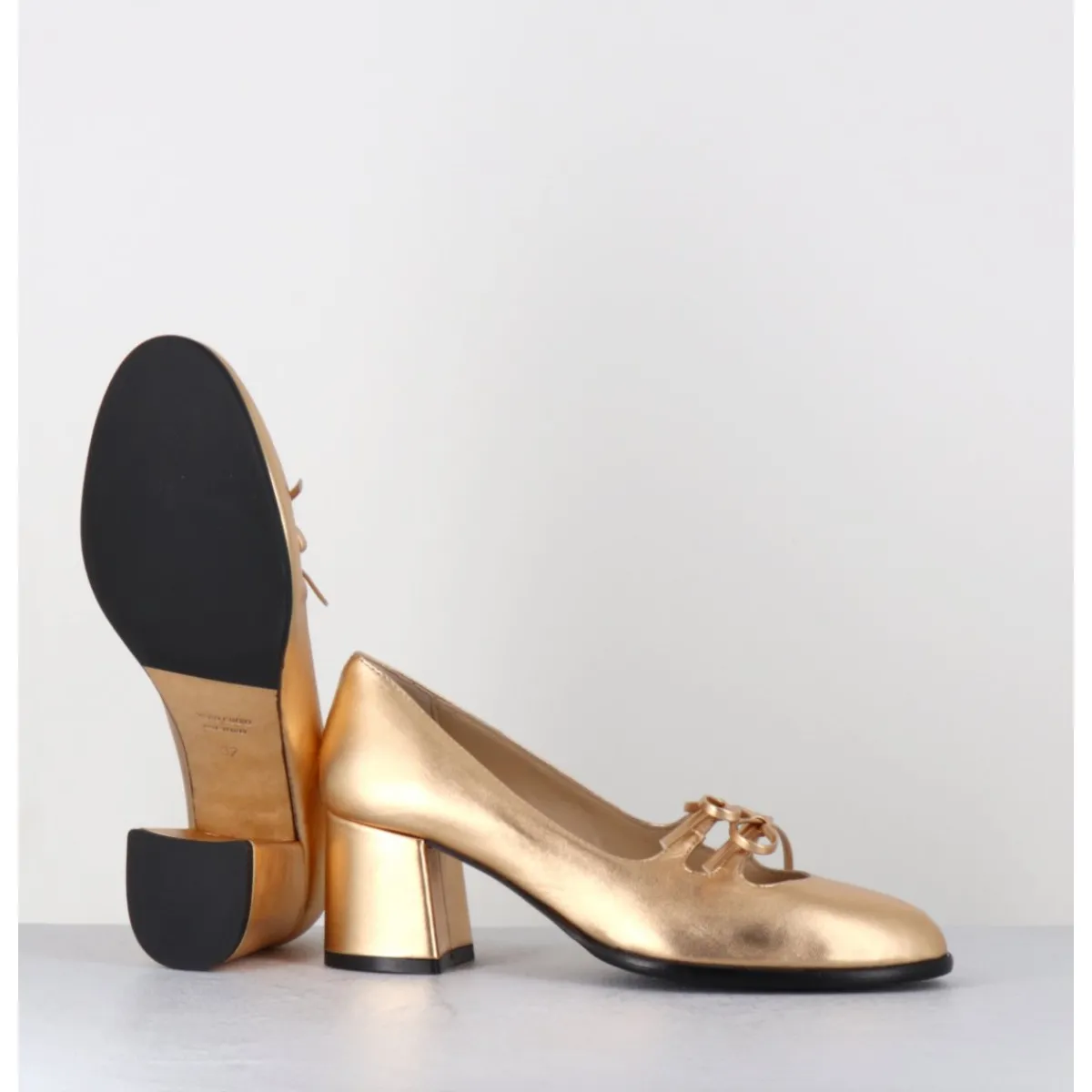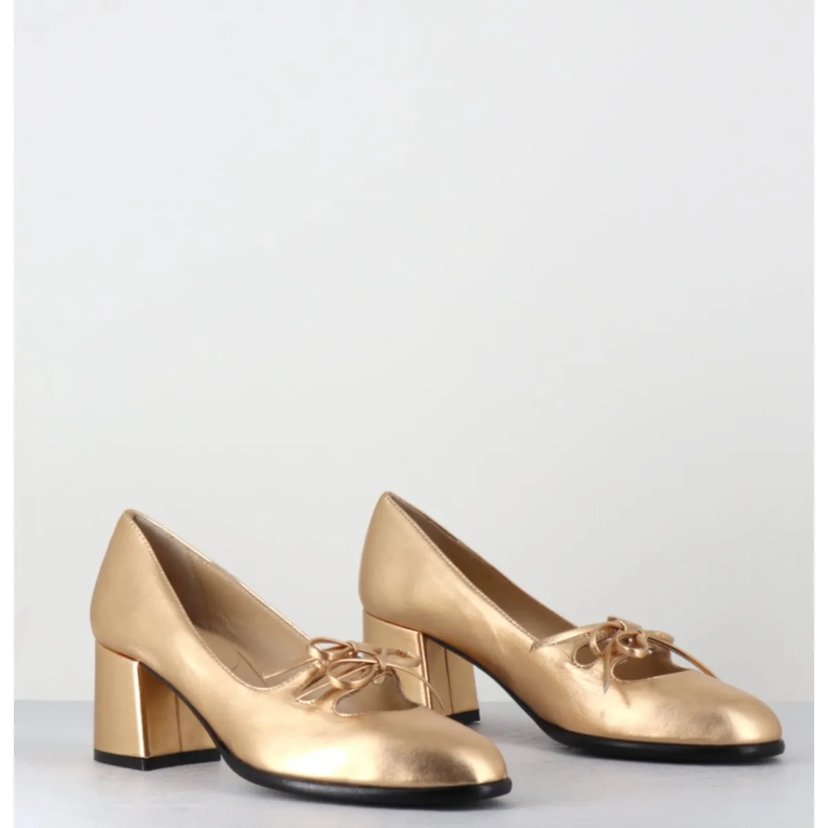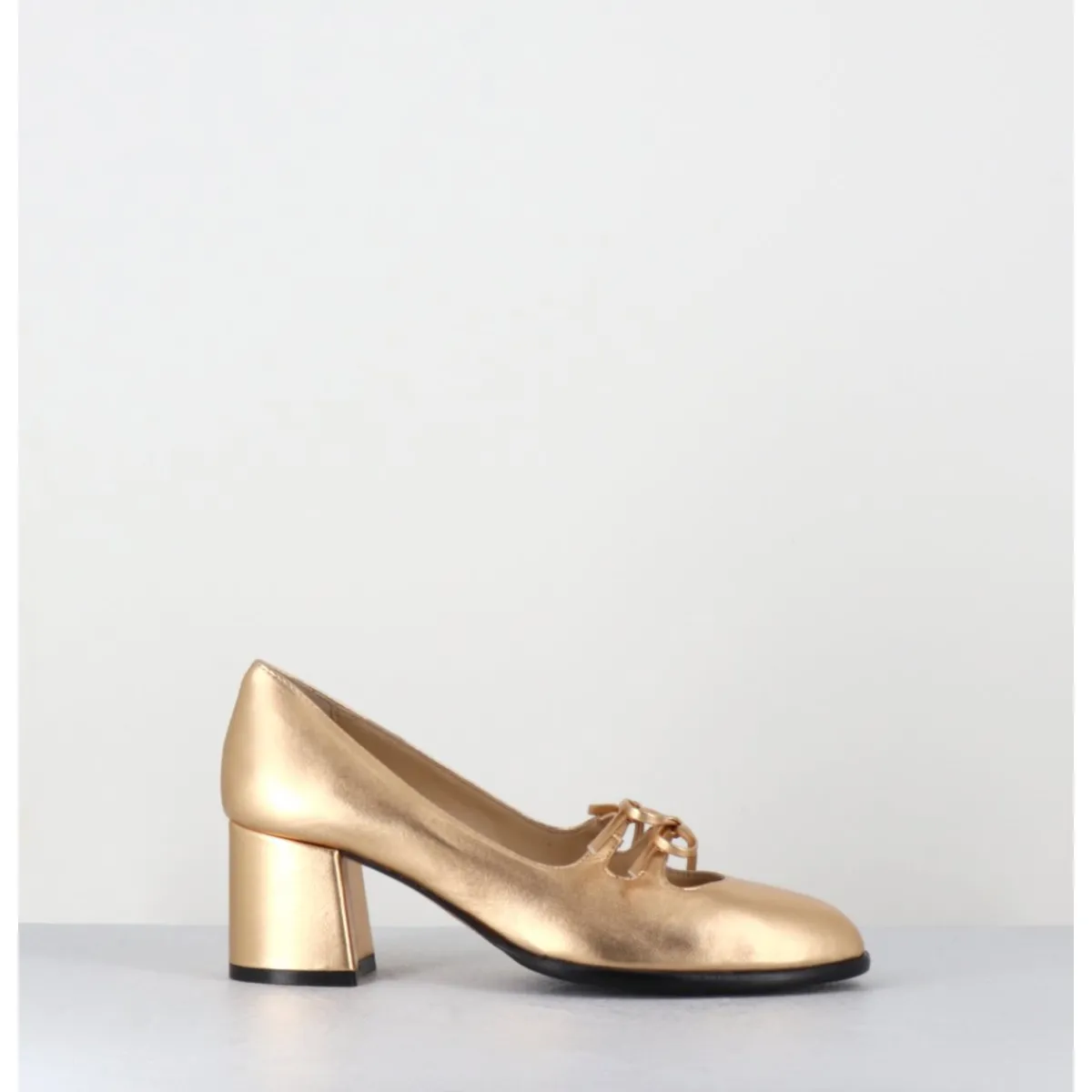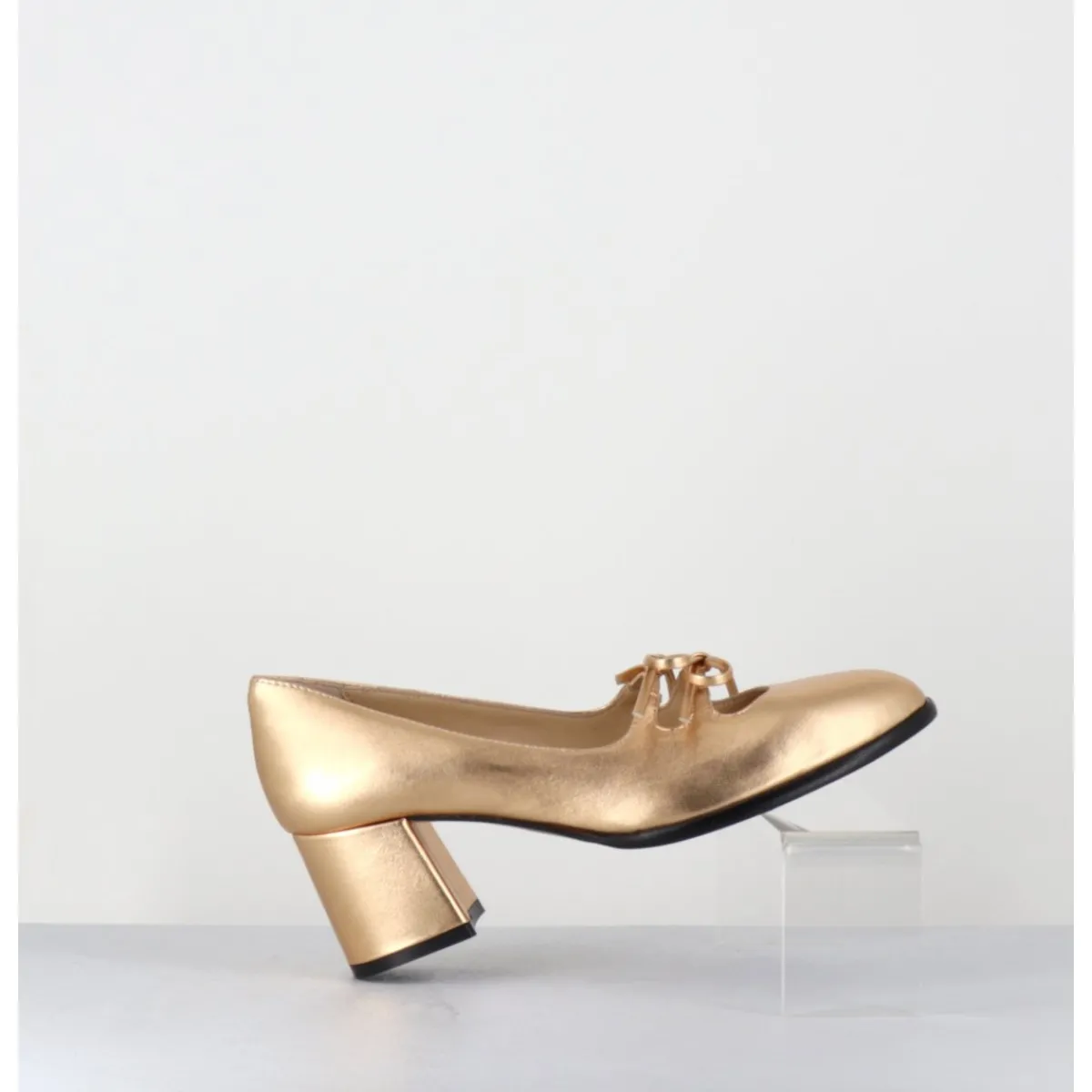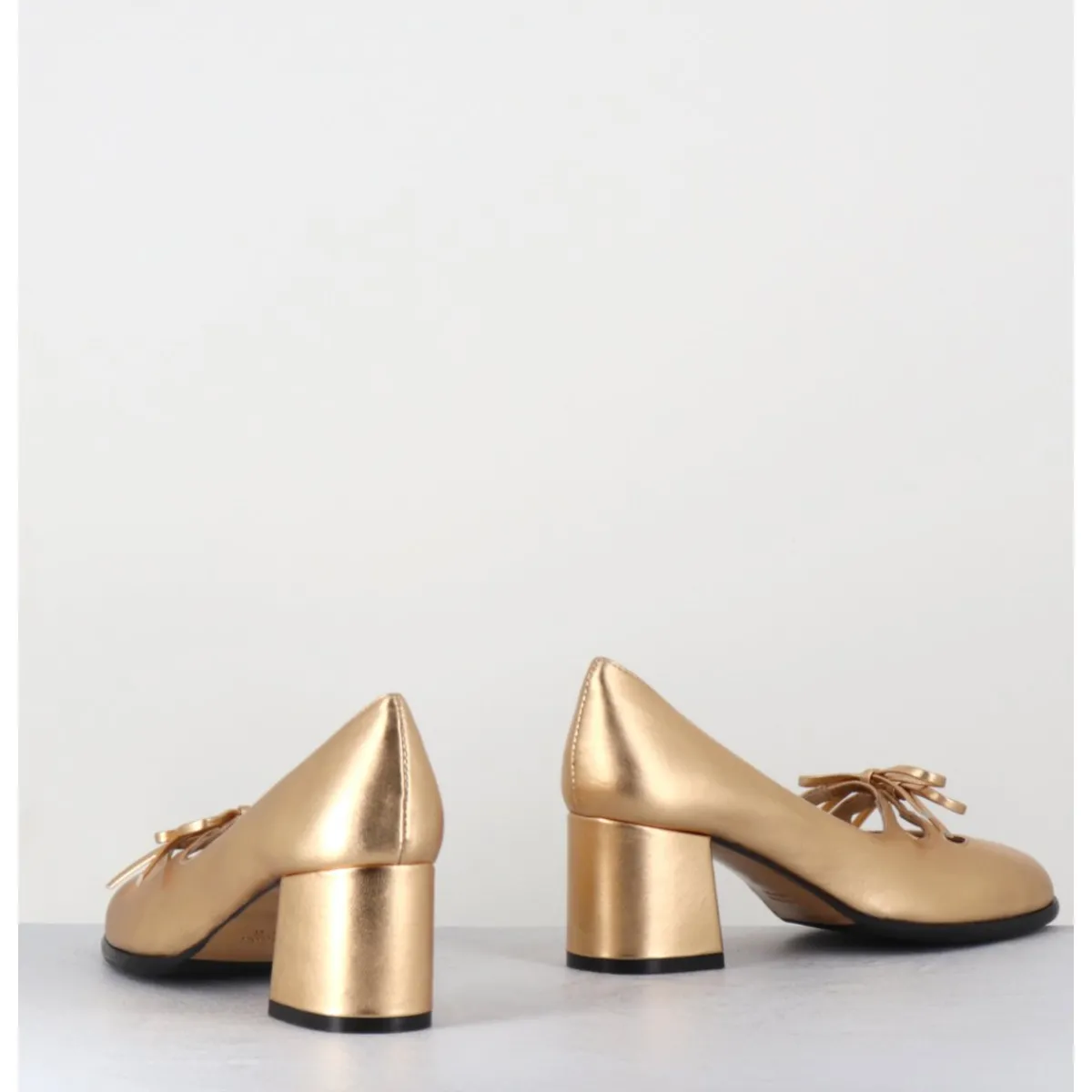Babies à talon en cuir métallisé doré avec petits noeuds décoratifs cousus sur des élastiques de confort invisibles, bout en amande, montées sur un talon bloc