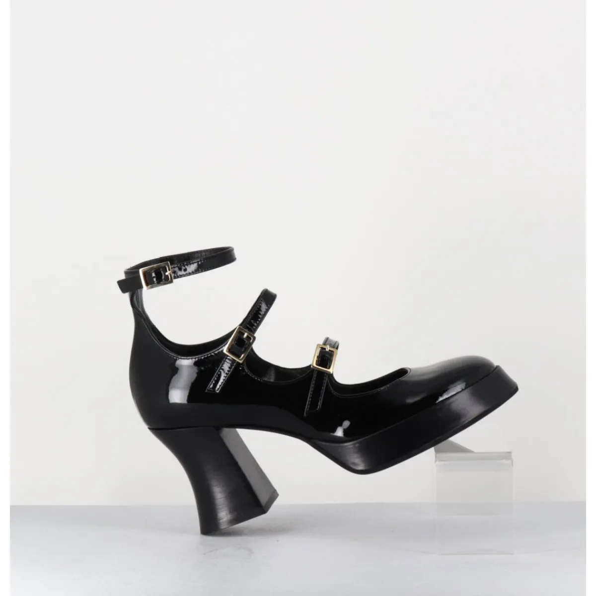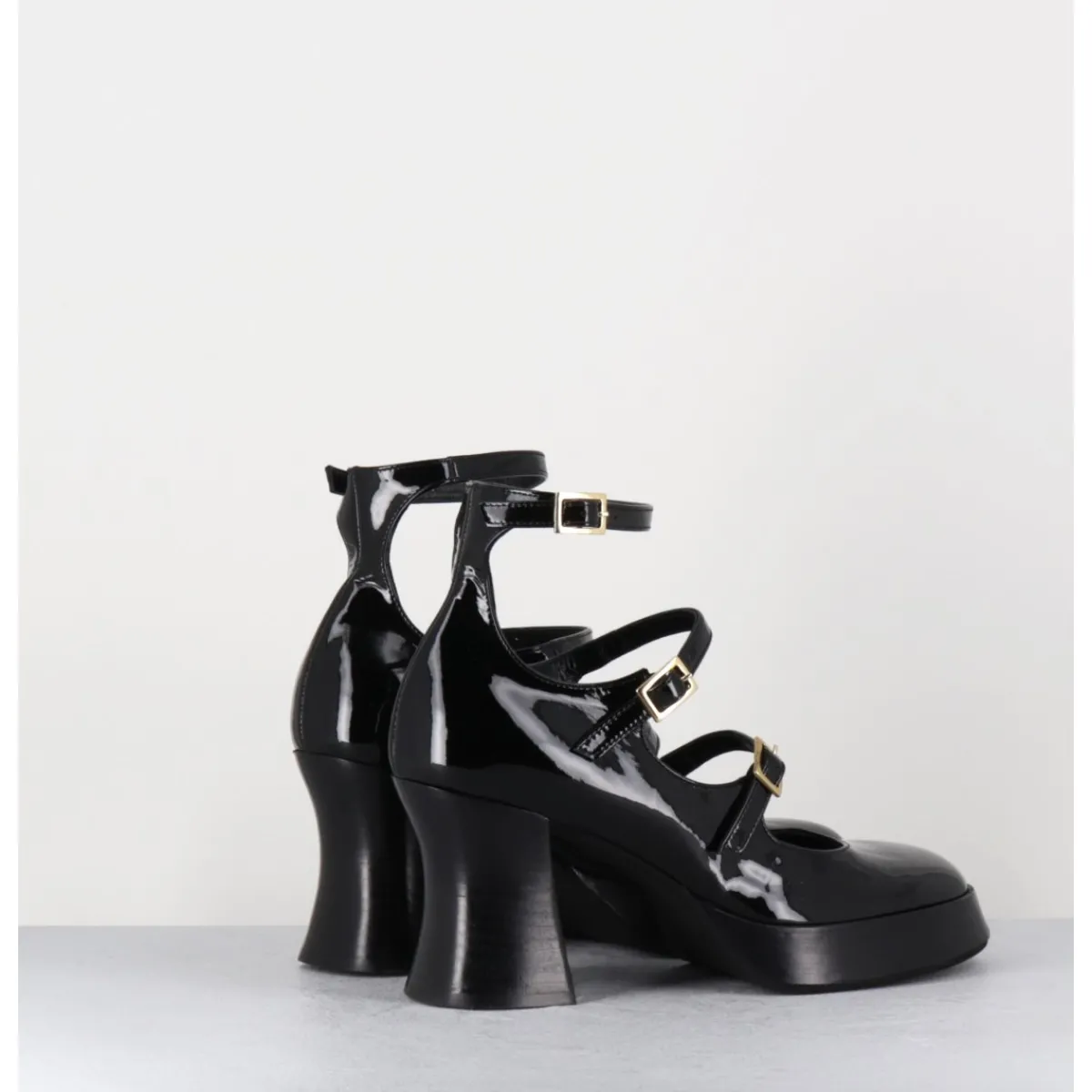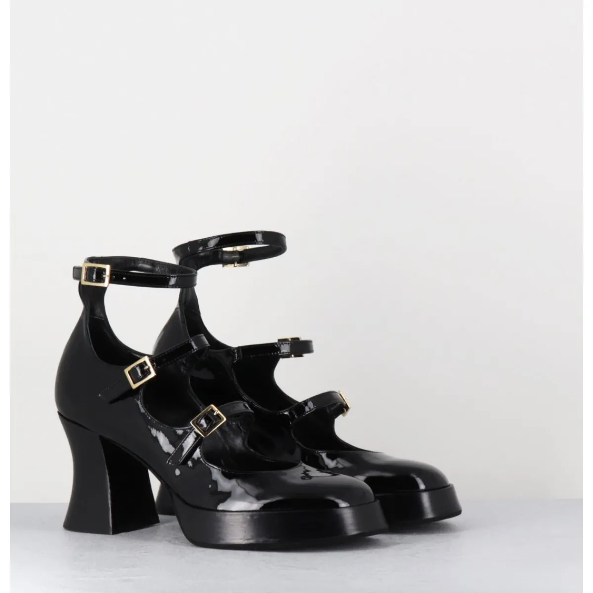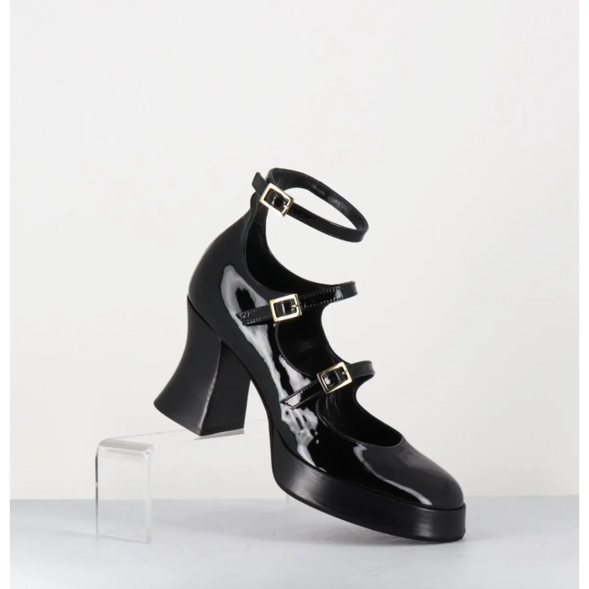Chaussures babies multi-brides en cuir vernis noir, 3 boucles dorées réglables, bout rond, montées sur une fine plateforme et un talon esprit bobine rétro