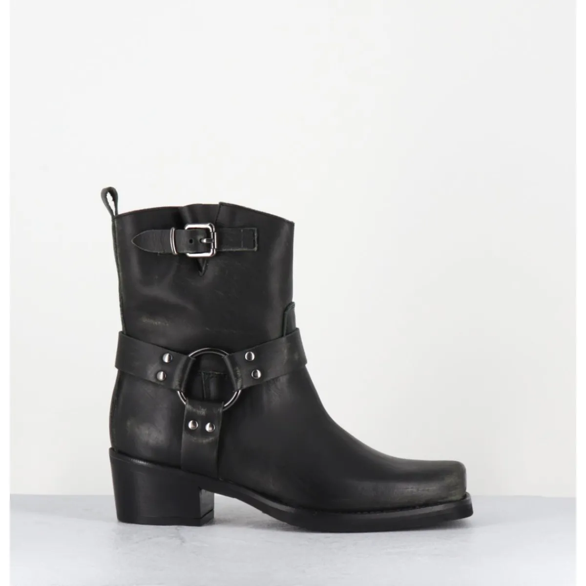 Boots en cuir souple noir effet usé anthracite, boucle ceinturon argent esprit biker, bout carré, zip intérieur, montées sur une semelle en gomme et un petit talon bloc confortable