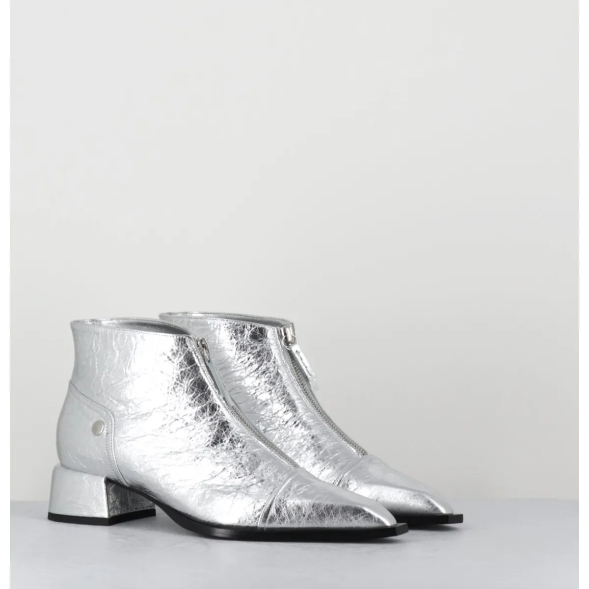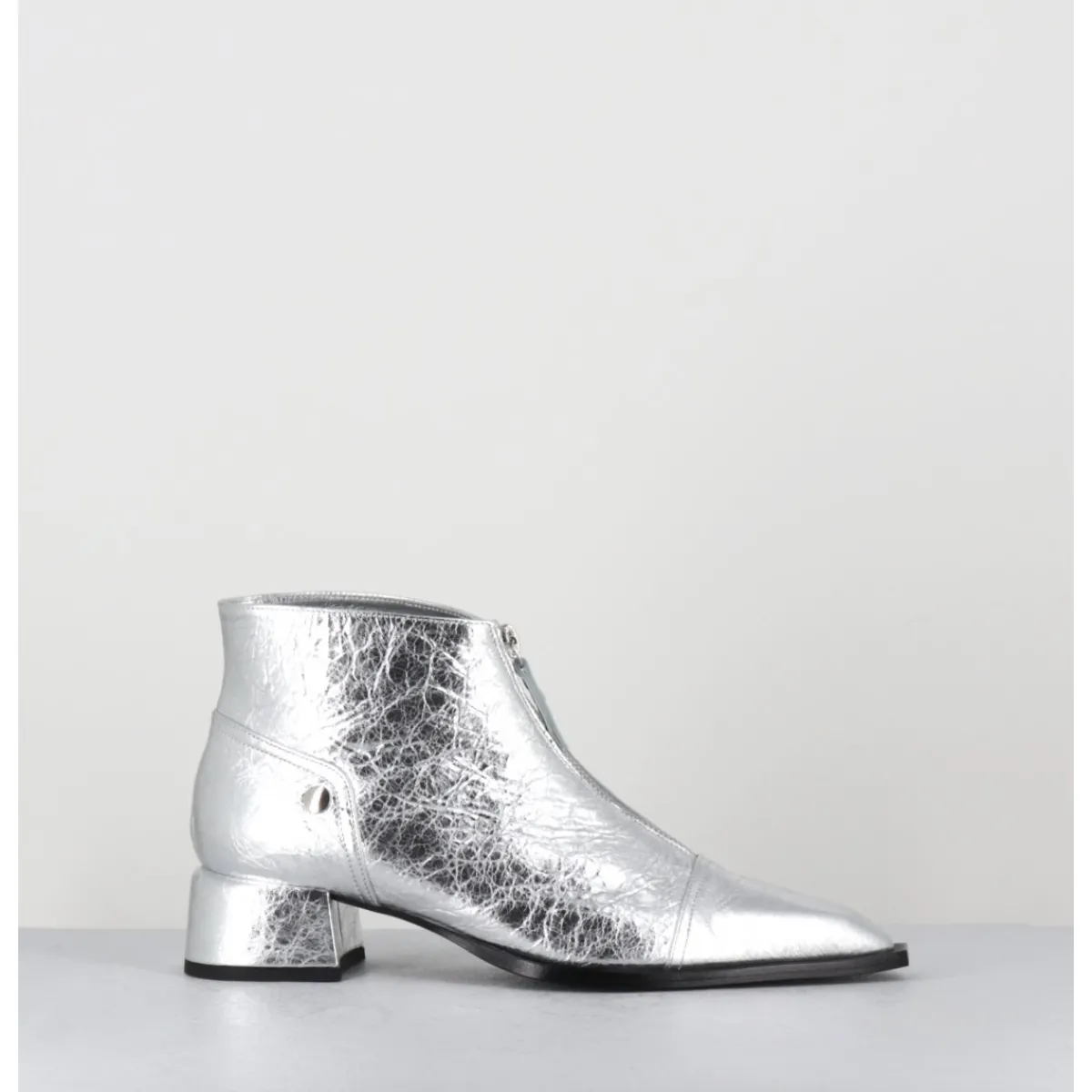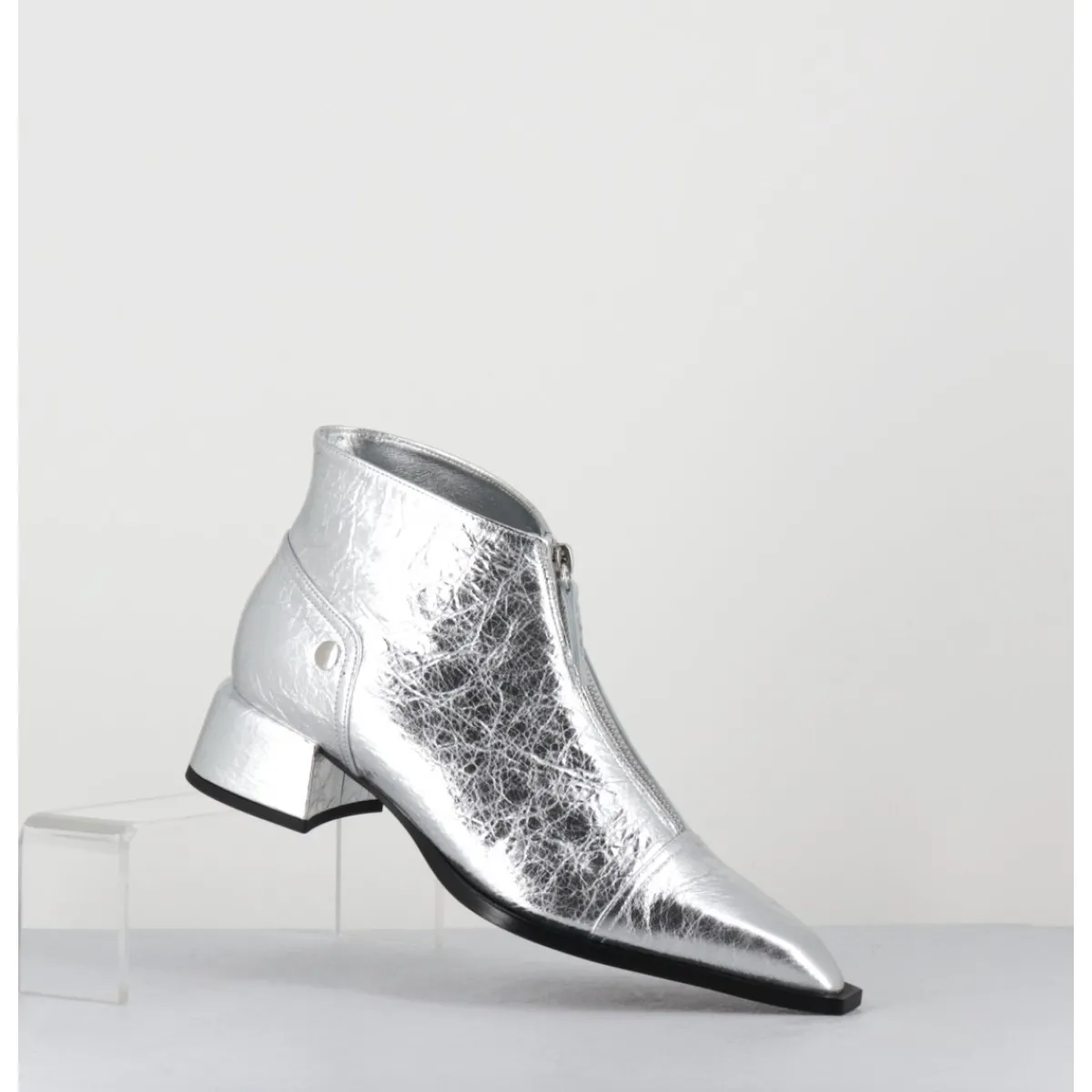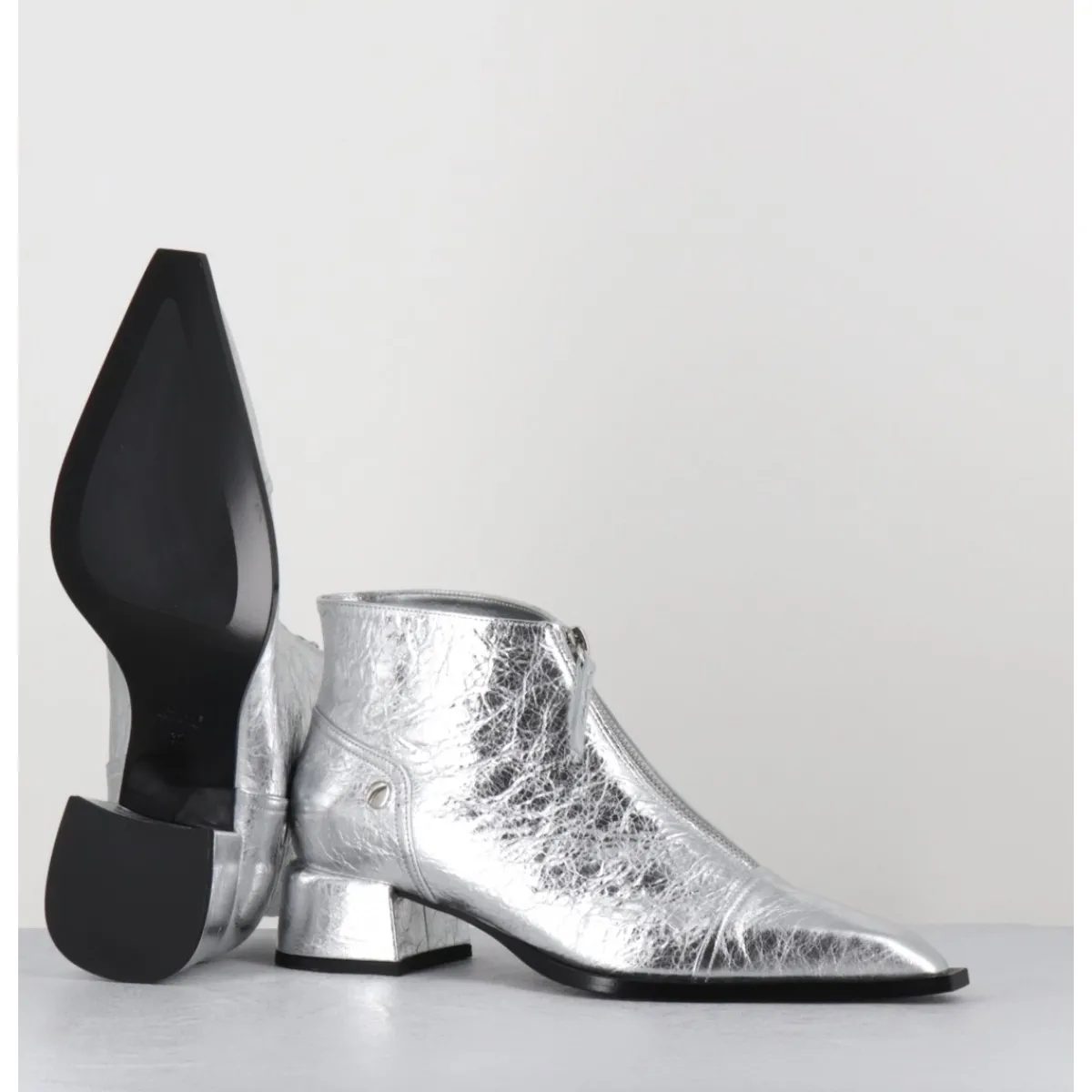 Boots en cuir métallisé argent à zip central &, bout pointu rapporté & petit talon bloc stylisé