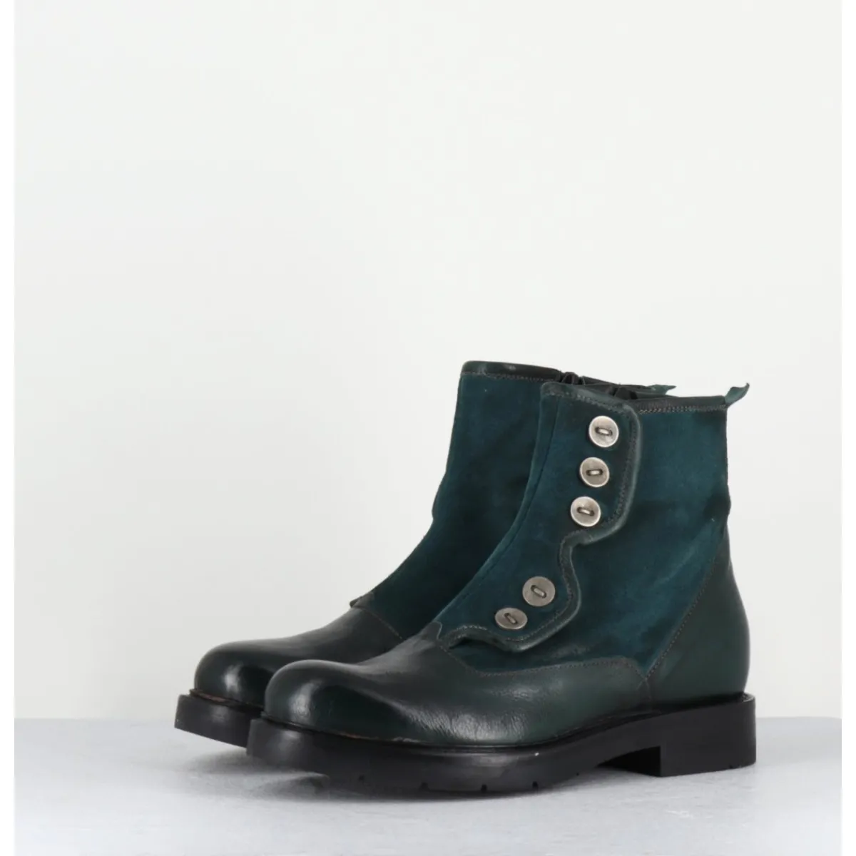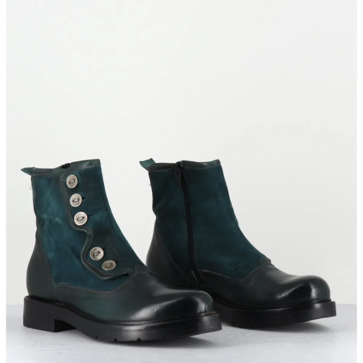 Bottines plates bi-matière en cuir vert bouteille & daim bleu pétrole, ornées de petits boutons au look vintage, bout arrondi, zip intérieur, montées sur une semelle en gomme légère