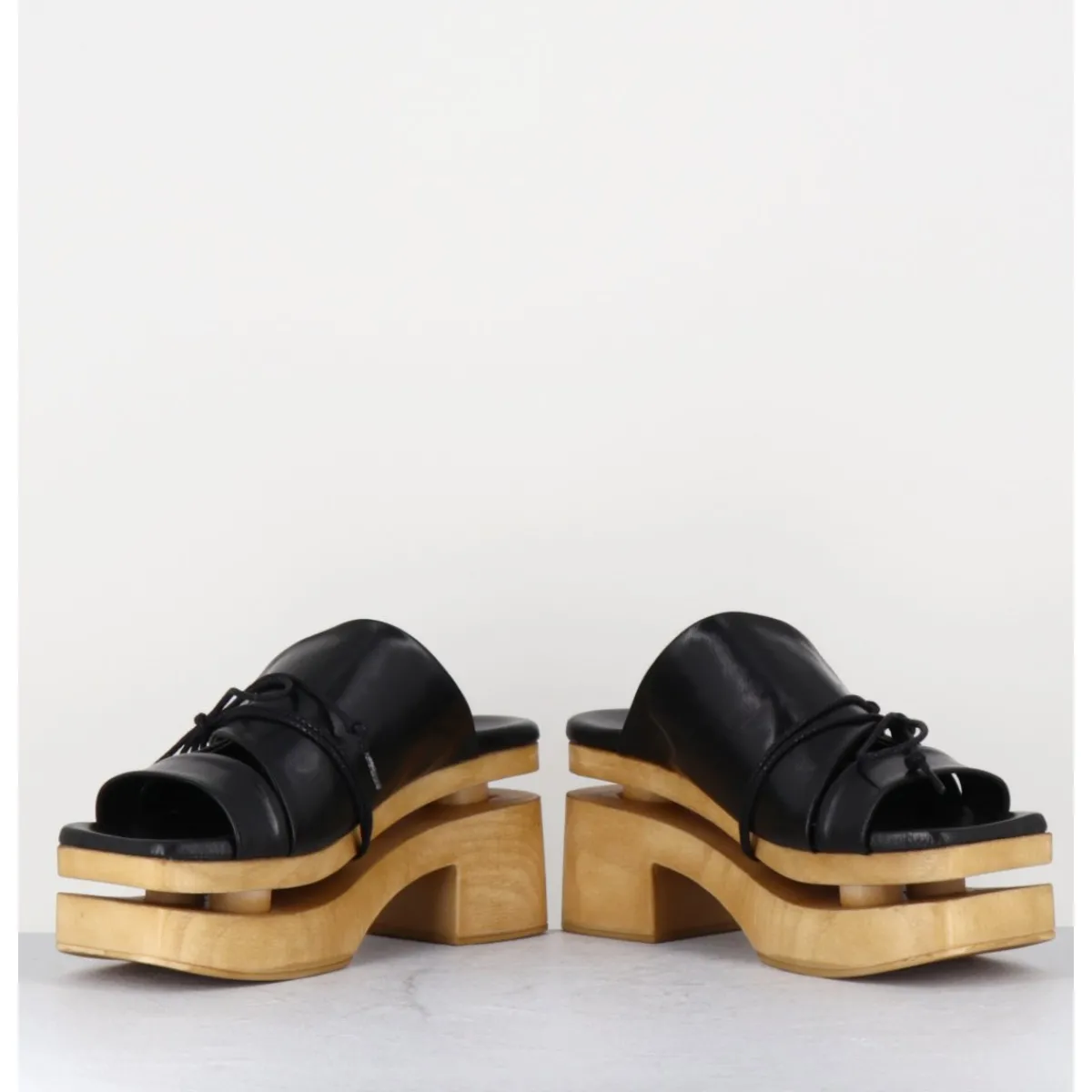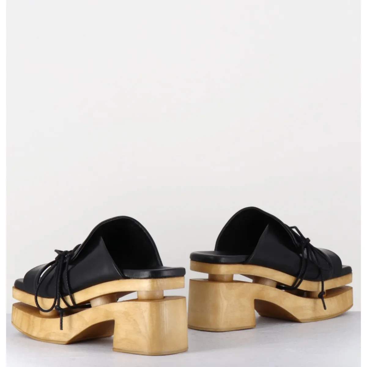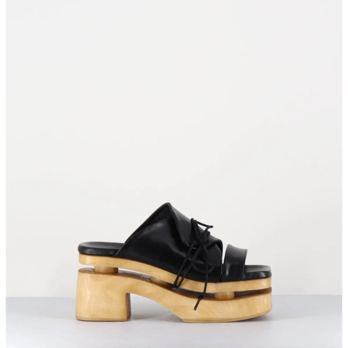 Forme originale des années 70 réalisée sur un bloc large effet bois léger, bout carré, adorable design cache-coeur en cuir noir souple avec lacets noués à la semelle, rappelant les plateformes traditionnelles japonaises