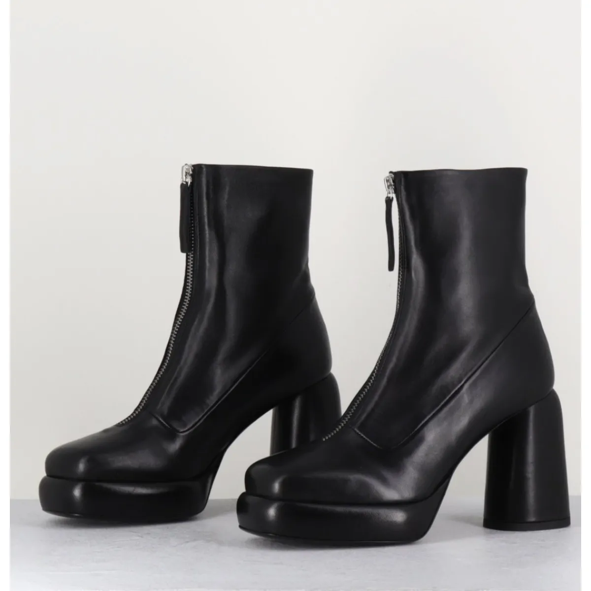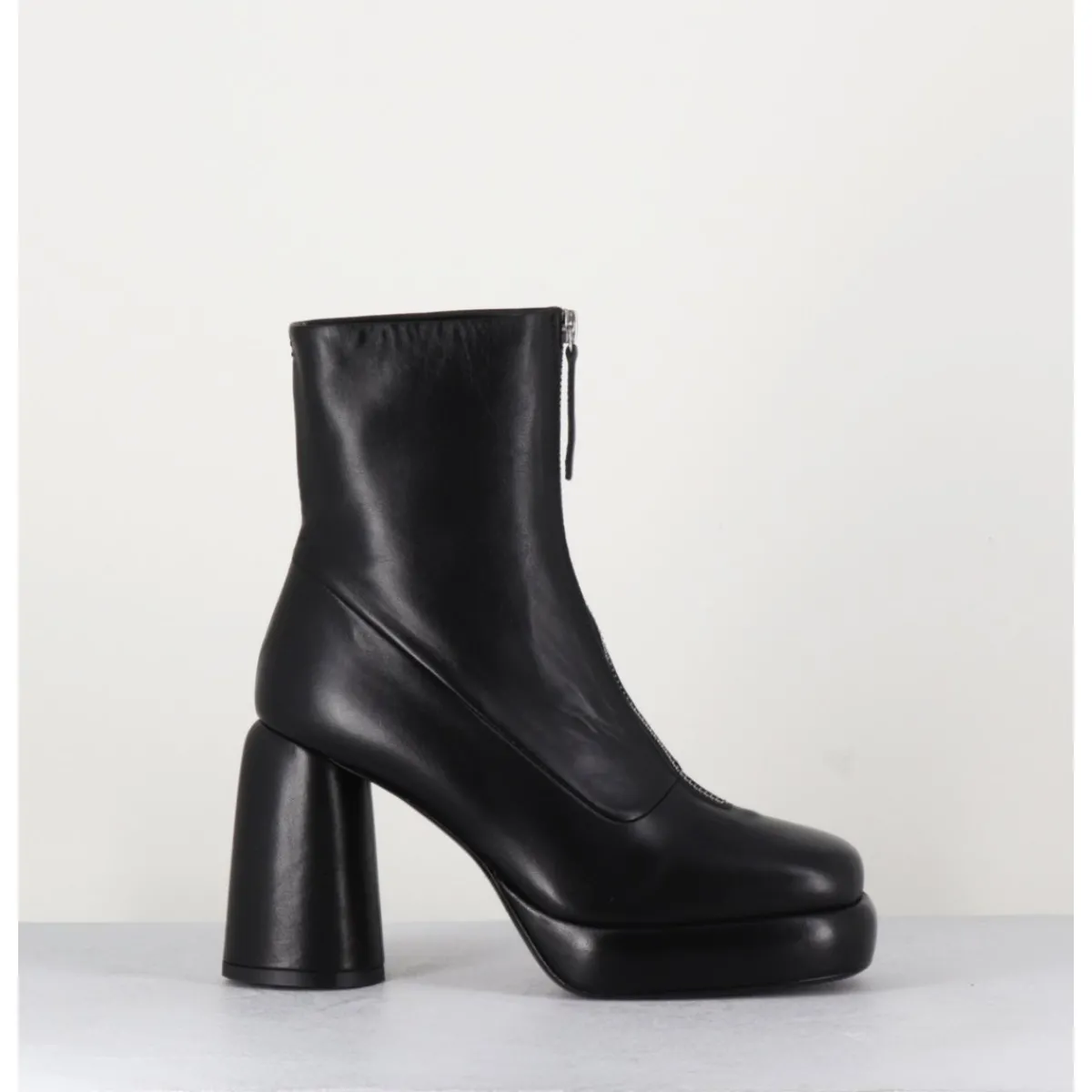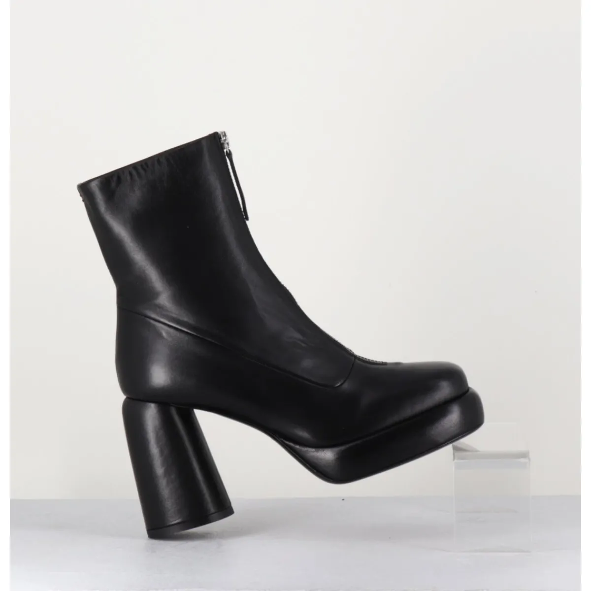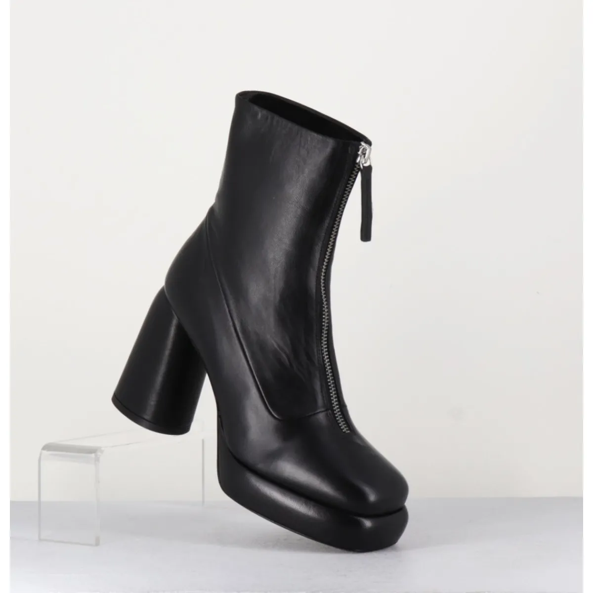 Bottines rétro en cuir noir, zip avant en métal, bout carré, montées sur une plateforme bombée ainsi que le talon cylindrique signature de la maison.