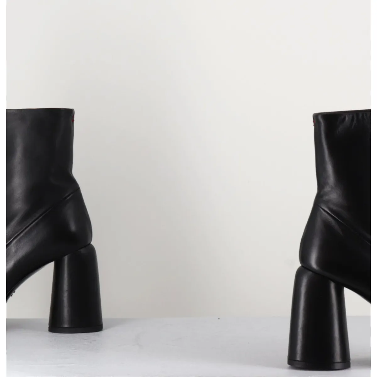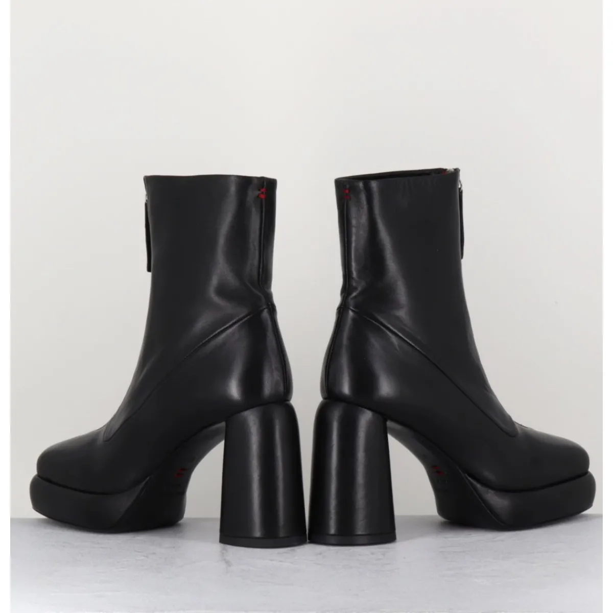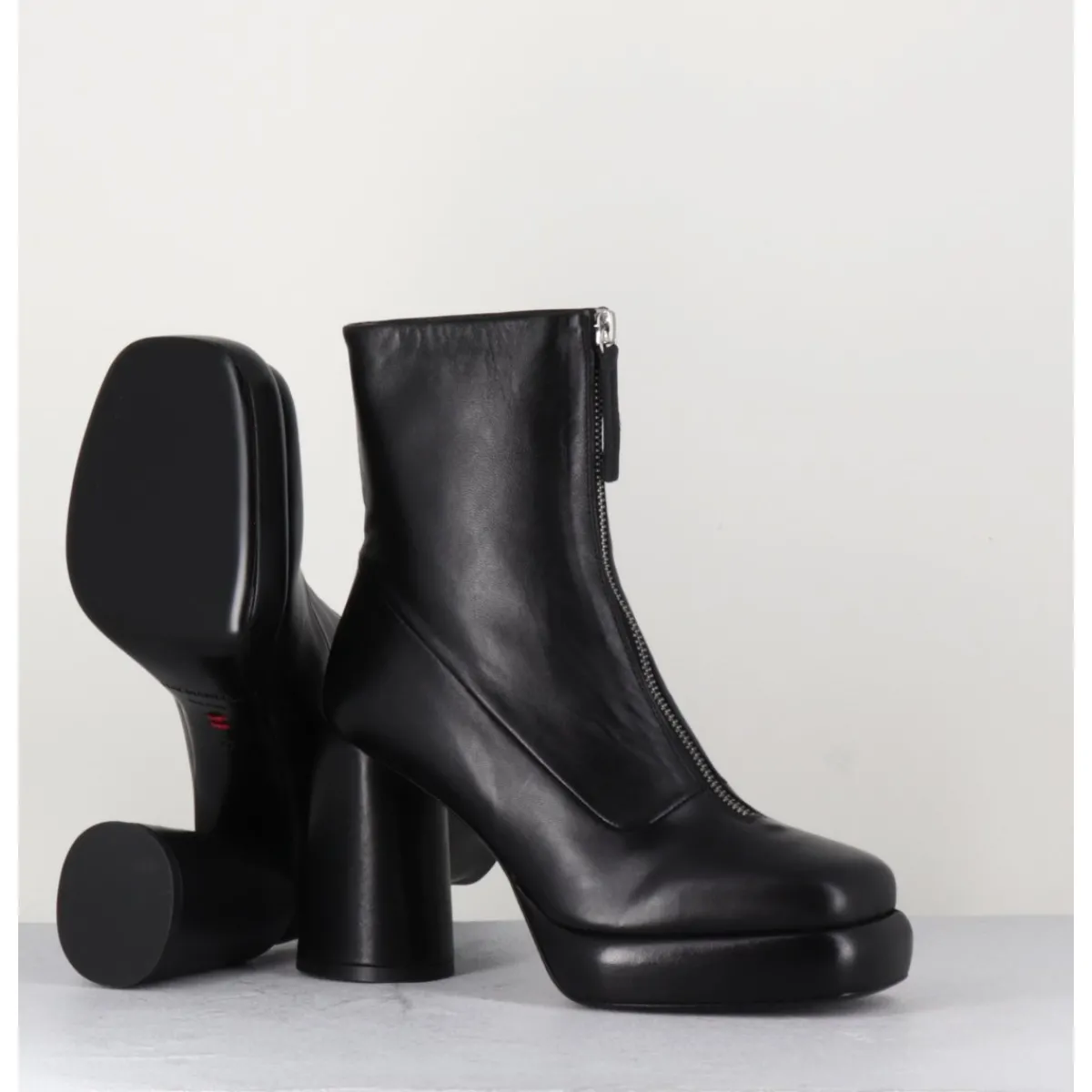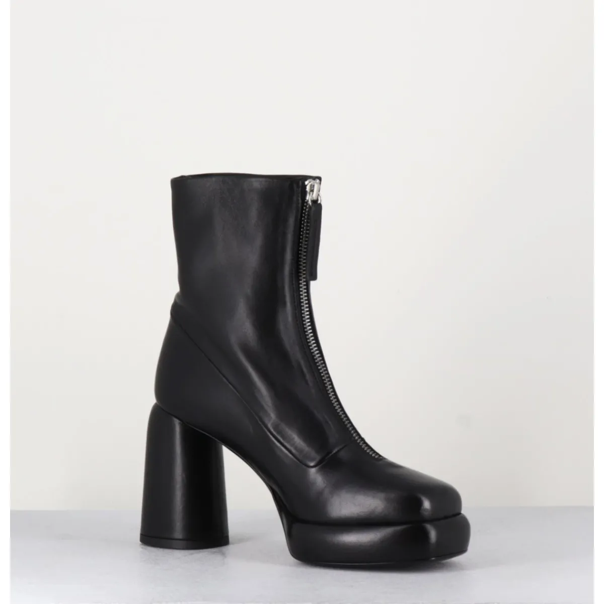 Bottines rétro en cuir noir, zip avant en métal, bout carré, montées sur une plateforme bombée ainsi que le talon cylindrique signature de la maison.