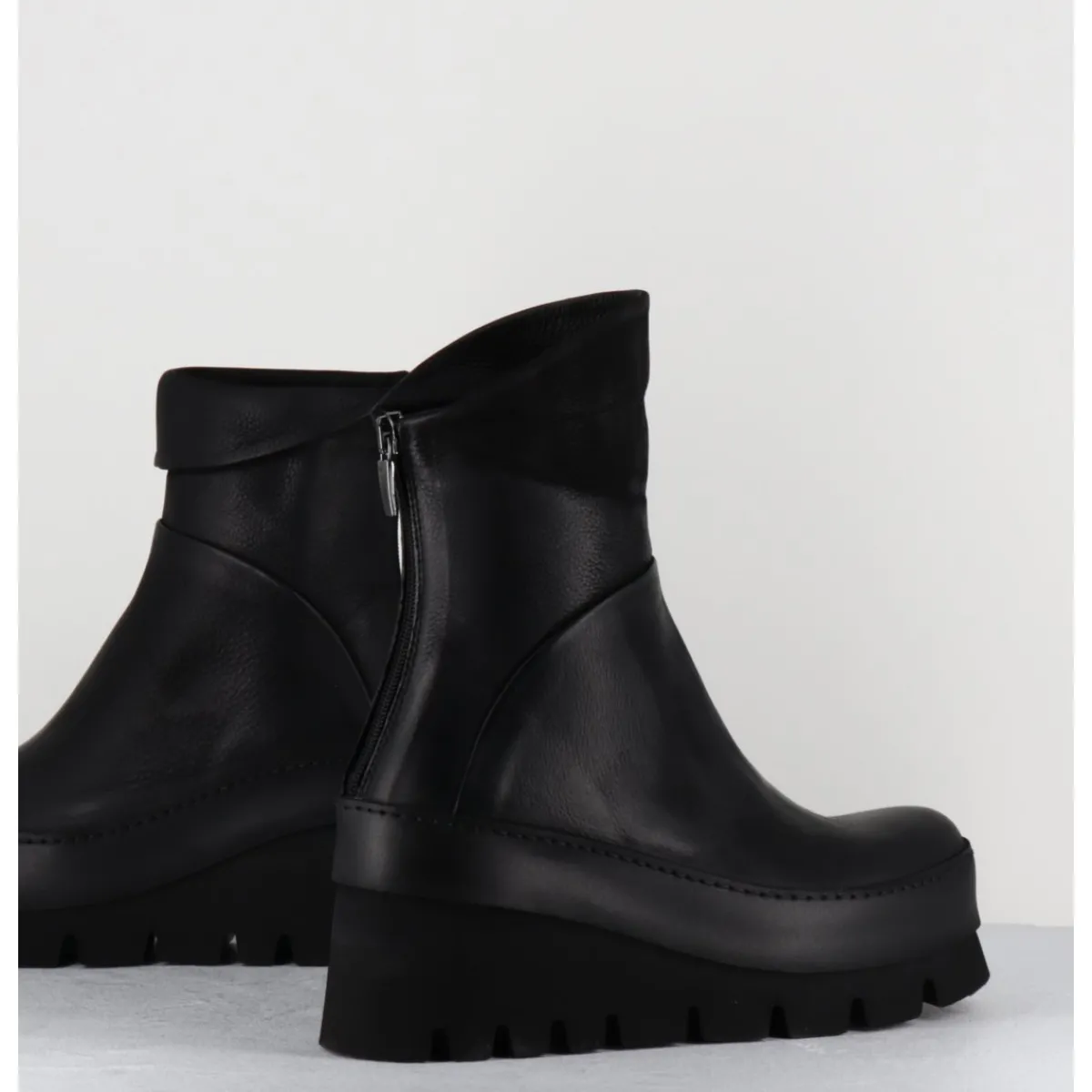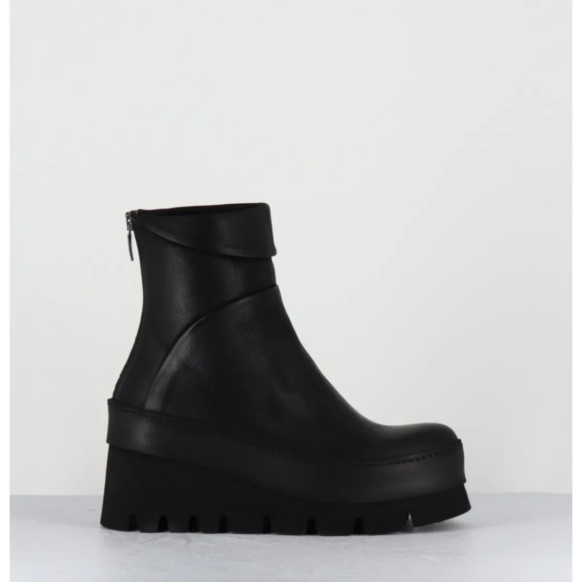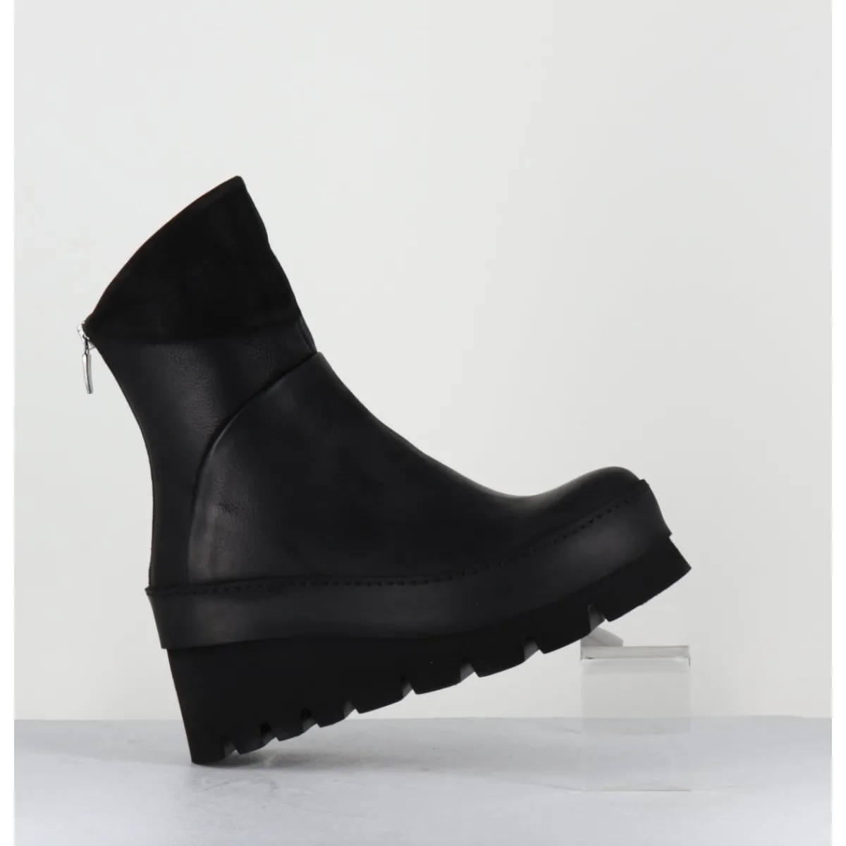 Boots compensées en cuir noir, bout arrondi, zip arrière, tige asymétrique modulable, bordure en gomme noire contrastant avec la semelle ultra légère en micro-fibre crantée esprit déstructuré