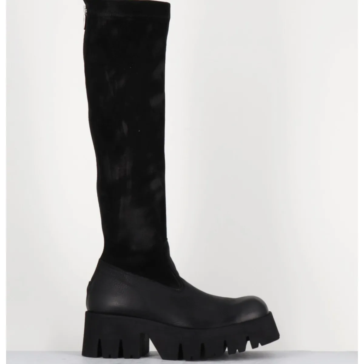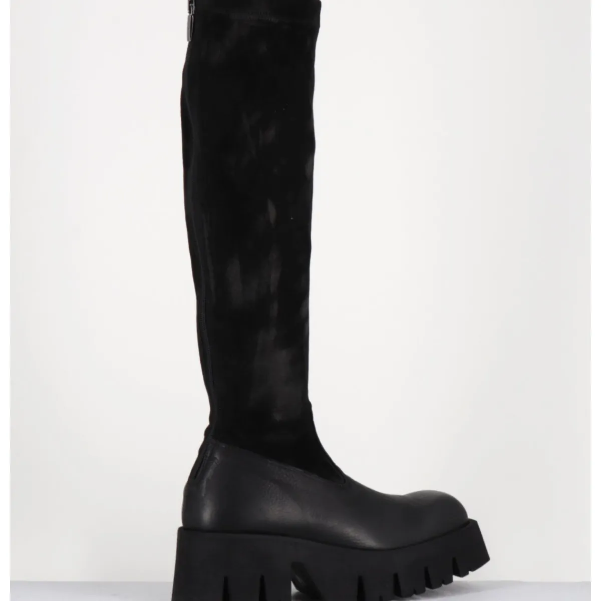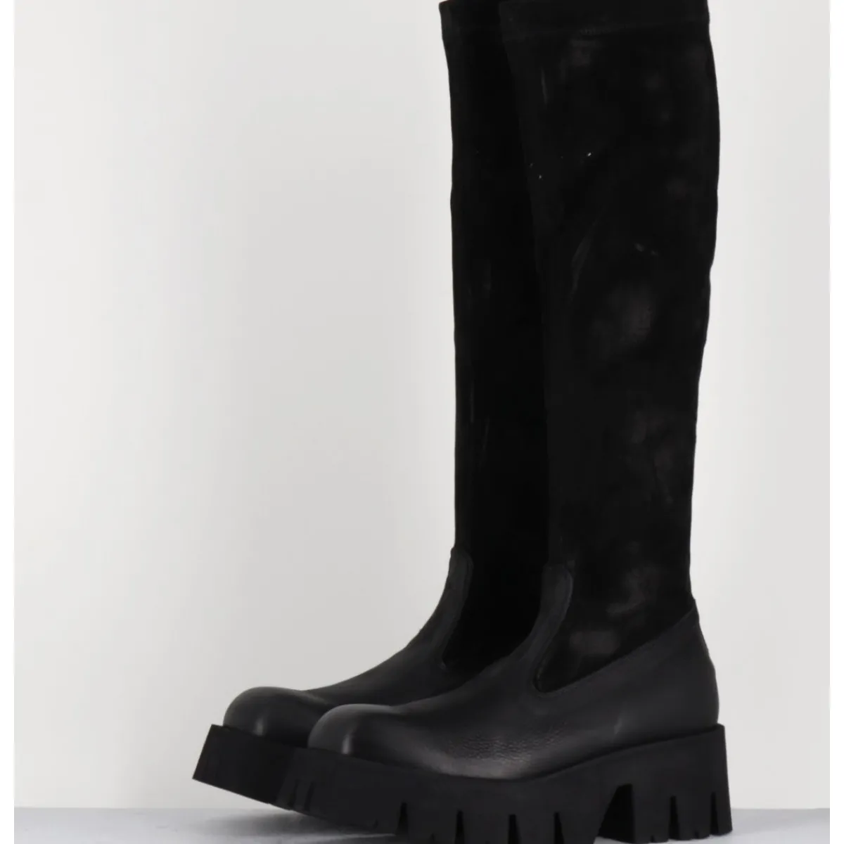 Bottes en cuir gras noir et tige en daim stretch patiné pour un effet vieilli, zip extérieur invisible, forme carré large structuré, montées sur une semelle épaisse en micro-fibre ultra légère crantée pour plus de flexibilité, d’un grand confort