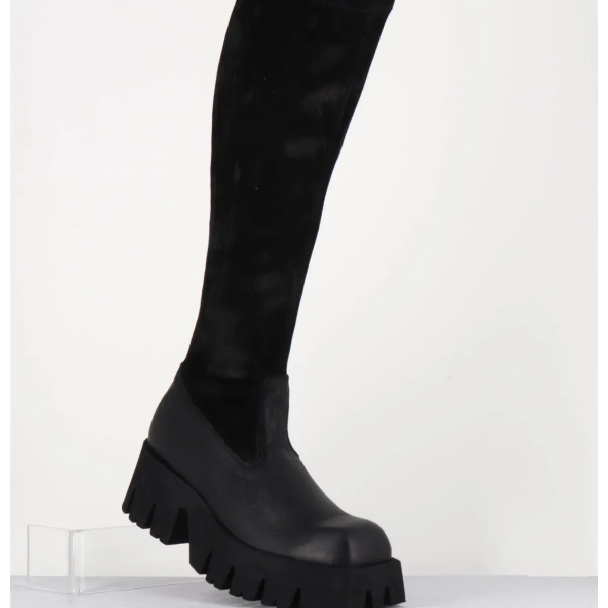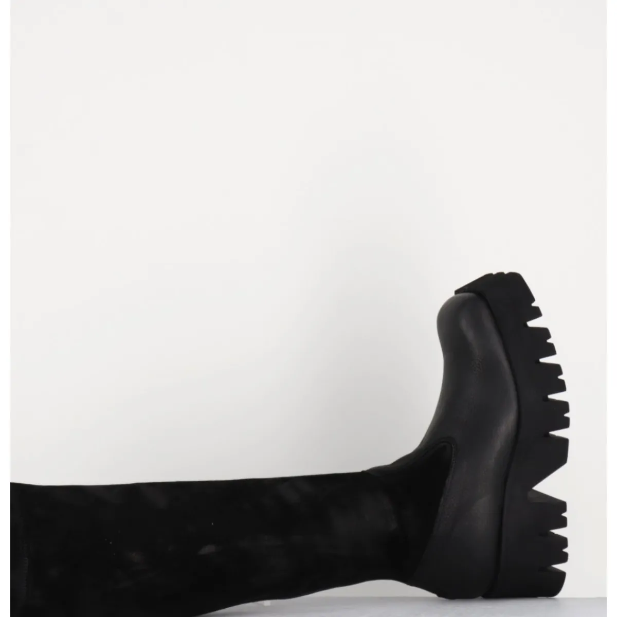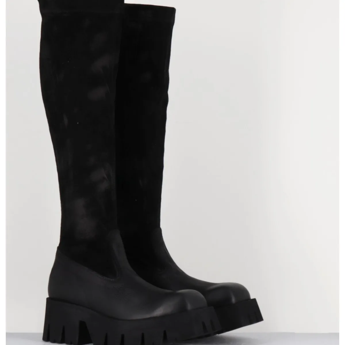 Bottes en cuir gras noir et tige en daim stretch patiné pour un effet vieilli, zip extérieur invisible, forme carré large structuré, montées sur une semelle épaisse en micro-fibre ultra légère crantée pour plus de flexibilité, d’un grand confort