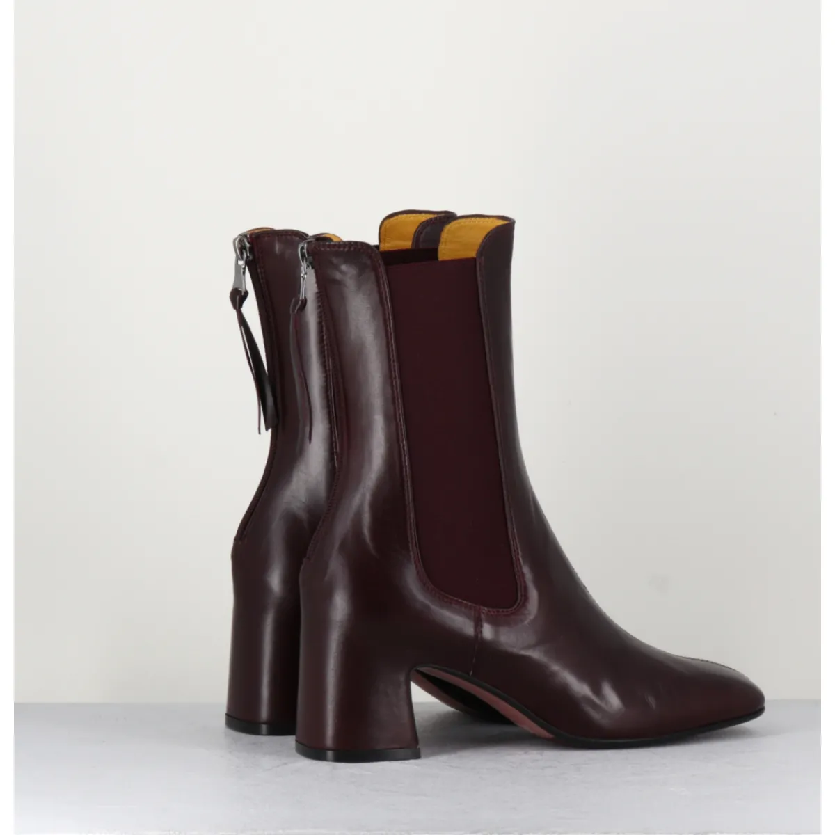 Boots en cuir bordeaux extrêmement souple avec élastiques, bout carré doux, zip arrière, montées sur un petit talon carré esprit 70s. Chic & confortable !