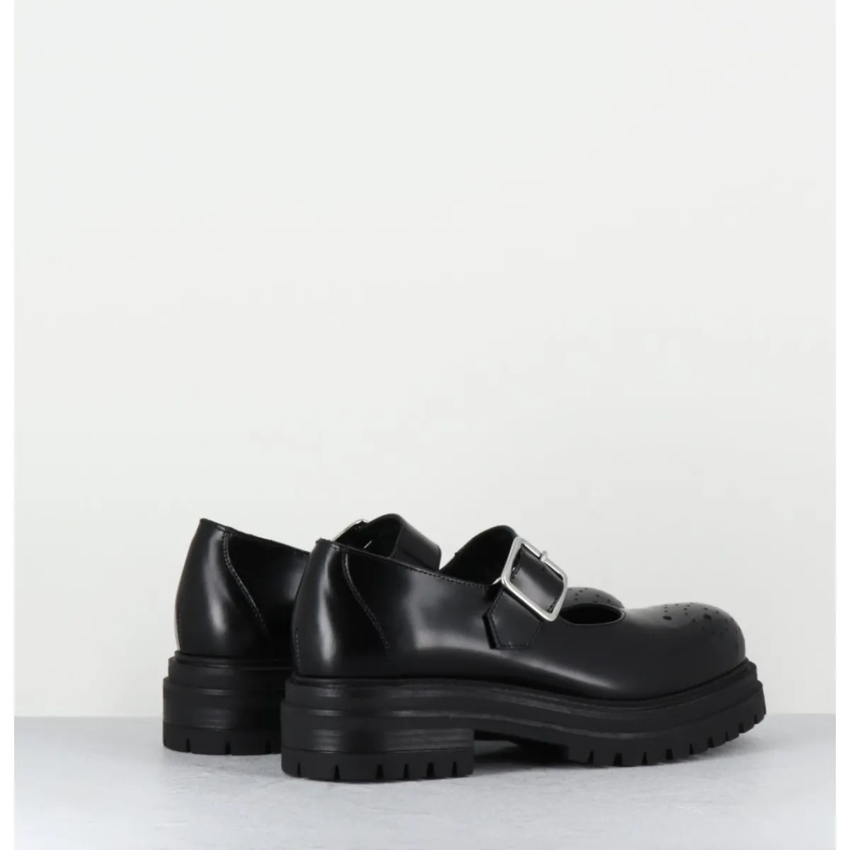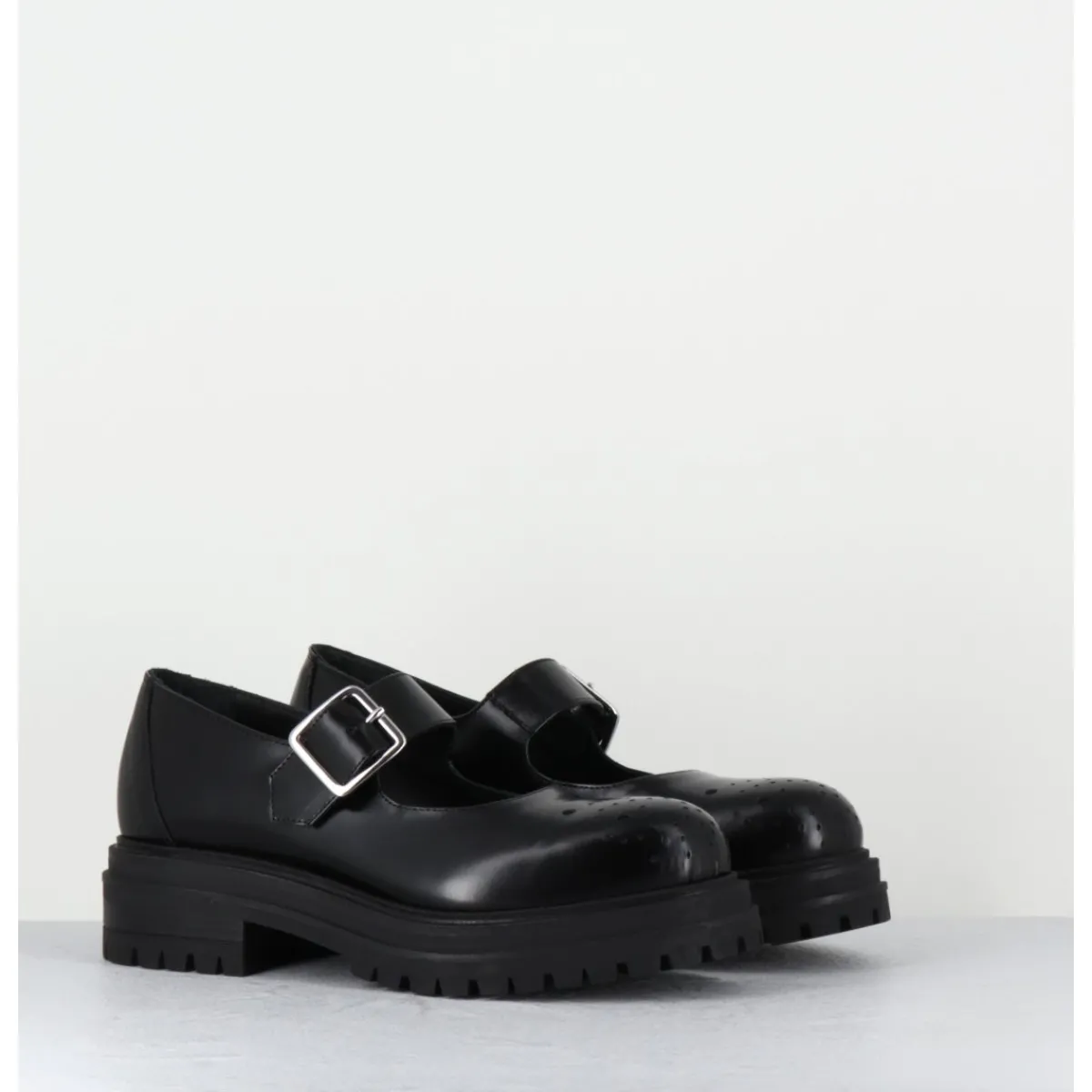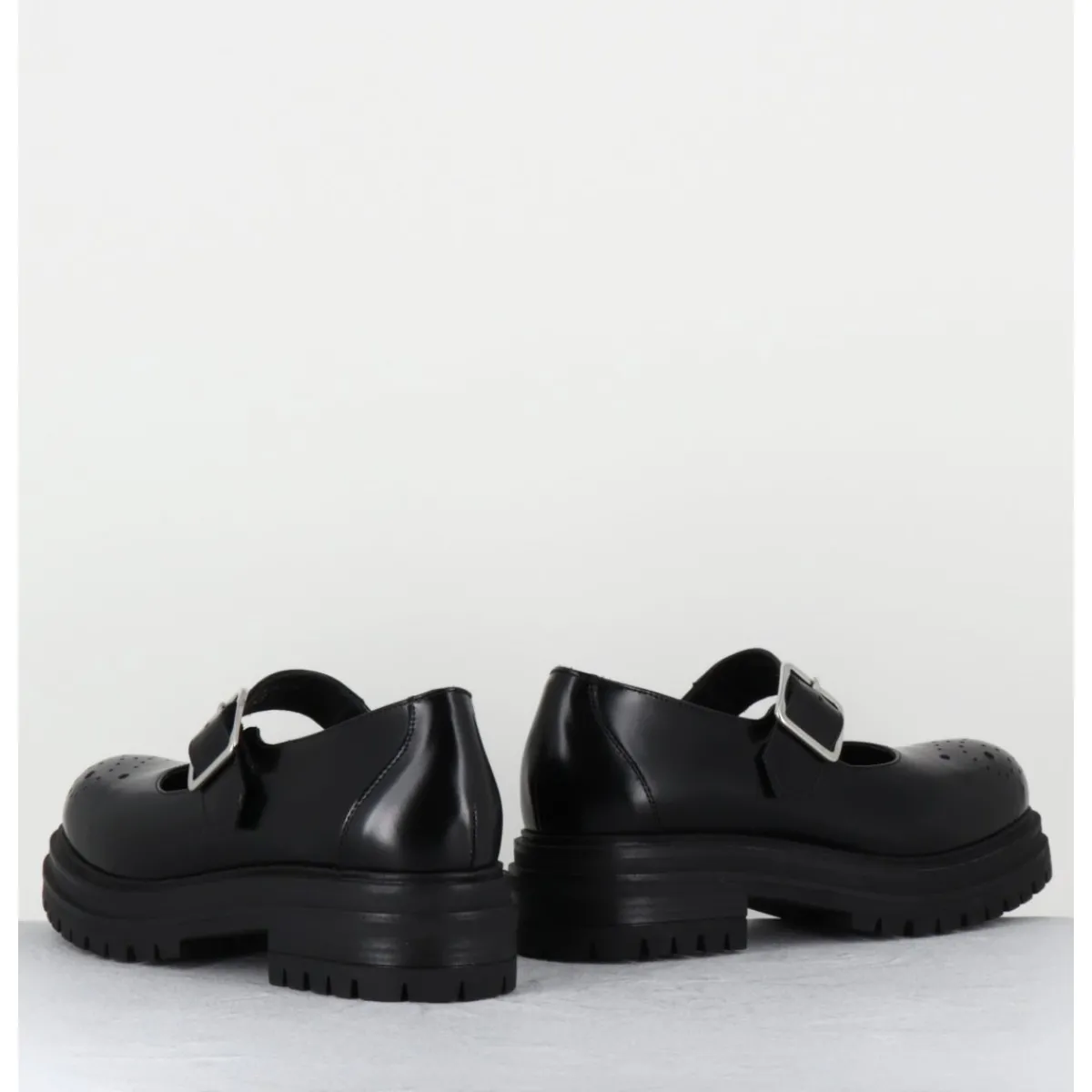 Babies Mary-Jane en cuir glacé noir, bout fleuri, large bride à boucle réglable, montées sur une double-semelle en gomme crantée