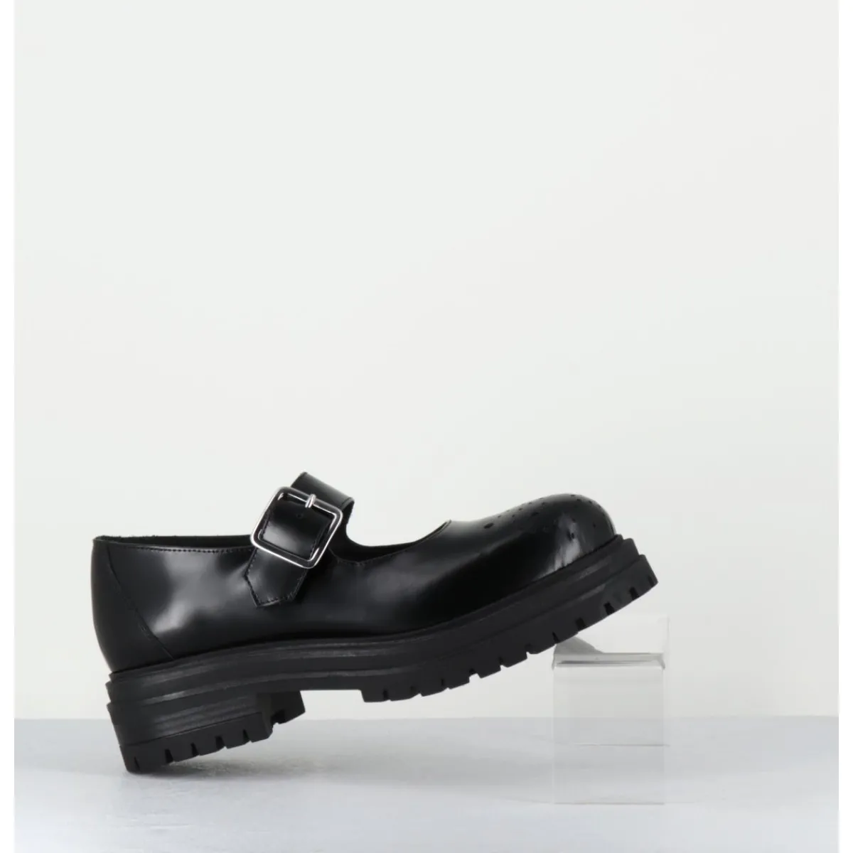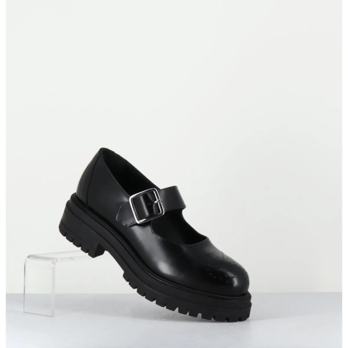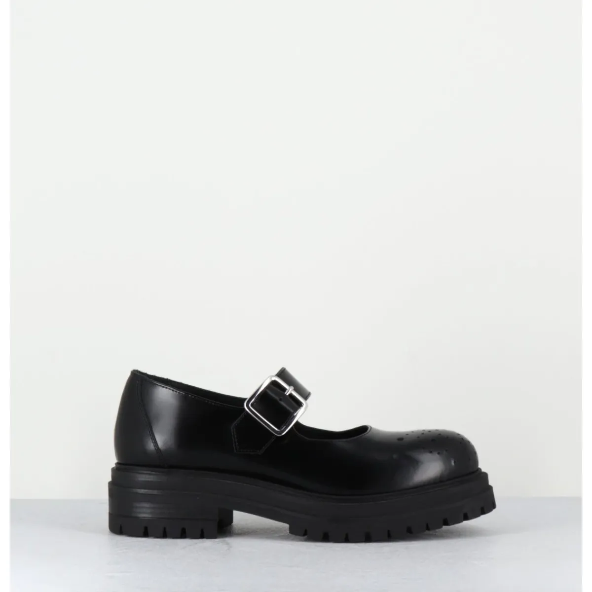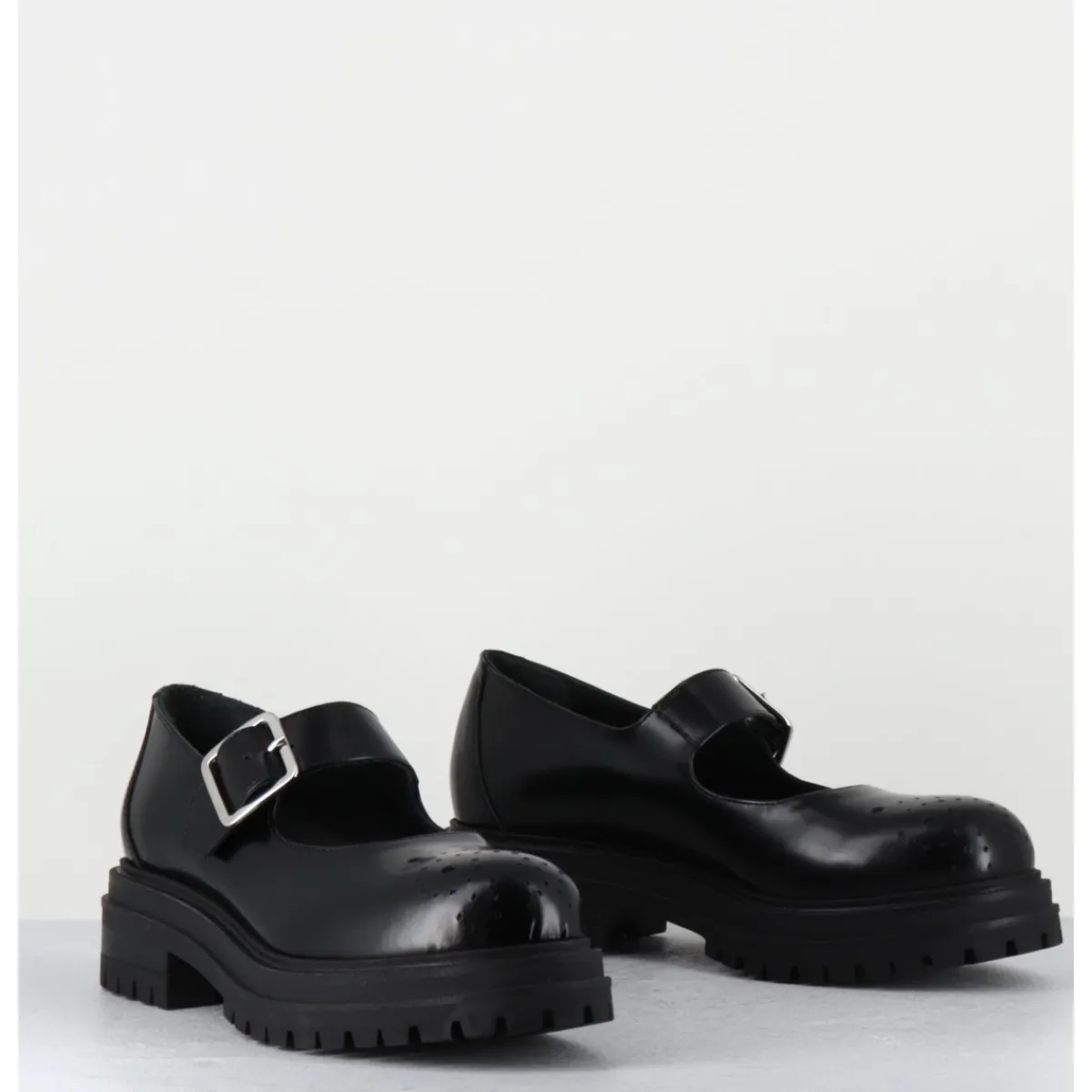 Babies Mary-Jane en cuir glacé noir, bout fleuri, large bride à boucle réglable, montées sur une double-semelle en gomme crantée