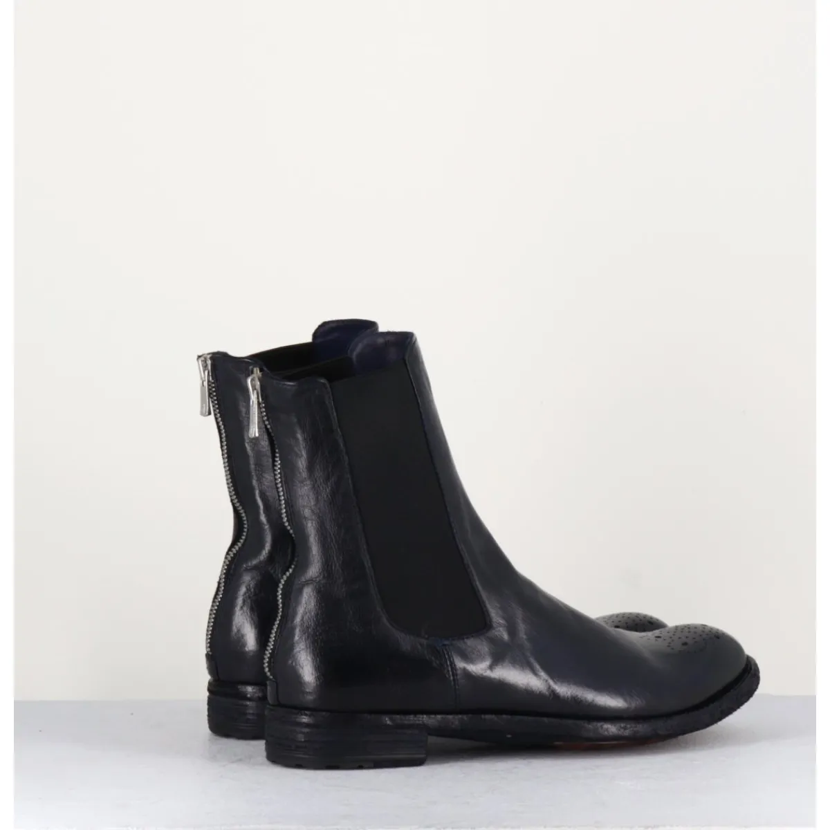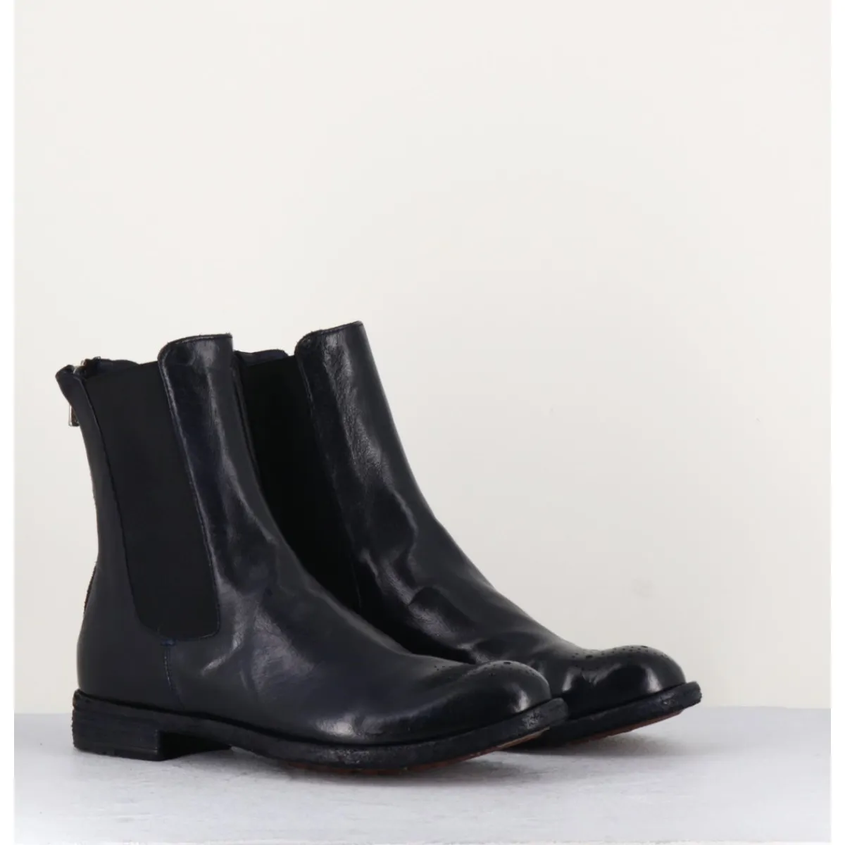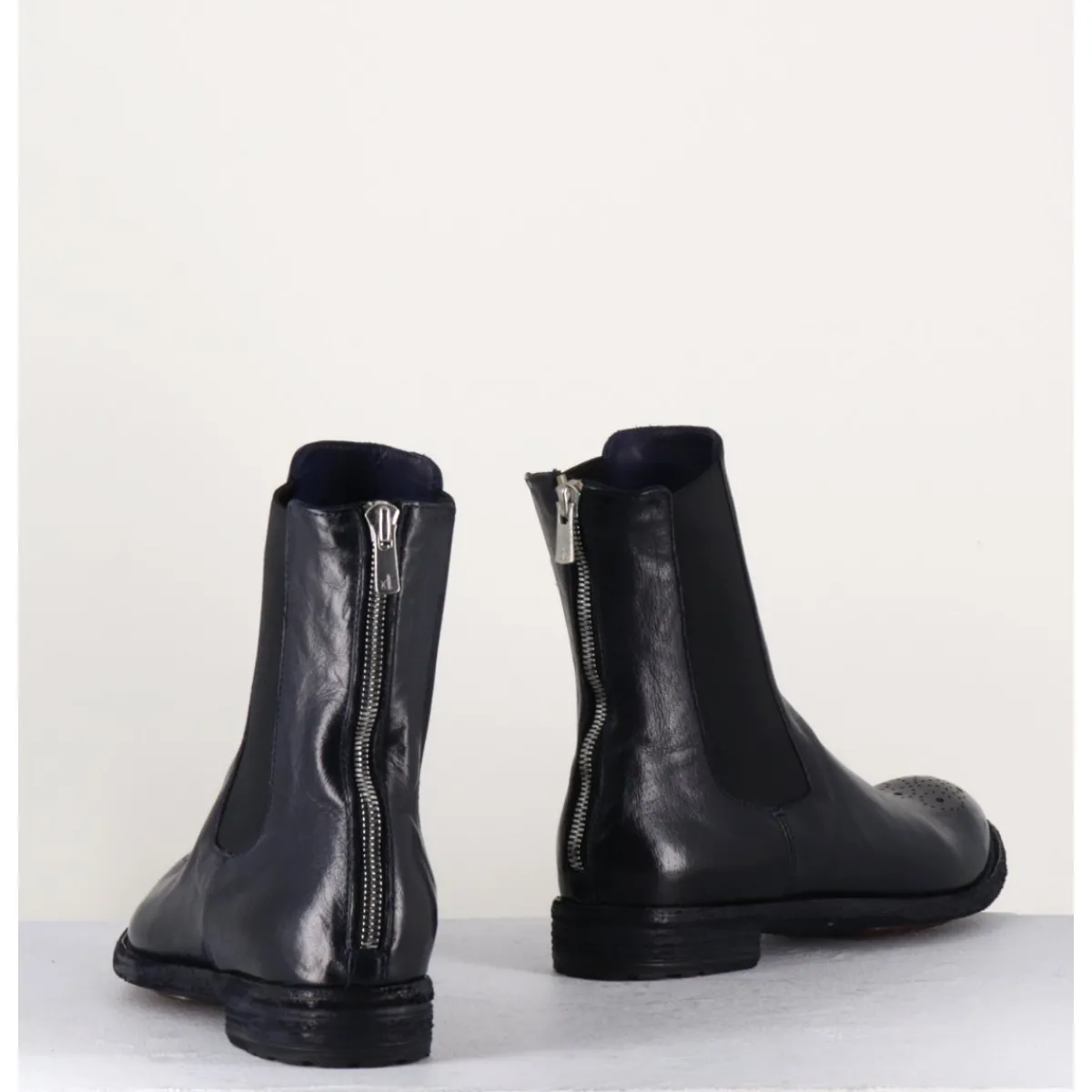 Bottines plates en cuir souple bleu marine Navy à élastique Chelsea et zip arrière, bout en amande fleuri, montées sur une semelle flexible cousue main avec insert de gomme