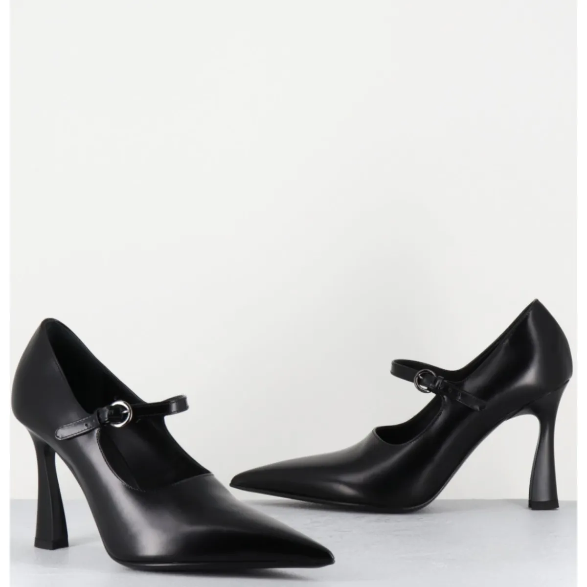 Escarpins bout pointu en cuir légèrement glacé noir, bride sur le cou-de-pied réglable, ligne pure, montées sur un talon fin stylisé & laqué mat