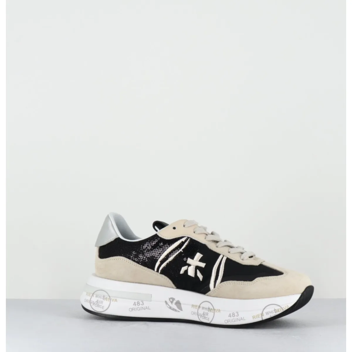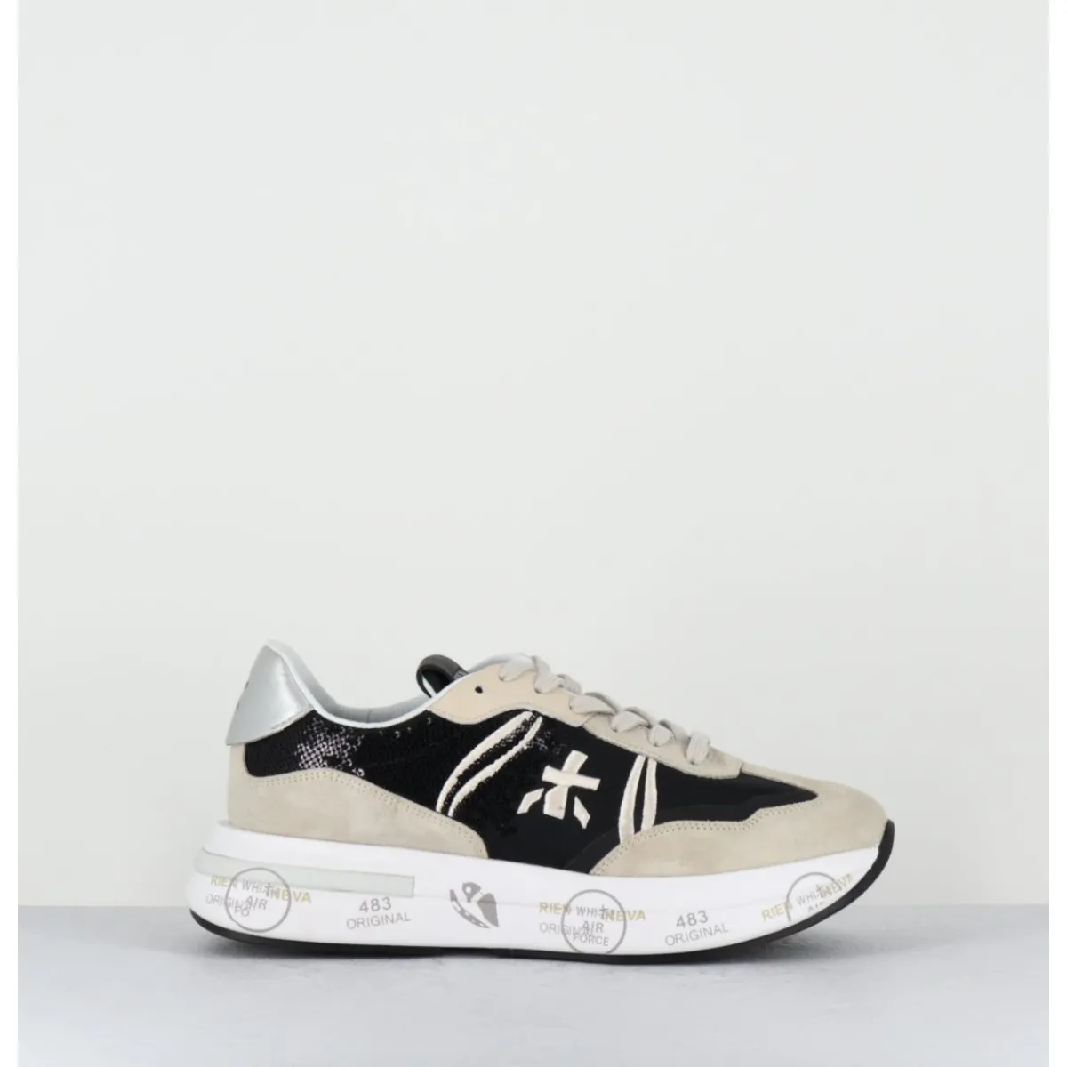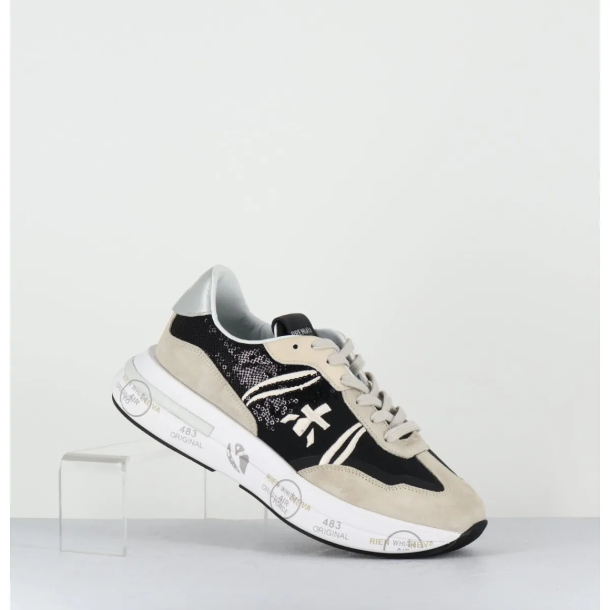Sneakers semelle ultra light innovante chez Premiata, daim & toile nylon noir, avec empiècement à sequins noirs, montées sur une semelle épaisse blanche en micro fibre, avec imprimé signature de la Maison Italienne Premiata.