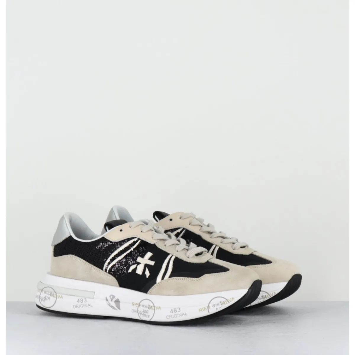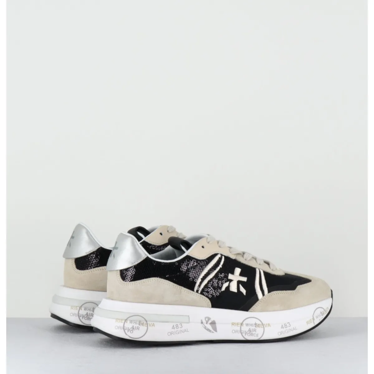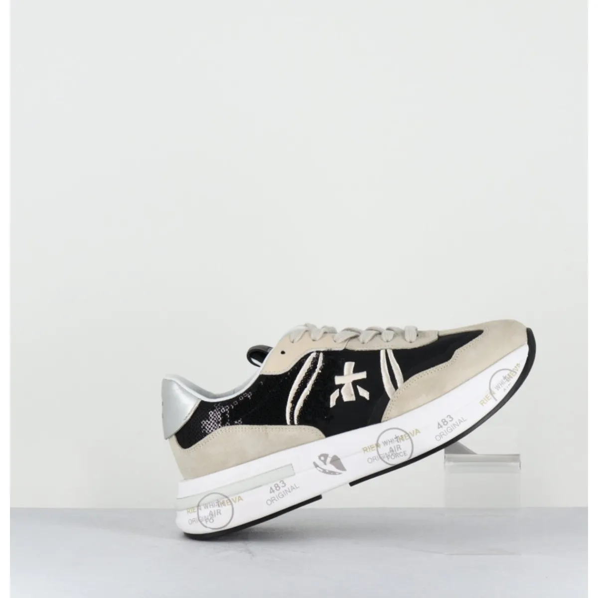 Sneakers semelle ultra light innovante chez Premiata, daim & toile nylon noir, avec empiècement à sequins noirs, montées sur une semelle épaisse blanche en micro fibre, avec imprimé signature de la Maison Italienne Premiata.