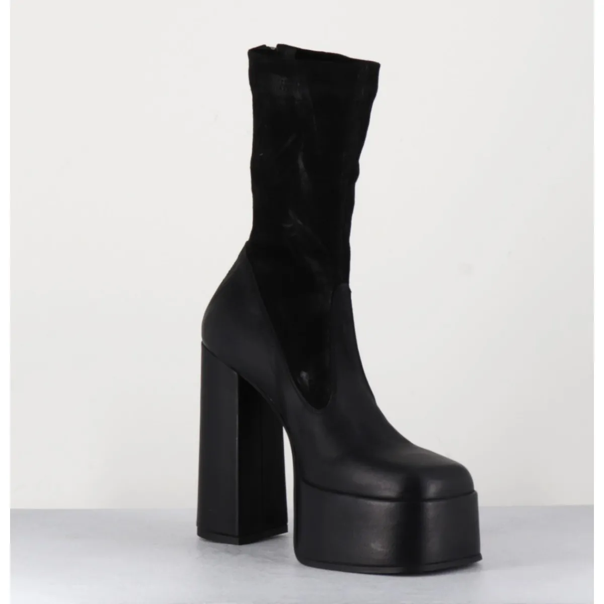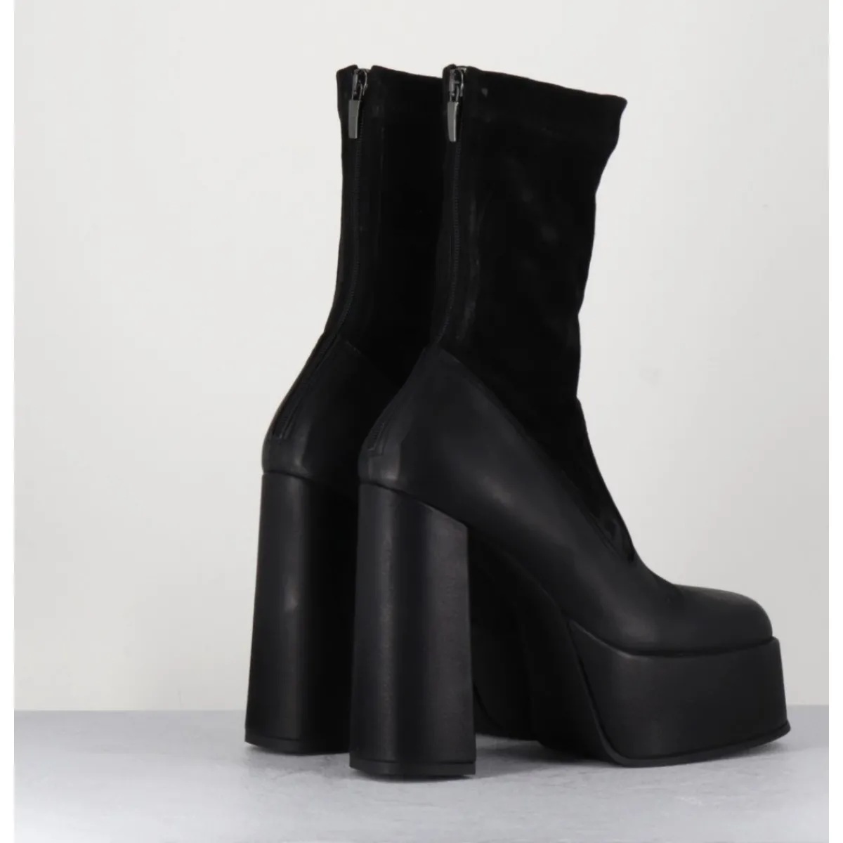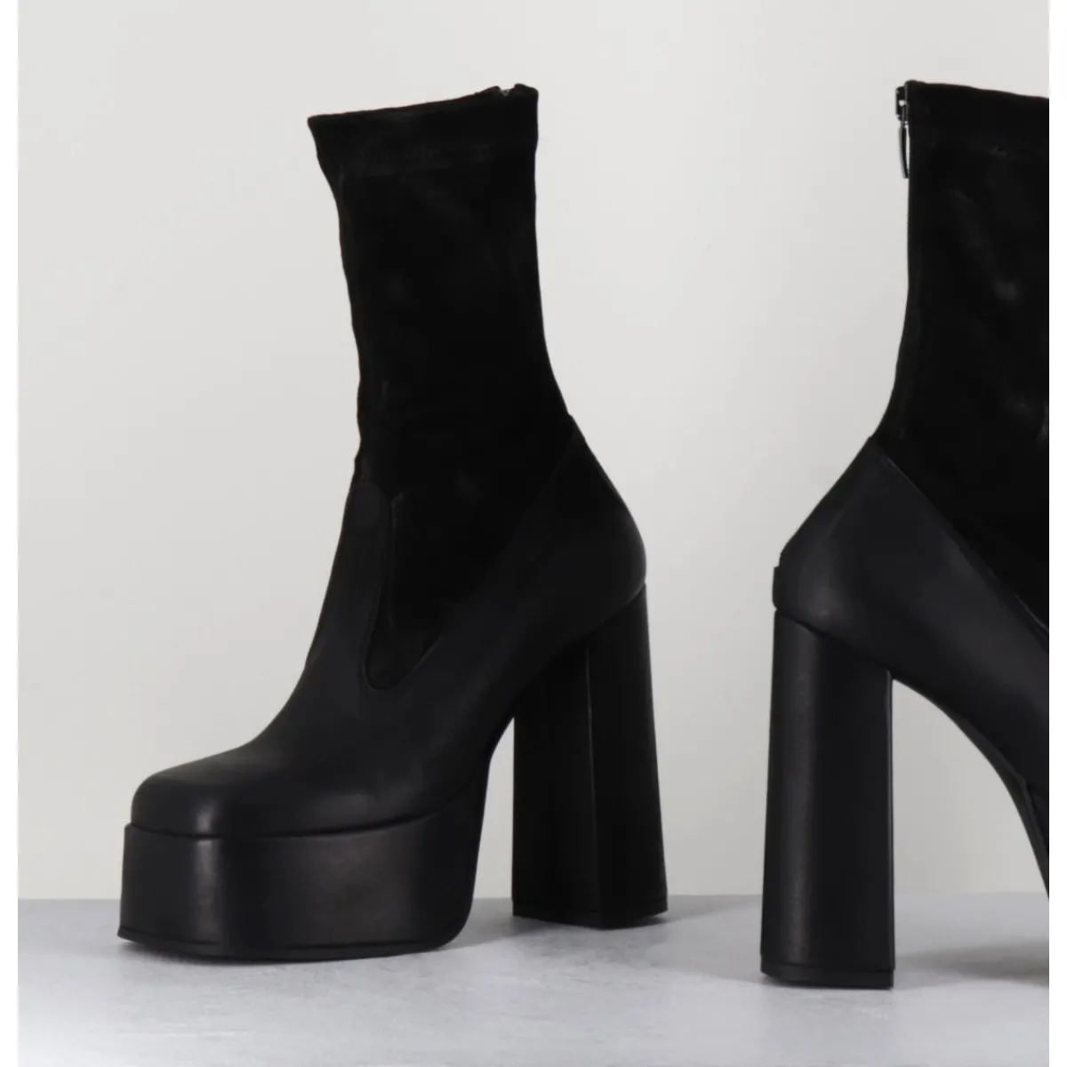 Boots à plateforme en cuir gras noir, bout carré esprit années 90, tige en cuir nubuck patiné noir, zip arrière, montées sur un haut talon large.