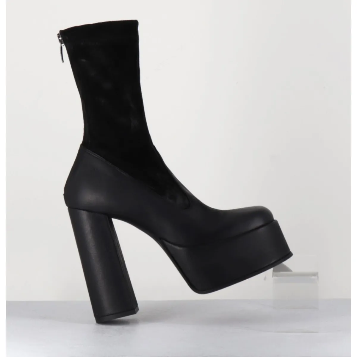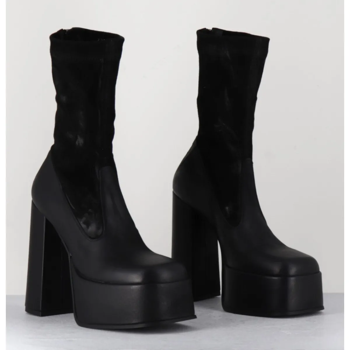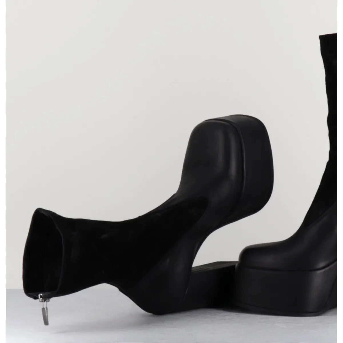 Boots à plateforme en cuir gras noir, bout carré esprit années 90, tige en cuir nubuck patiné noir, zip arrière, montées sur un haut talon large.