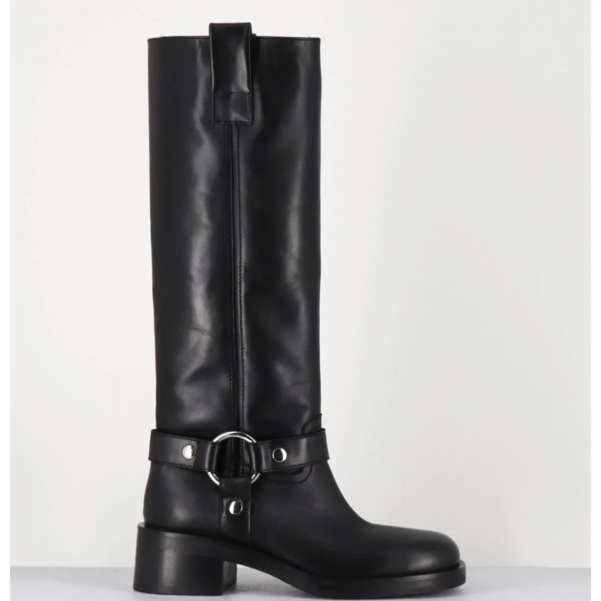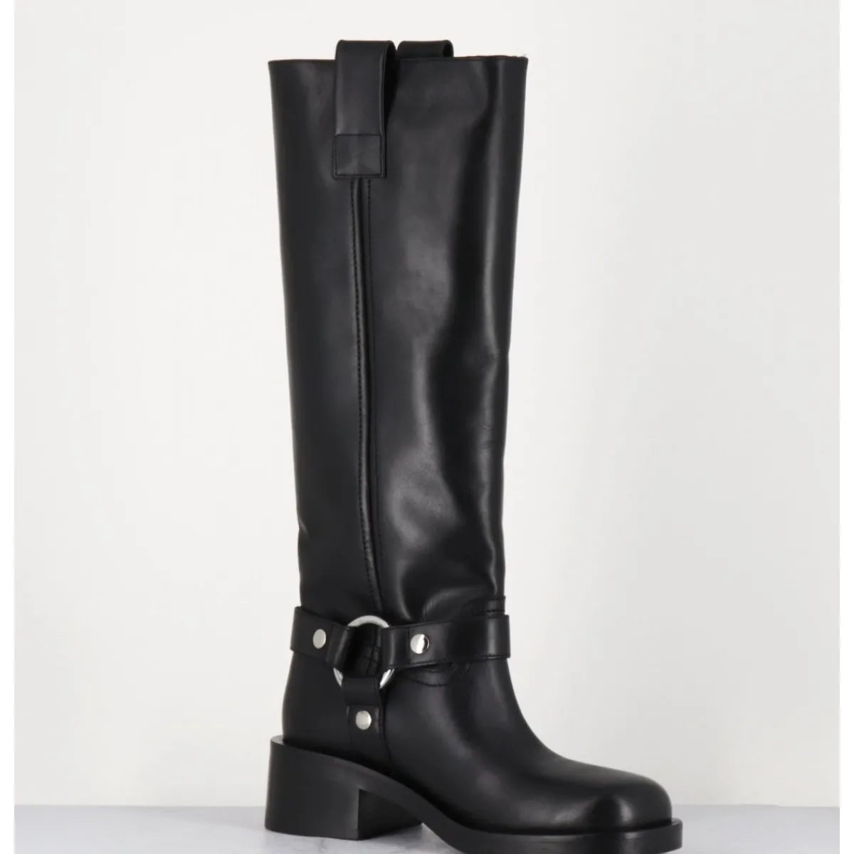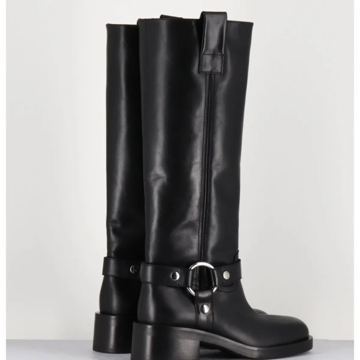 Bottes en cuir noir esprit biker avec boucle cheville, tige tubulaire, montées sur un talon bloc confortable