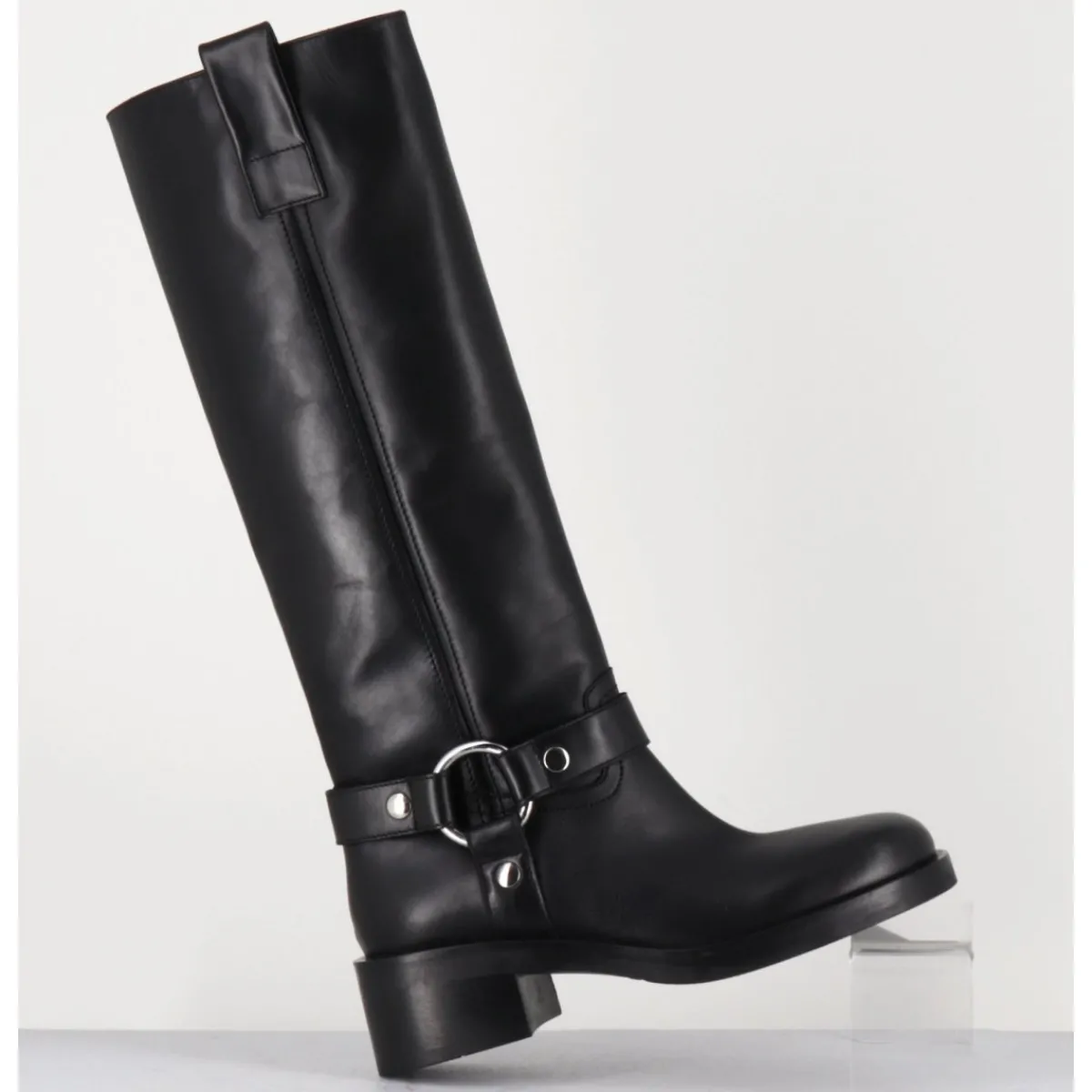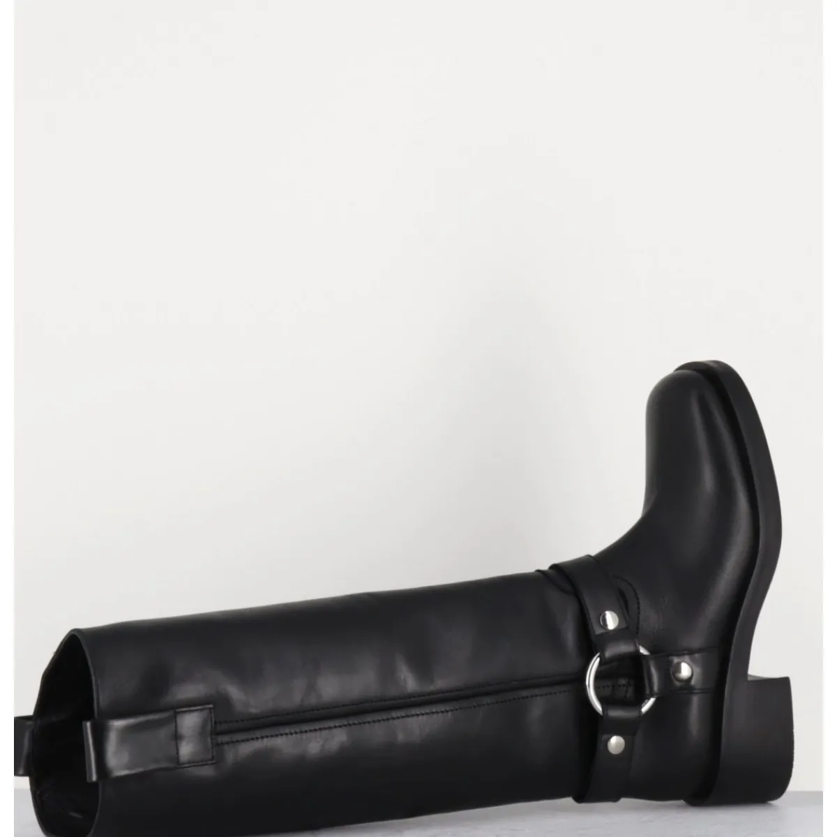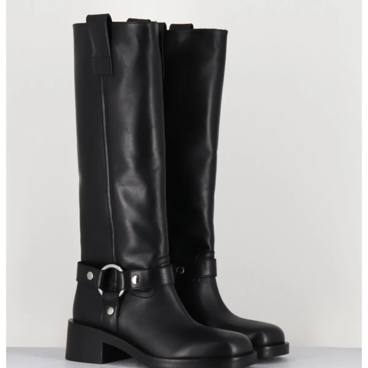 Bottes en cuir noir esprit biker avec boucle cheville, tige tubulaire, montées sur un talon bloc confortable