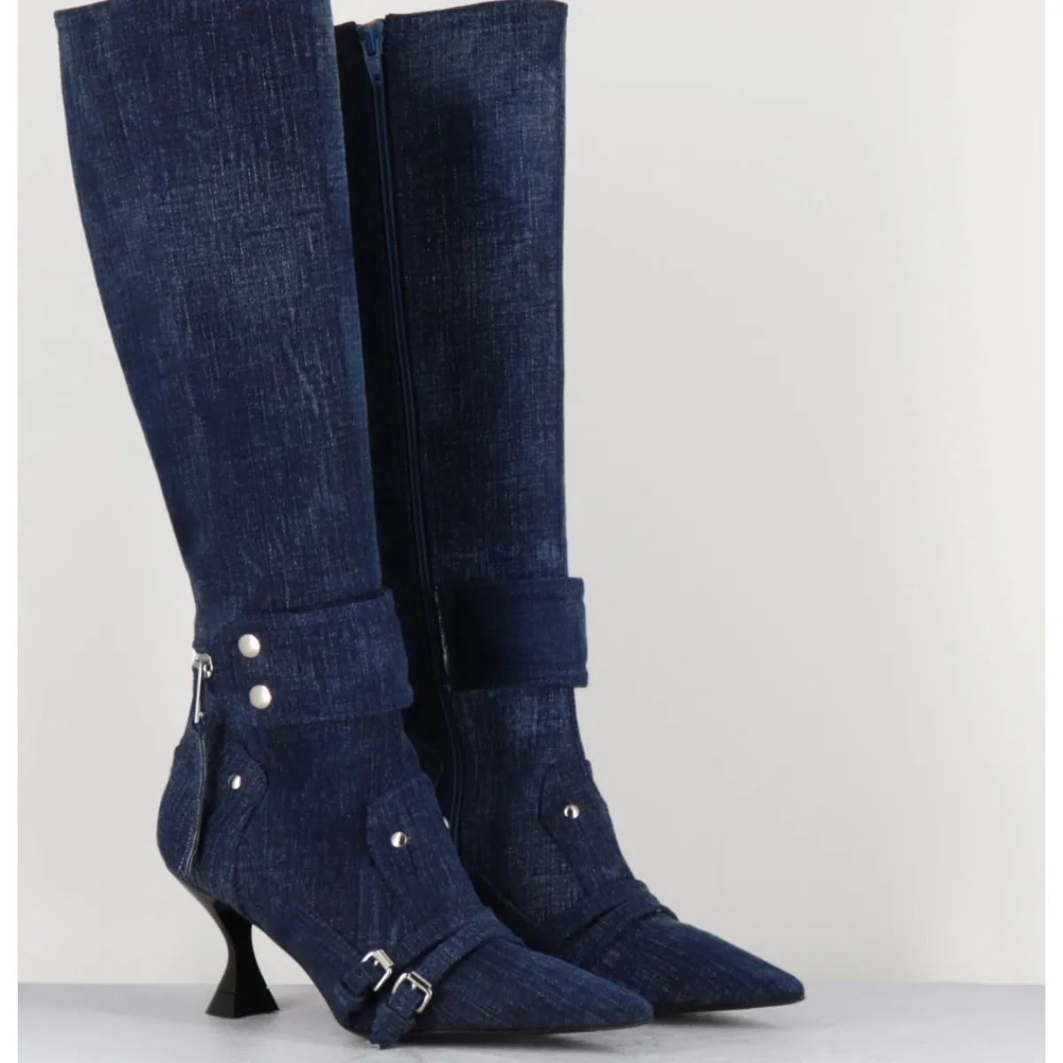 Bottes bout pointu en jean bleu, ornées de rivets, de petites boucles à l’avant et d’un zip à l’arrière imitant la construction d’un jean, montées sur un talon stylisé et laqué noir & blanc