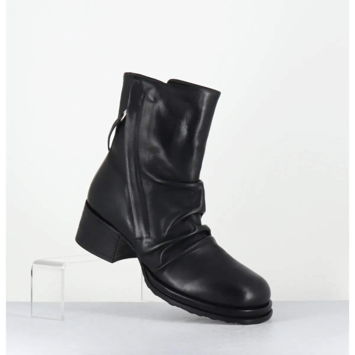 Boots en cuir noir souple, ligne Avant-garde esprit bikers avec double zip arrière, montées sur une double semelle en cuir et un talon bloc confortable