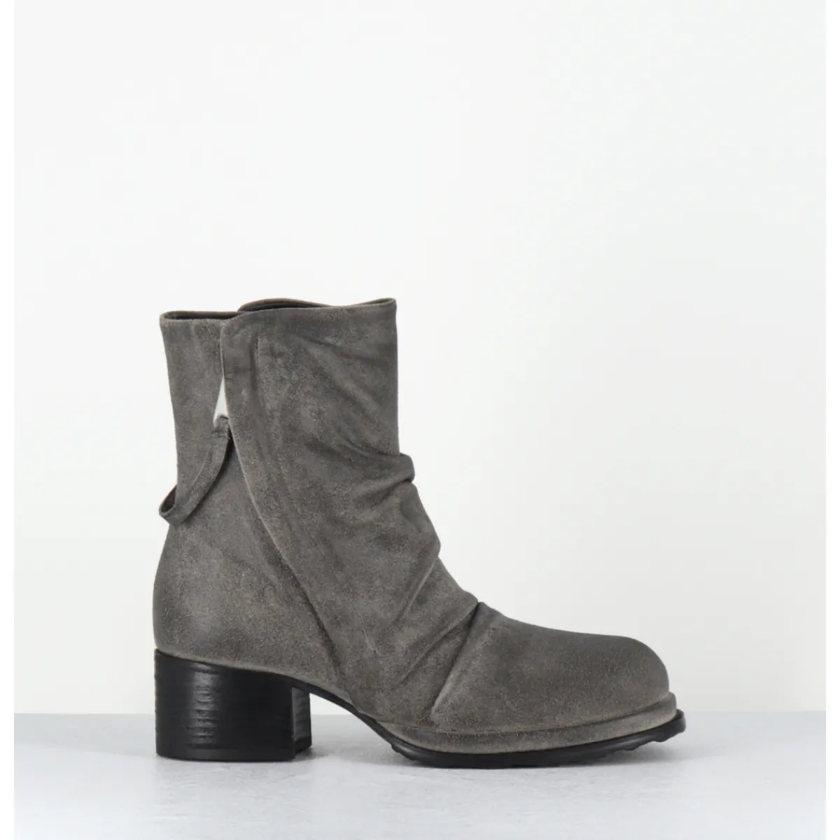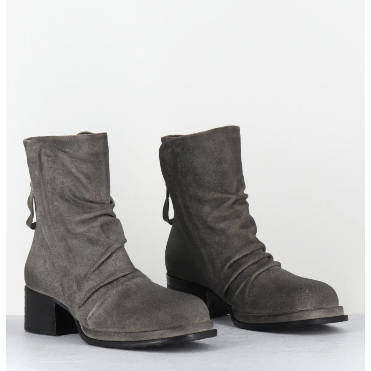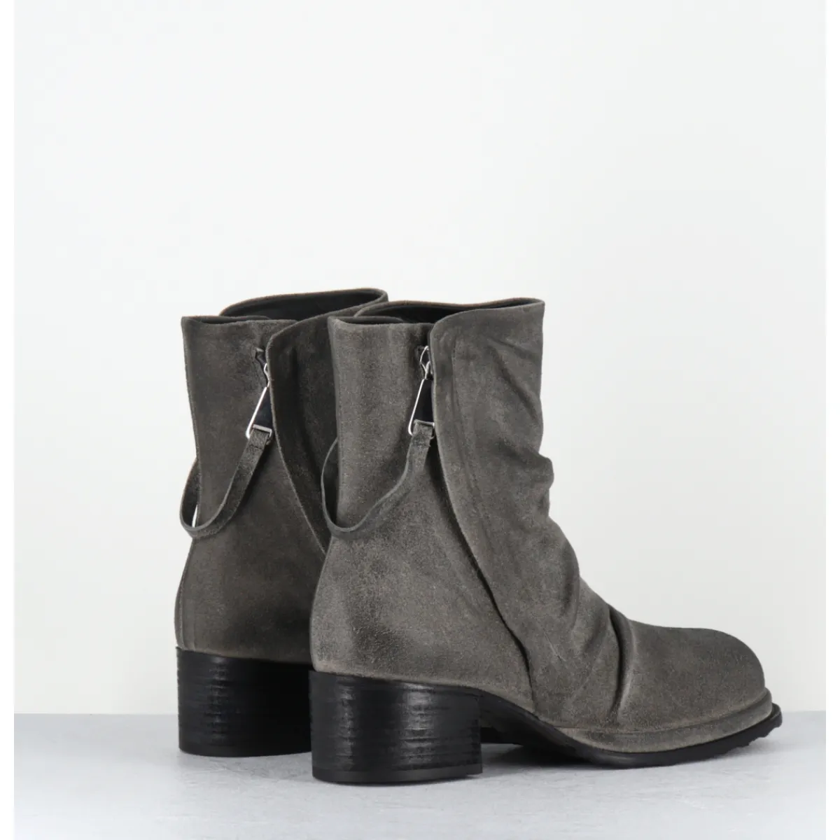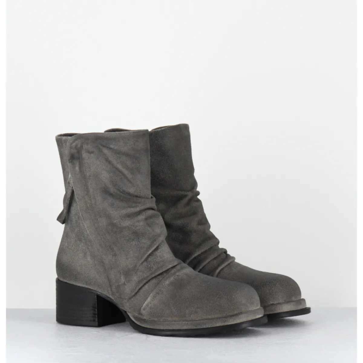 Boots en daim gras gris brossé au noir pour un effet ‘vintage’, ligne Avant-garde avec double zip arrière, montées sur une double semelle en cuir et un talon bloc confortable