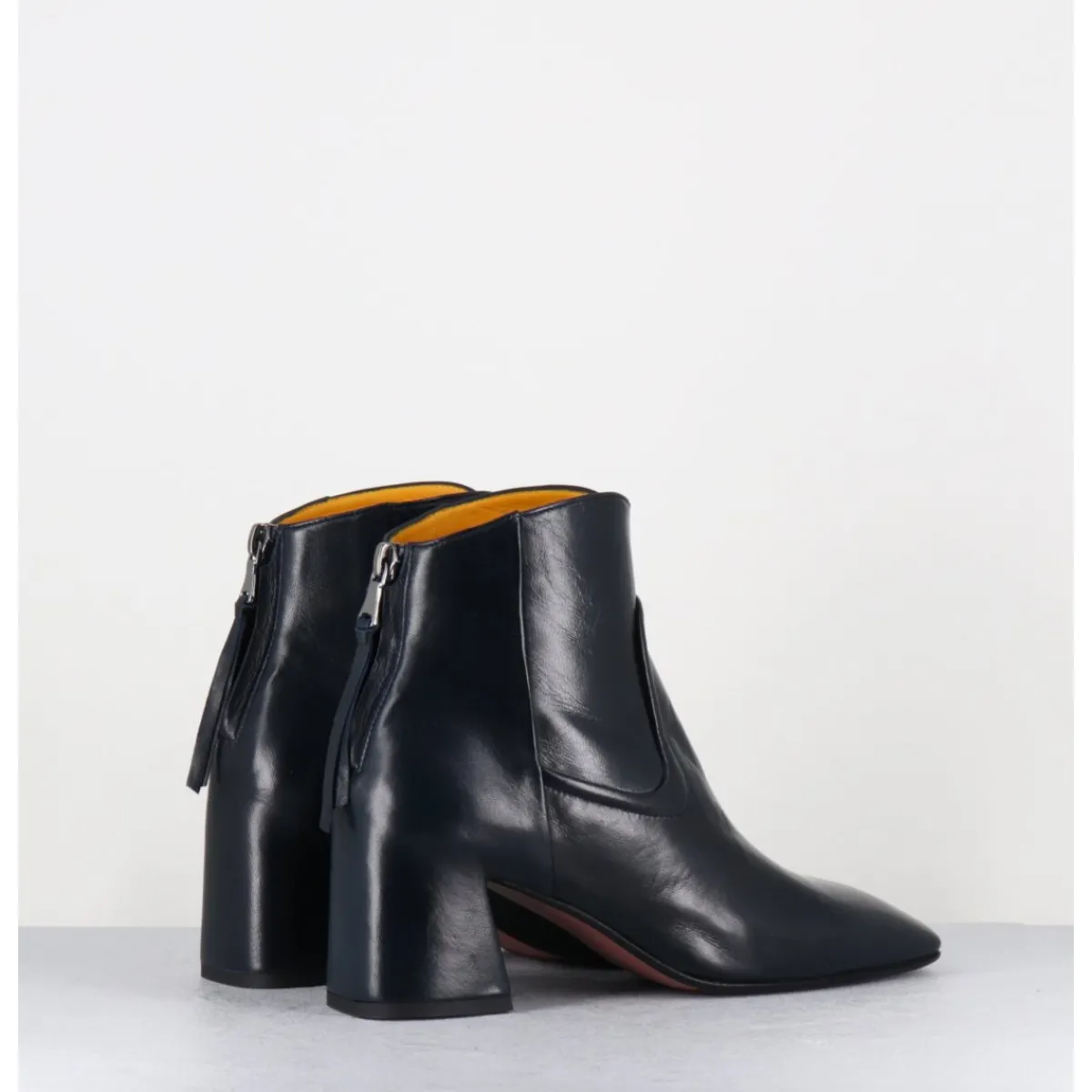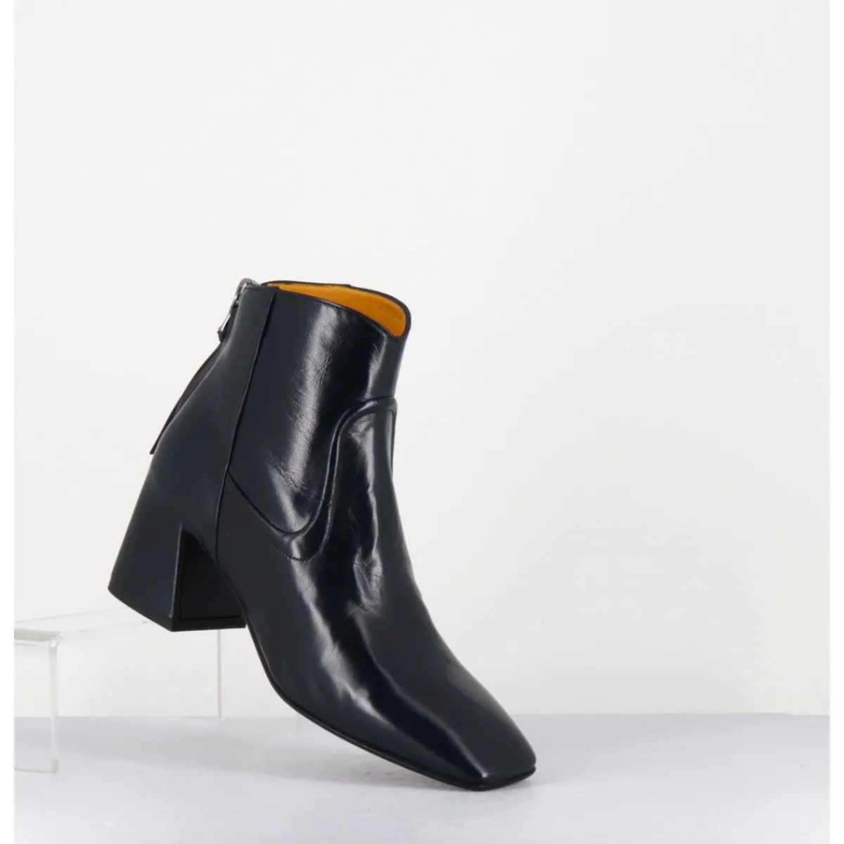 Bottines en cuir extrêmement souple bleu marine, ligne effilée à bout carré, zip arrière, montées sur un talon rétro recouvert